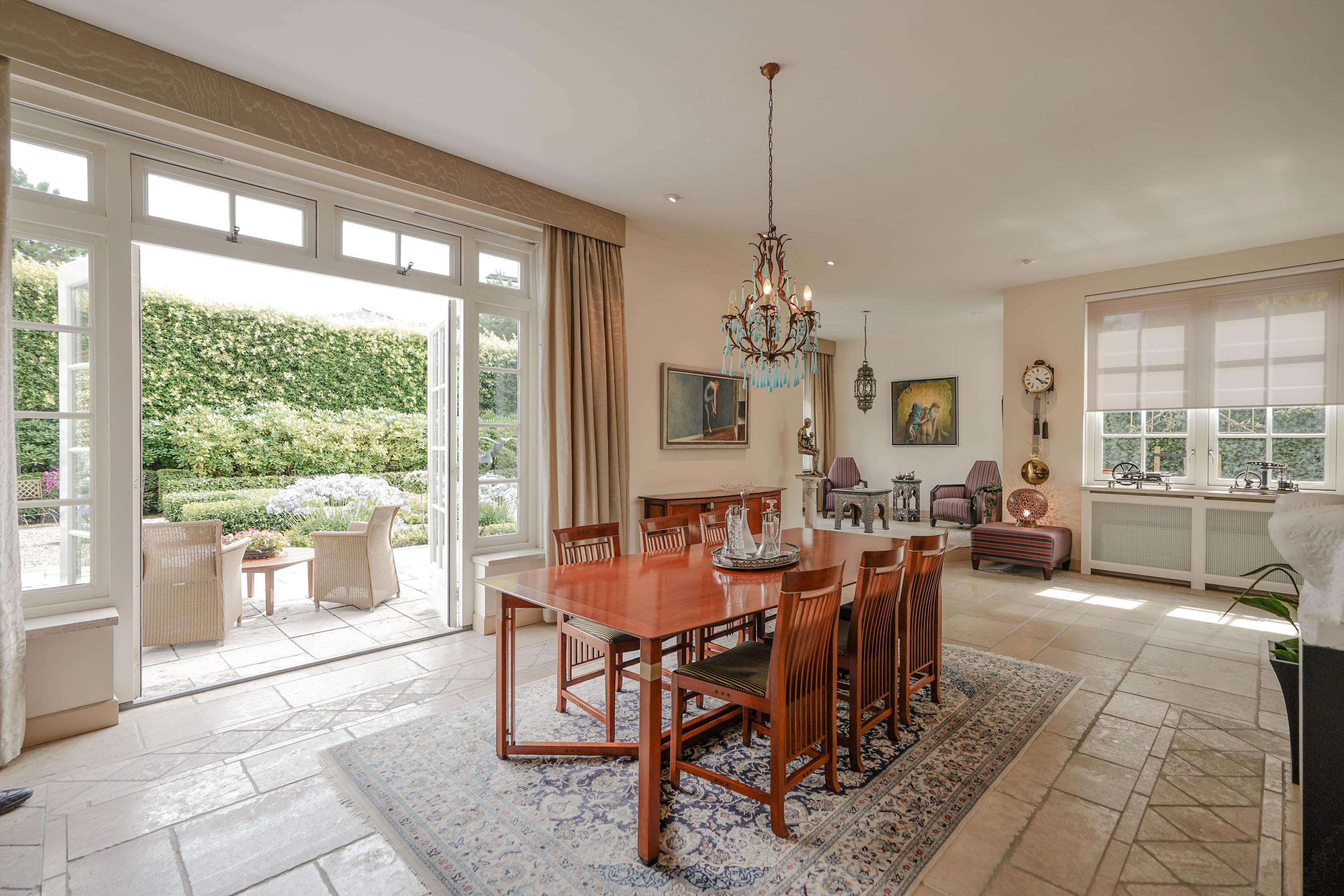 The L-shaped living room boasts a ceiling height of 3.10 meters. A bay window with a raised platform adds charm and extra space, while double French doors open to the garden. South- and west-facing windows feature sun-reflective roller blinds, and 15 recessed ceiling lights provide ambience. The grand French-style gas fireplace adds elegance.