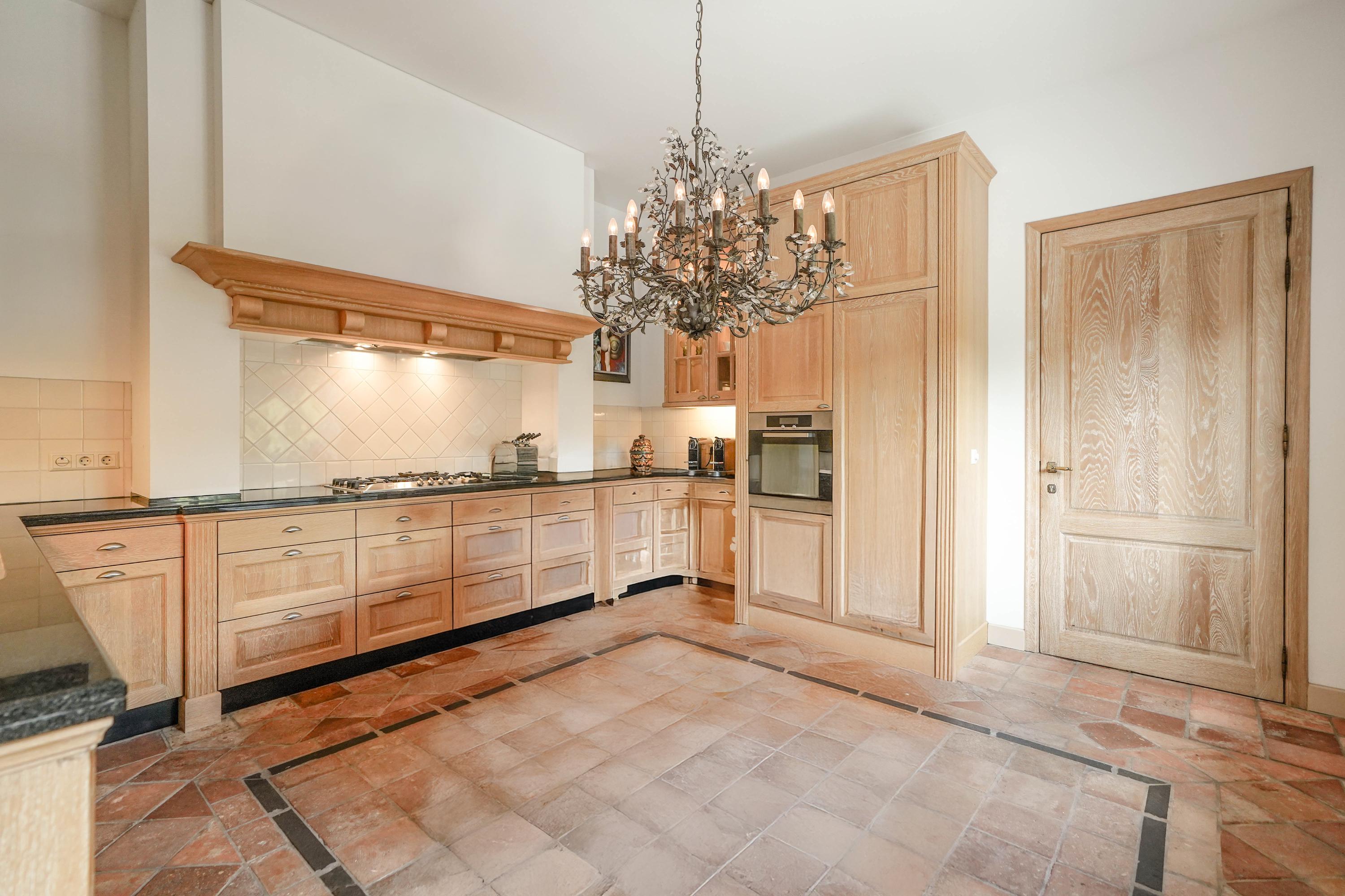 The garden-facing kitchen—accessible via an open passage from the living room—is equipped with Miele appliances and a Quooker boiling water tap. The handcrafted mantelpiece, fluted columns, polished stone countertops, and antique French floor tiles lend a rustic yet refined atmosphere.