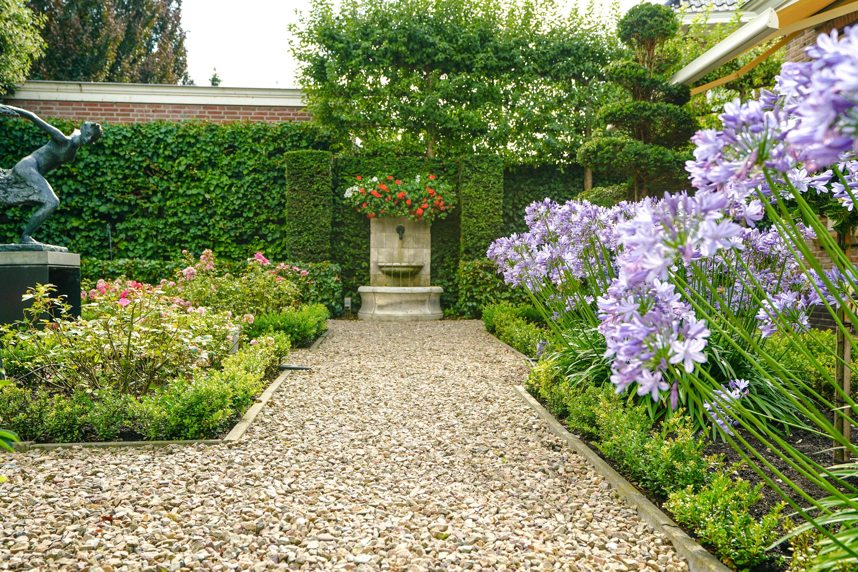The 46 m² terrace is perfect for sunbathing or entertaining. In summer, the iron gazebo becomes a floral paradise with climbing roses and hanging baskets, ideal for alfresco dining. Two fountains—a French one to the right and a smaller Italian one by the terrace—add a refreshing touch. Bronze sculptures are available separately for purchase.