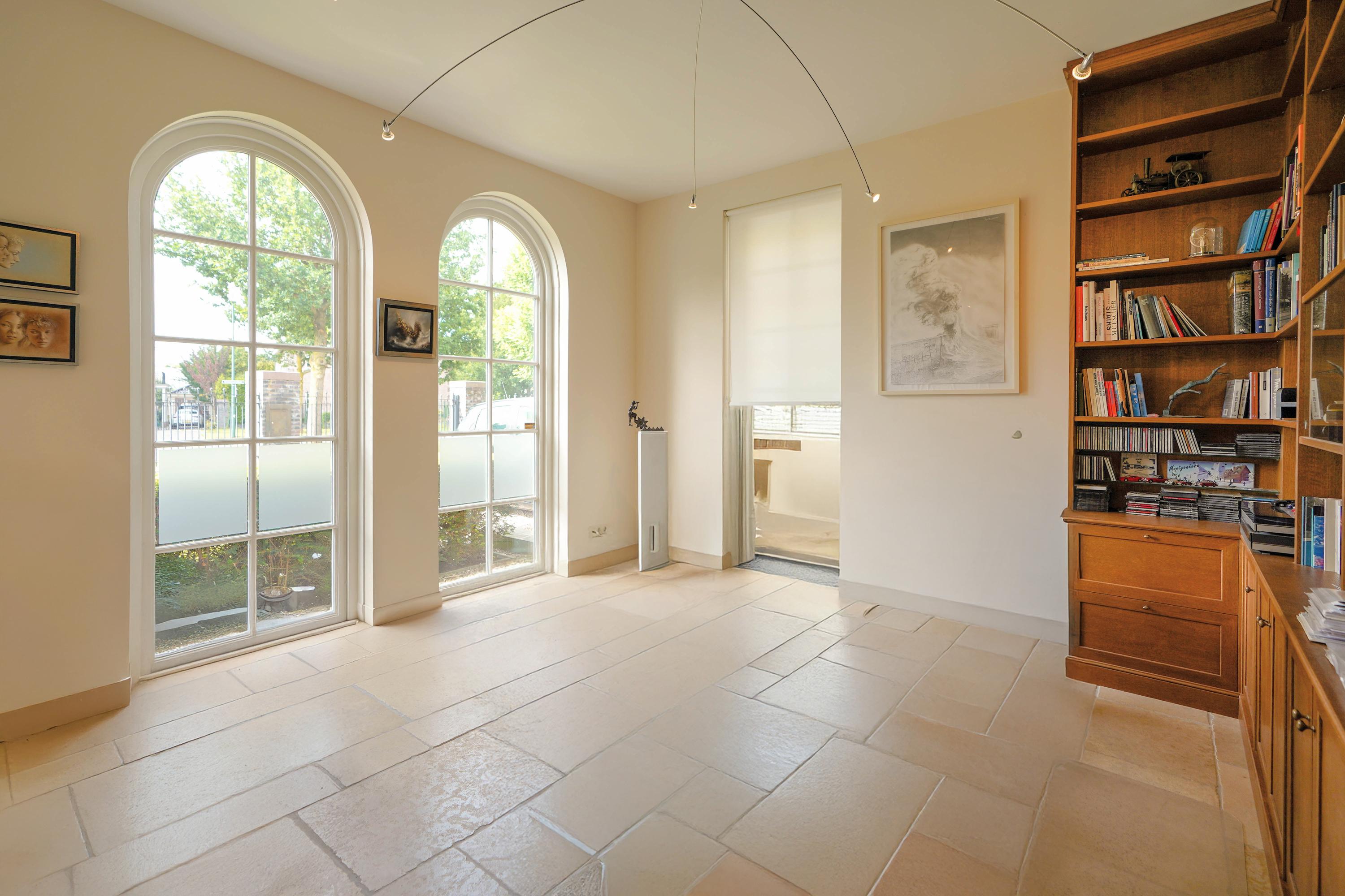Inside, the entrance hall features a beautifully sculpted oak staircase. The solid oak handrail runs in a single, uninterrupted piece all the way to the top floor, supported by 87 patinated cast iron balusters—a masterpiece by renowned Belgian staircase maker Luc Steels, who also crafted all the panel doors and frames throughout the home. The hall includes a guest toilet and the meter cupboard. A skylight above the stairwell, combined with the large glass facade, brings natural light to all floors.