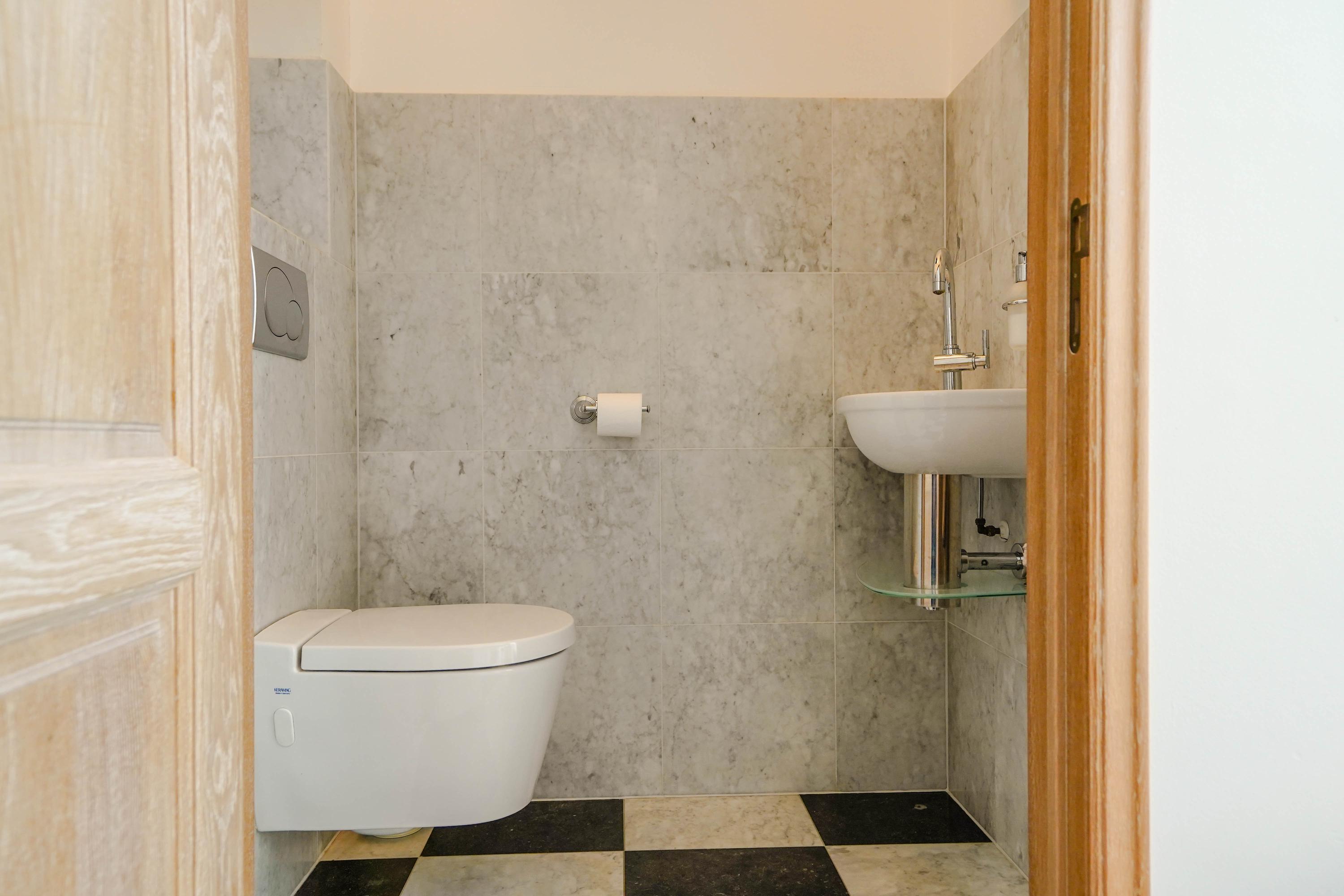 The second bathroom, which also functions as a fitness room, offers ample space for gym equipment. The walk-in shower is minimalist, with a vertical glass panel and floor drain, requiring just one surface to clean. The room connects openly with a sauna area featuring a Villeroy & Boch infrared sauna, which has never been used and is in mint condition.