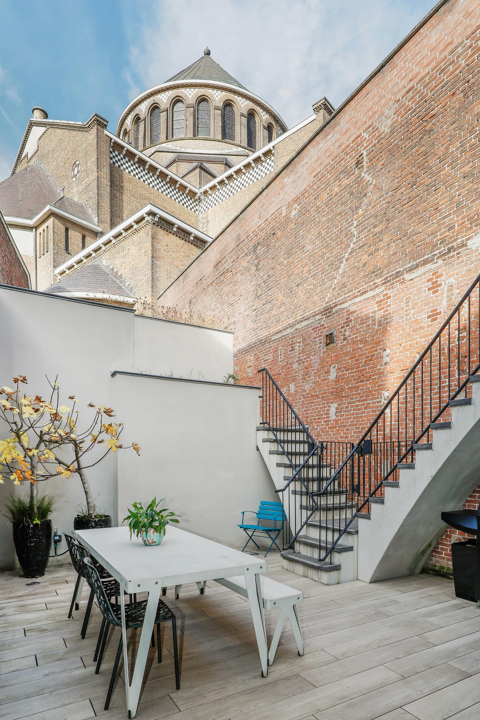 Natuurlijk kent iedereen de voorkant van de St.-Jacobskerk wel. Maar toch zal je bezoek verrast zijn door de kijk die je er van deze kant op hebt. Een verrassende kijk had de architect op dit plan. Door een enorme transparante wand te plaatsen is binnen buiten geworden en vice versa. De wand is vanuit de hoek naar twee kanten weg te schuiven. Het is overdag een heerlijk lichte plek voor een gezellige eettafel en ’s avonds eten met dit bijzondere uitzicht. De lange kastenwand maakt wederom je huis heel praktisch en smaakvol. Ook aan de hoeveelheid buitenruimte biedt deze woning meer dan gebruikelijk in de binnenstad. Naast een flinke binnentuin zijn er twee dakterrasjes. Zelf kiezen dus voor zon, schaduw, boek lezen, samen nog een wijntje of lekker buiten dineren.