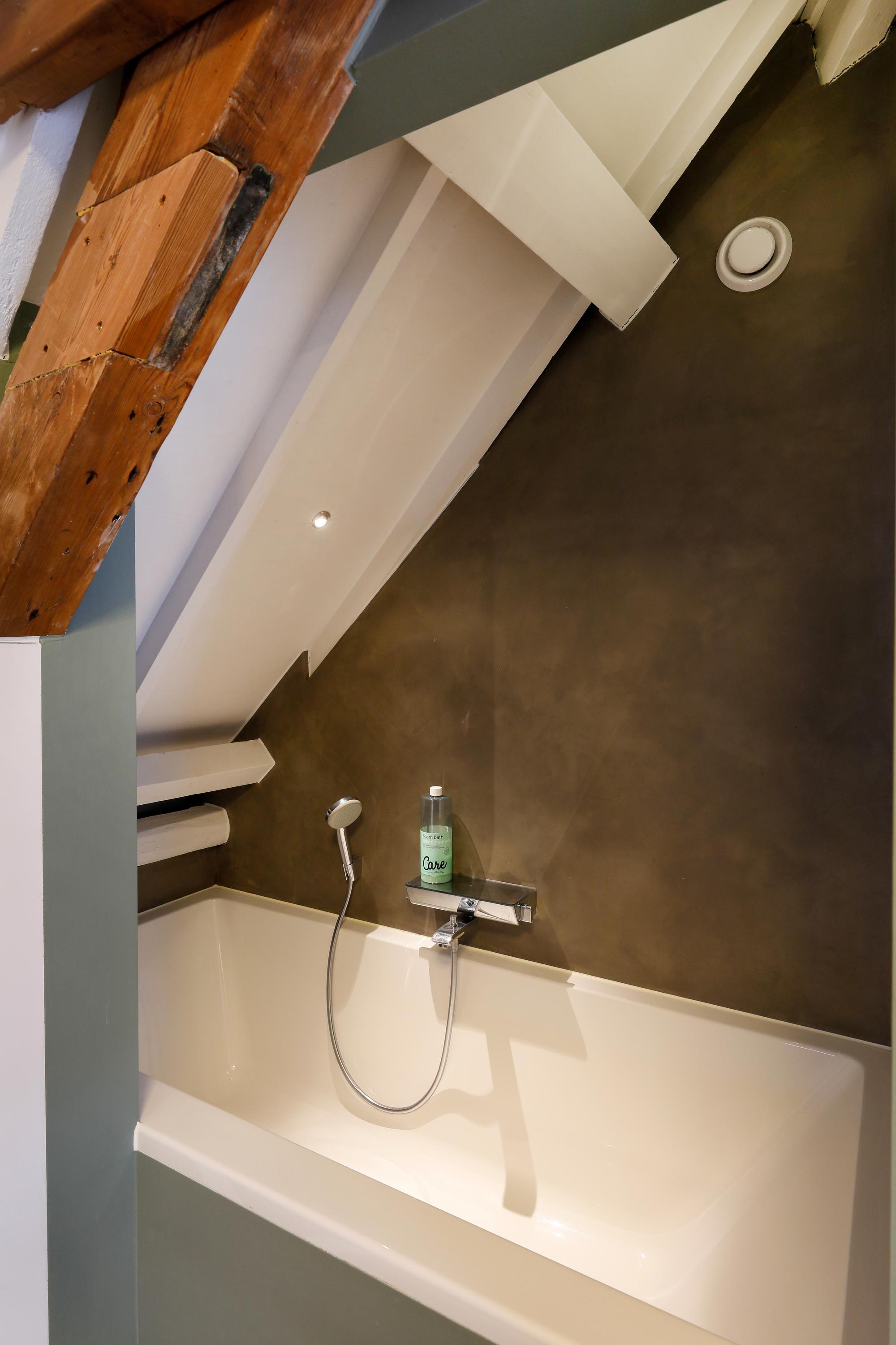 De hele tweede verdieping heb je hier voor jezelf. Onder de sfeervolle spanten is er een grote slaapkamer met badkamer en suite. In de ca 8 meter lange kamer is ruimte voor een bed, een zitje bij de dakkapel en een lange vaste kast onder de schuine kant. Ook hier ligt dezelfde lamelparketvloer als op de eerste etage. Omdat de badkamer exclusief voor deze kamer is, kon de wastafel op een kopse kant geplaatst worden. Het bad is slim in de schuine kant geplaatst en het toilet en de douche vind je aan de andere kant van de wastafel. Achter deze badkamer is een verrassende berging voor je zomer-/wintergarderobe.