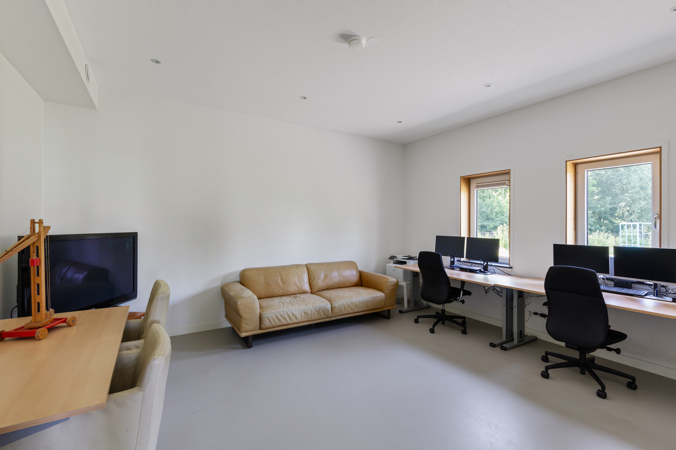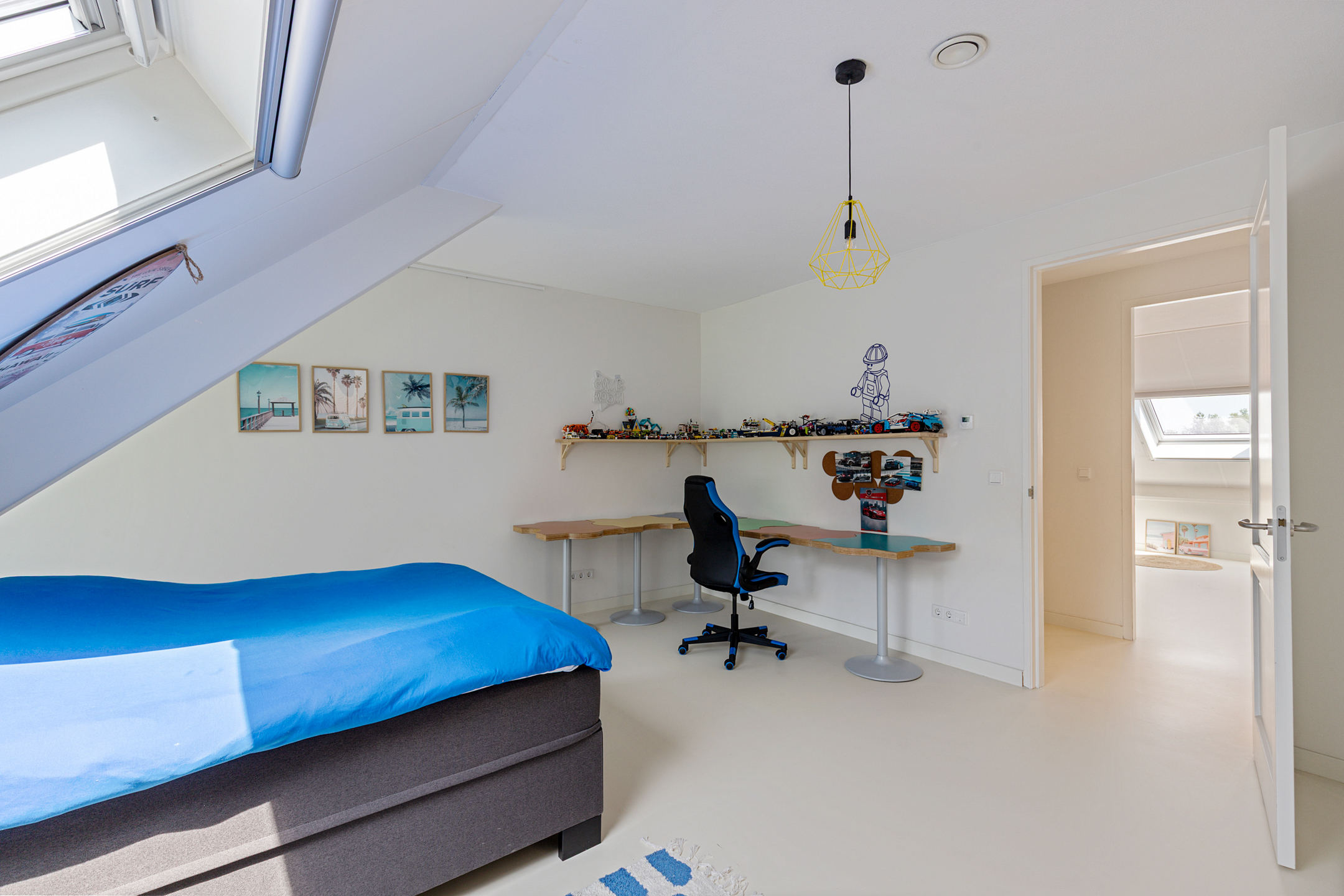 Grenzend aan de woonkamer bevindt zich een kantoor- of speelkamer met zicht op de tuin. De ruime bijkeuken is praktisch ingedeeld en voorzien van witgoedaansluitingen.