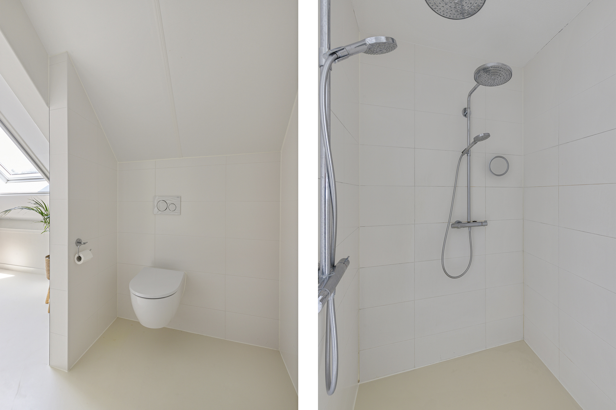 De master bedroom is een ware privésuite (46m2) met panoramisch uitzicht op het water via kamerhoge ramen in het zinken risaliet. Een extra dakkapel biedt zicht op het naastgelegen natuureiland. De luxe en-suite badkamer is voorzien van een vrijstaand ligbad, dubbele wastafel, toilet en inloopdouche. Hier wakker worden geeft elke dag energie.