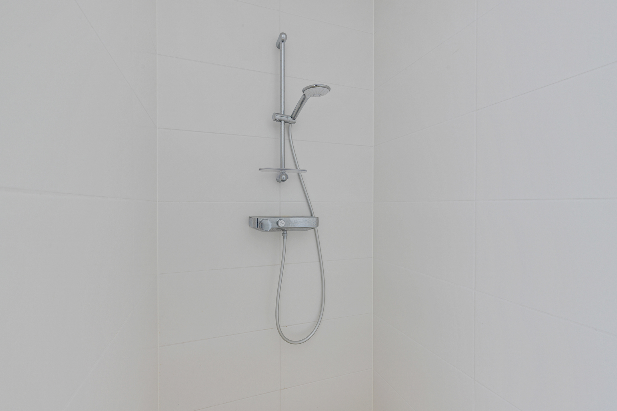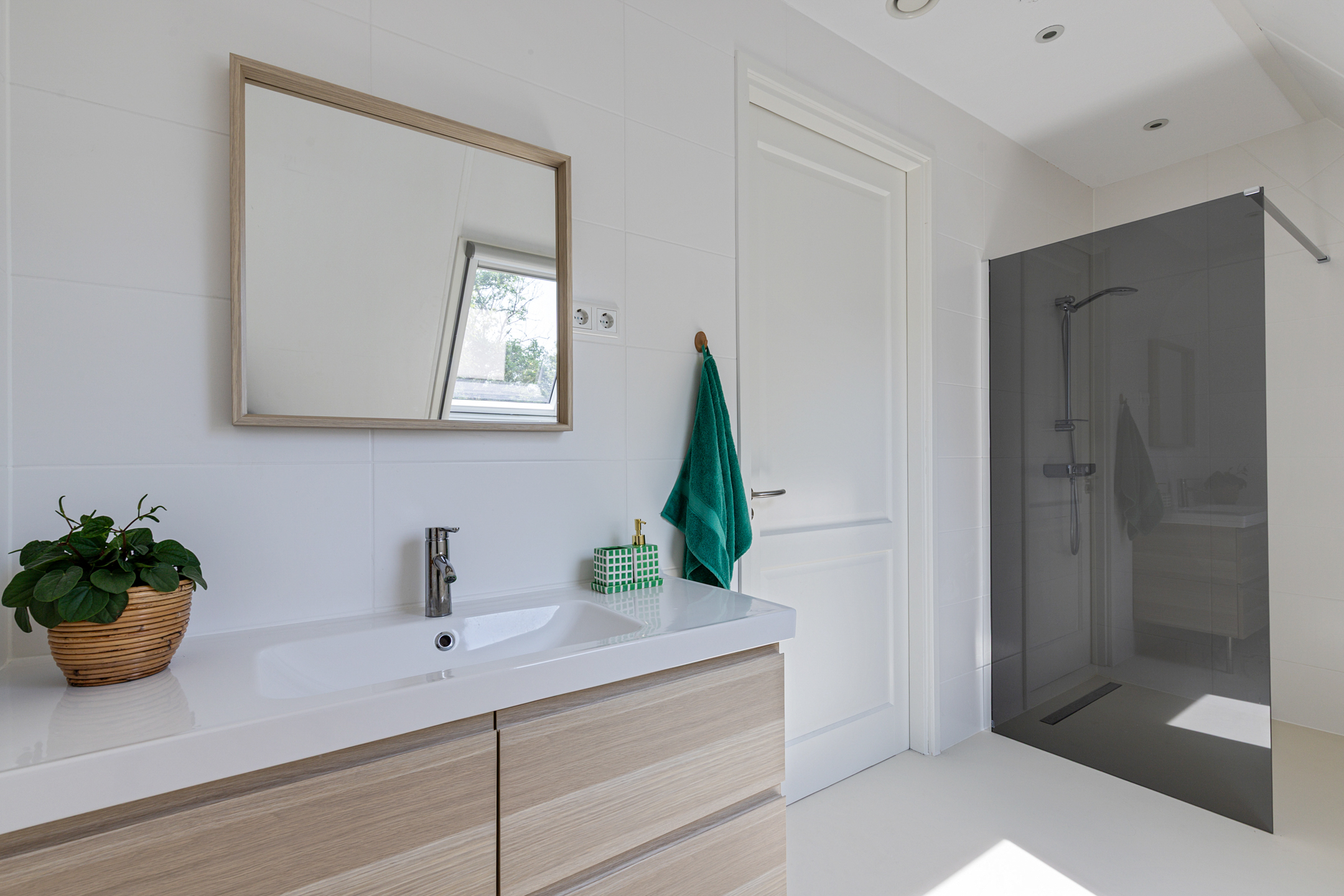 Twee slaapkamers beschikken over een eigen en-suite badkamer; twee andere slaapkamers delen een badkamer. De badkamers zijn modern en stijlvol ingericht met inloopdouche, wastafelmeubel en toilet.