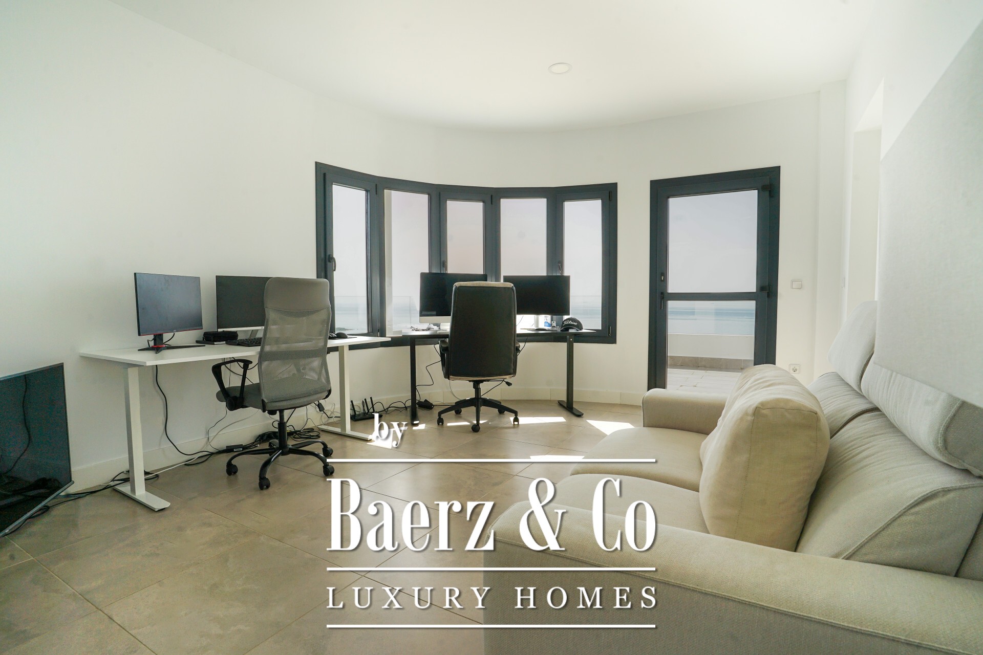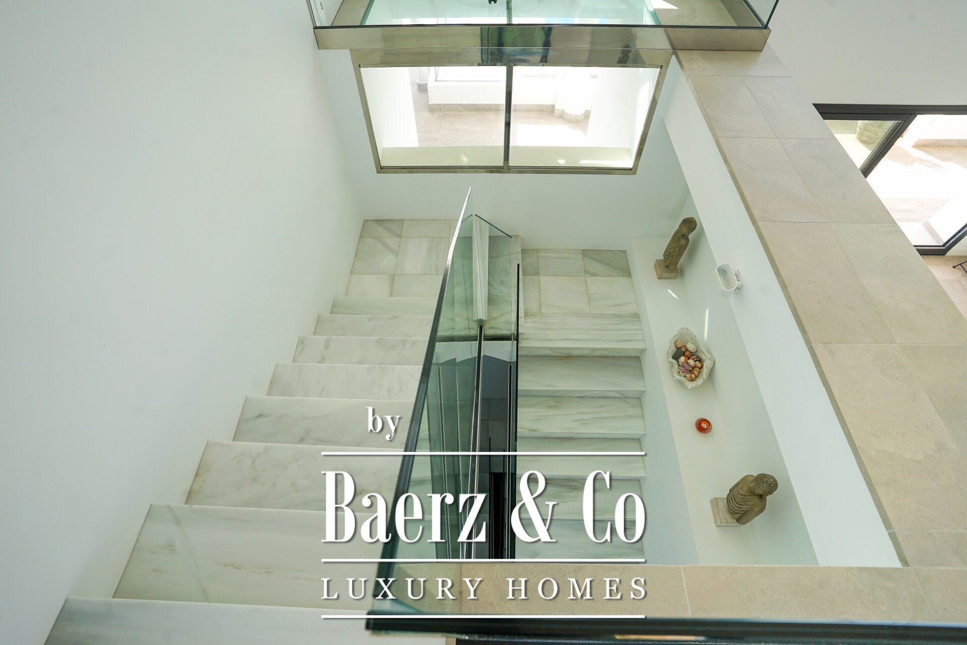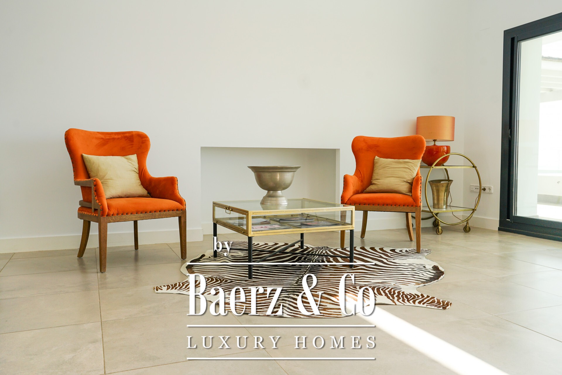 De belangrijkste leefruimtes zijn open en verbonden, met kamerhoge glaspartijen die de royale lounge en eetruimte verbinden met overdekte buitenzones. Een elegante, volledig uitgeruste keuken met hoogwaardige apparatuur grenst aan een buitenbarbecue, terwijl een aparte tv-kamer, privé gym, stoombad en kantoor bijdragen aan optimaal wooncomfort. Vier slaapkamers en vijf badkamers, waarvan drie en suite, bieden flexibiliteit en privacy; het kantoor kan eenvoudig als vijfde suite dienen.