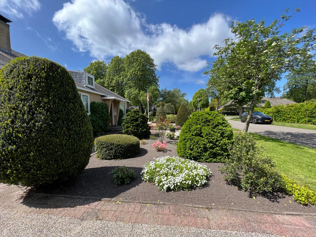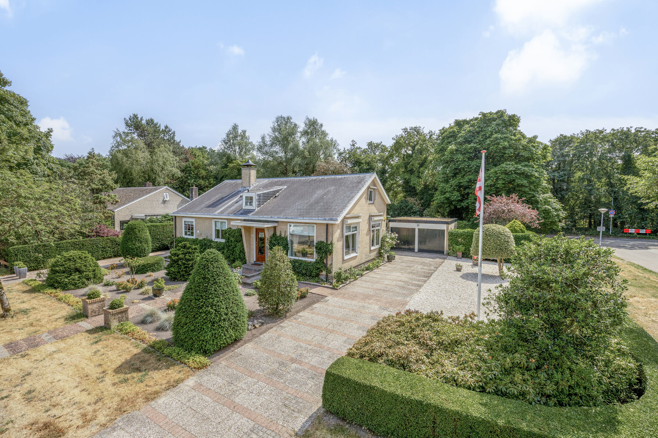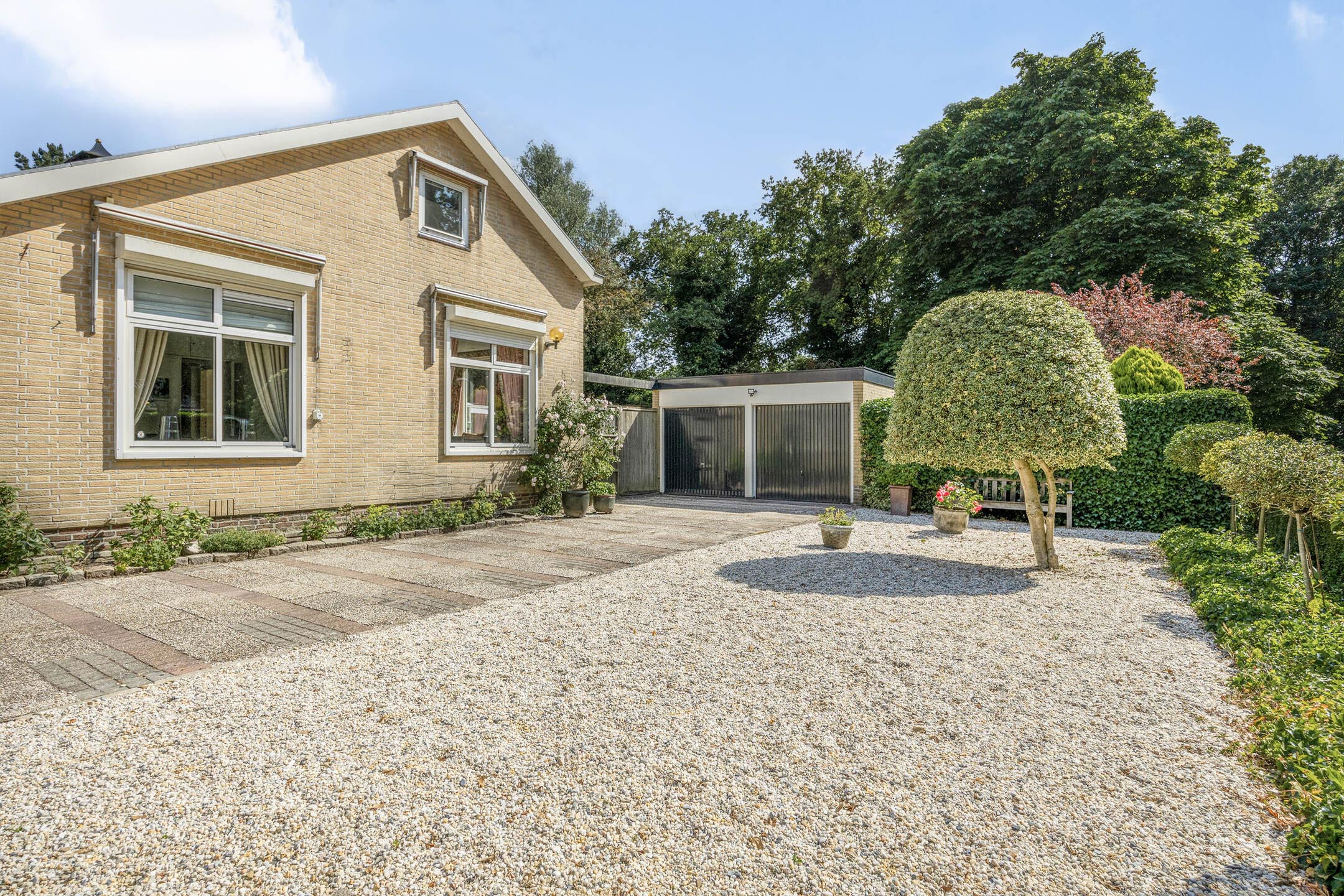 De riante oprit biedt plaats voor meerdere auto's, naast de vrijstaande dubbele garage en een weelderige voortuin.
