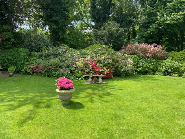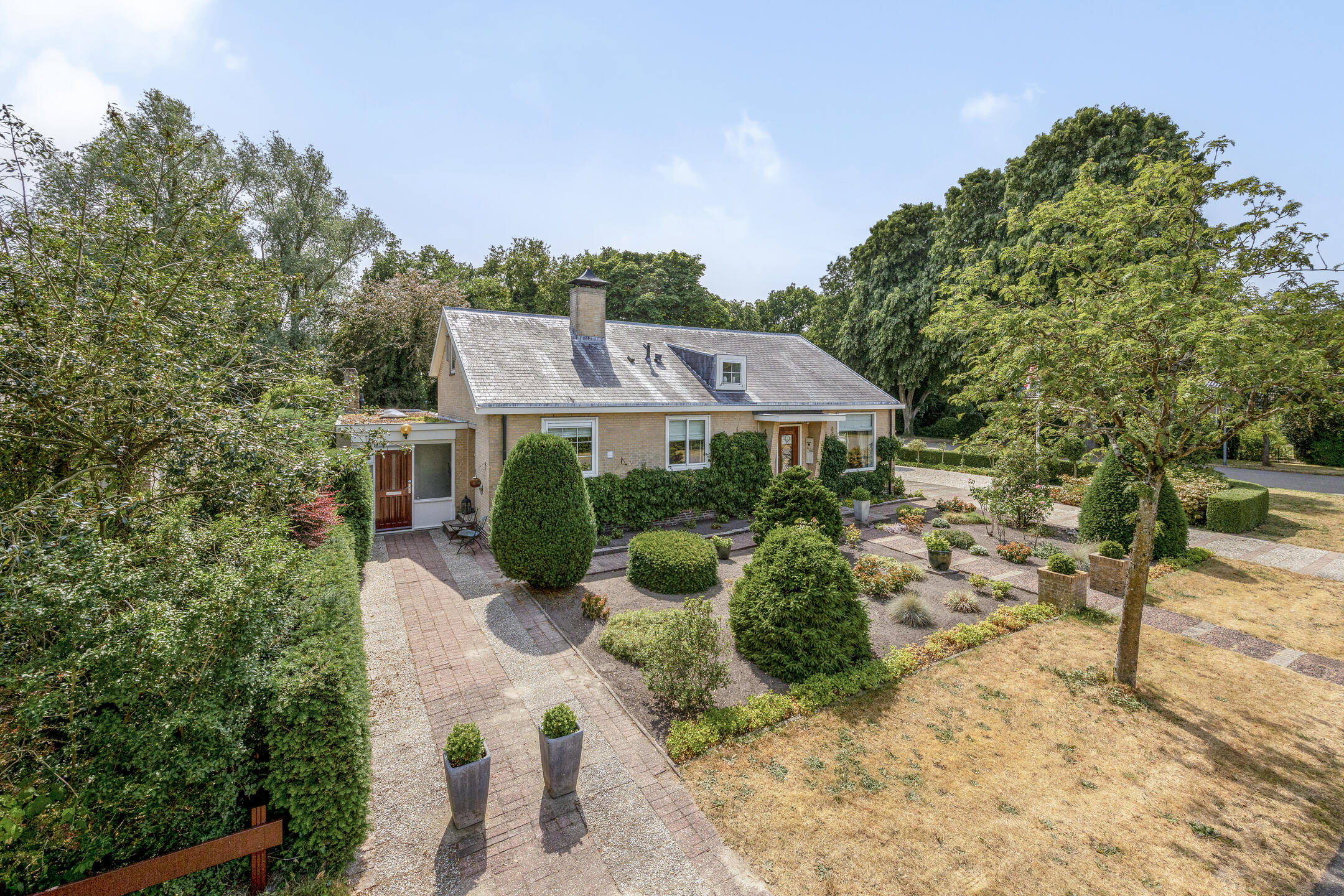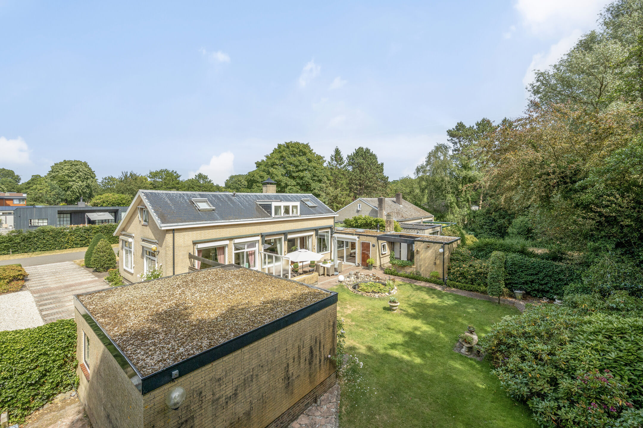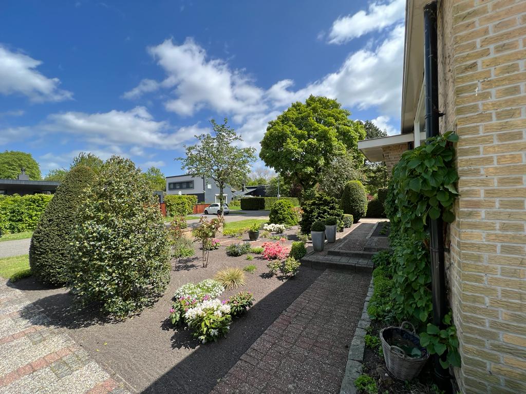 De riante oprit biedt plaats voor meerdere auto's, naast de vrijstaande dubbele garage en een weelderige voortuin.