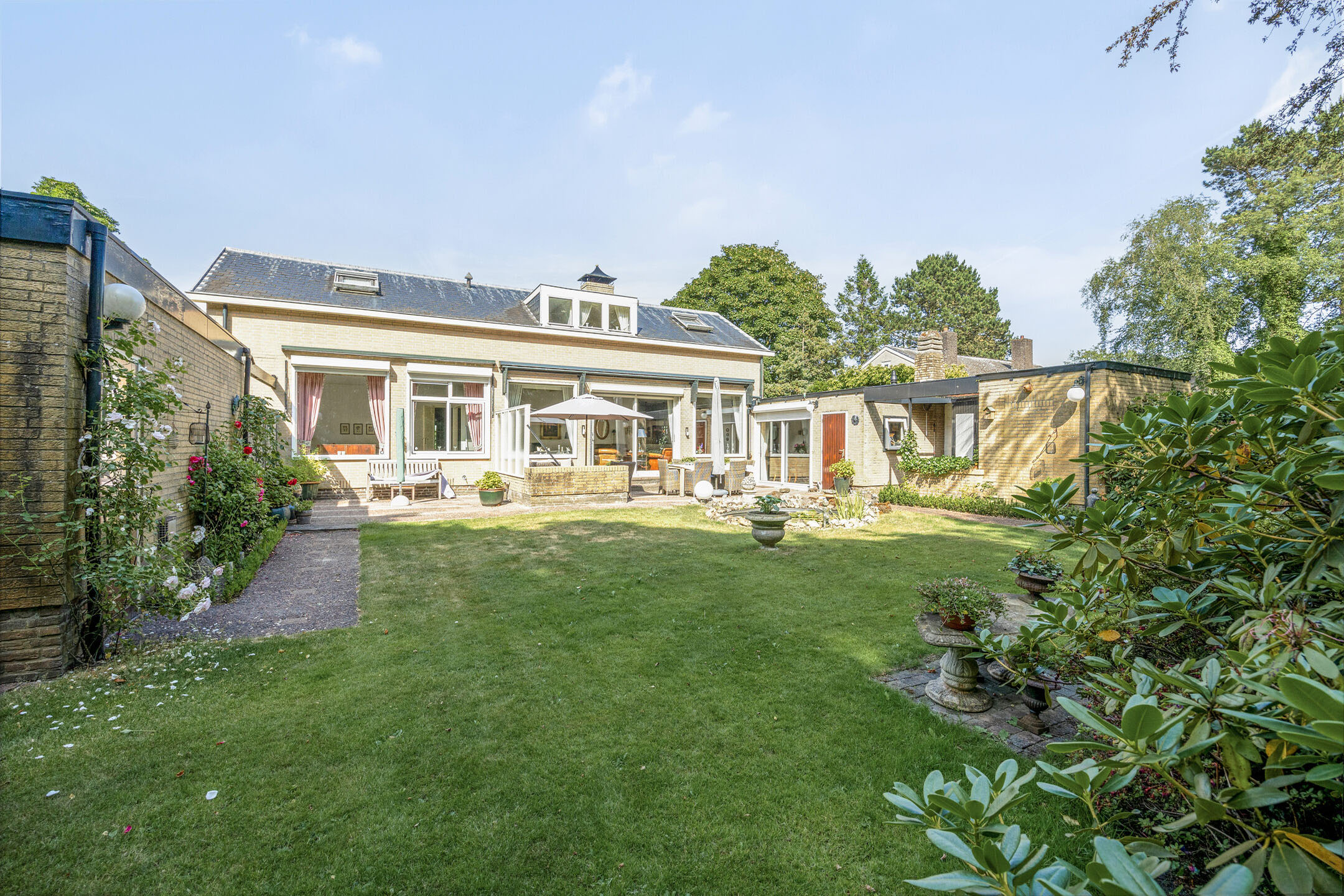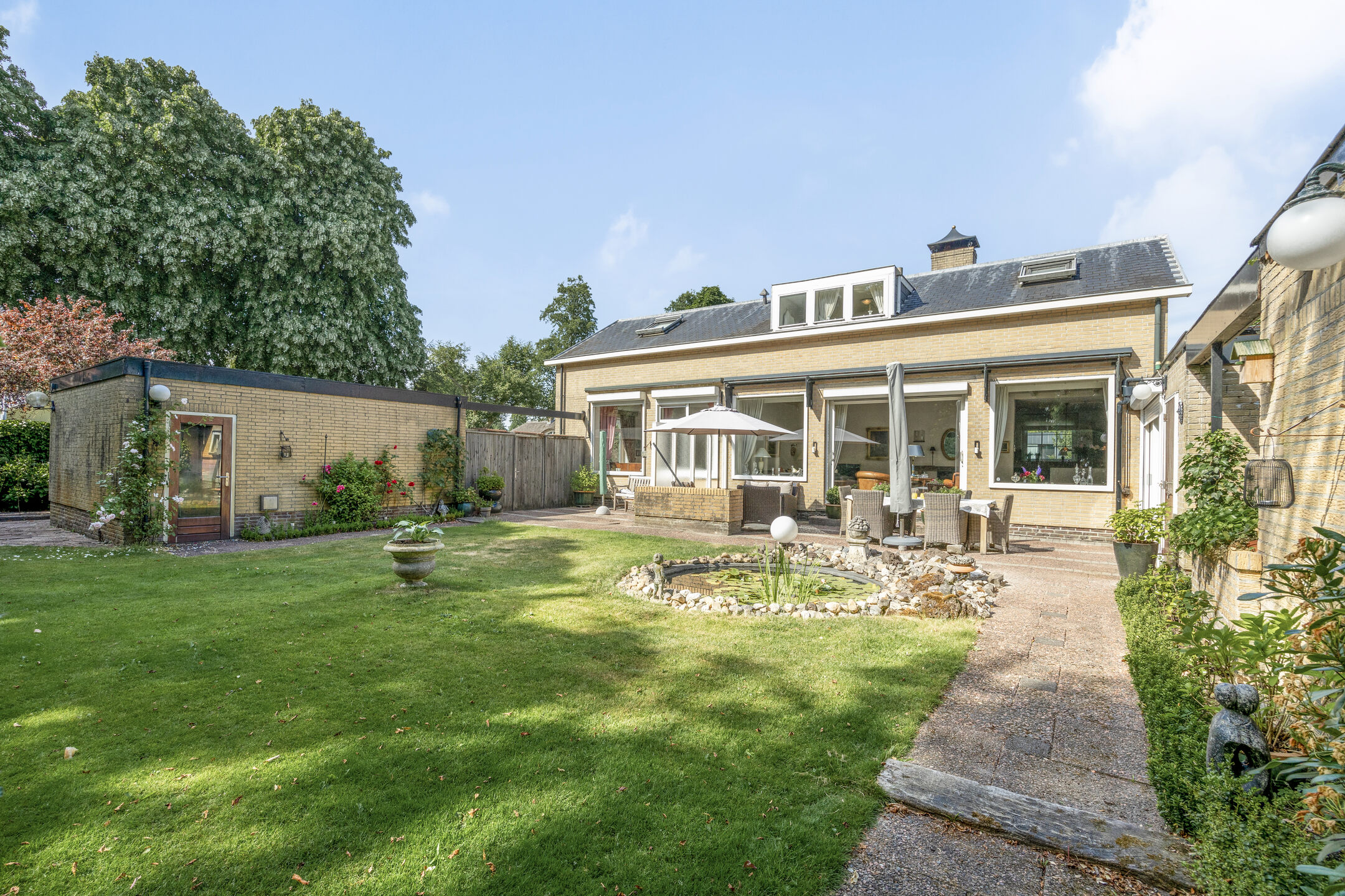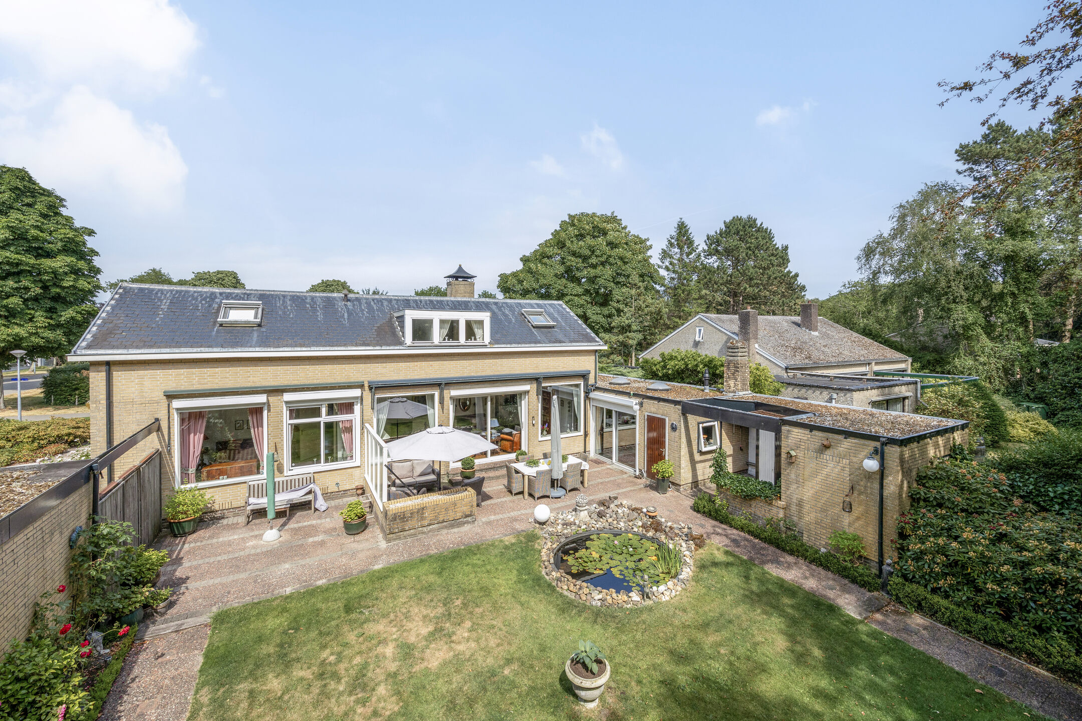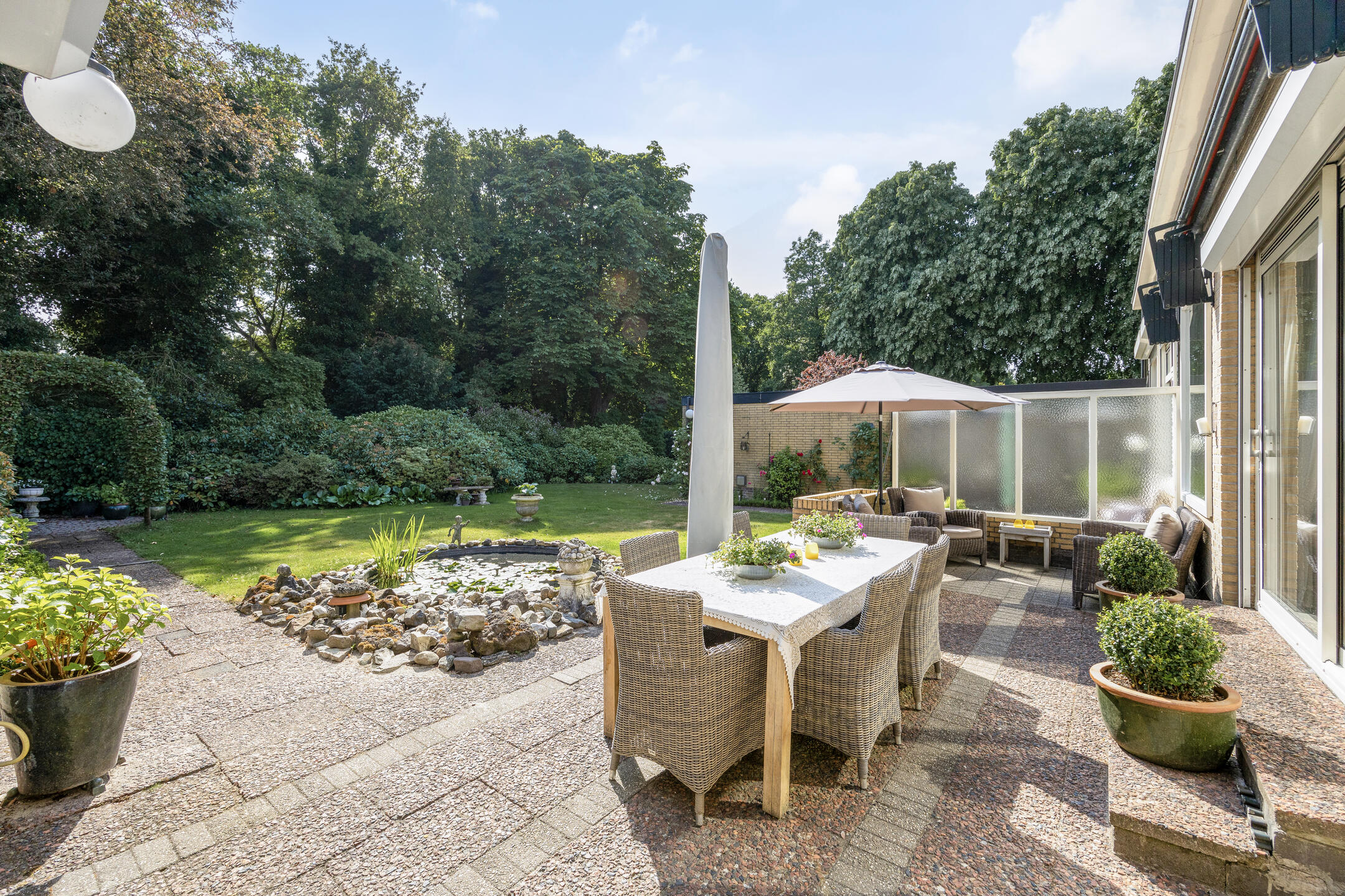 Bij binnenkomst een royale woonkamer met aparte eetkamer, word je meteen omarmd door de lichtheid die de talrijke ramen brengen. De riante schuifpui in de woonkamer opent de deur naar een ruimtelijk panorama, waar een weelderige aangelegde tuin zich uitstrekt. Het zonovergoten terras, met tuinverlichting en een vijverpartij, biedt een serene uitnodiging tot ontspanning. De omringende groene oase waarborgt totale privacy. De tuin, met zijn bronbemaling en sproei-installatie, wordt liefdevol onderhouden.
