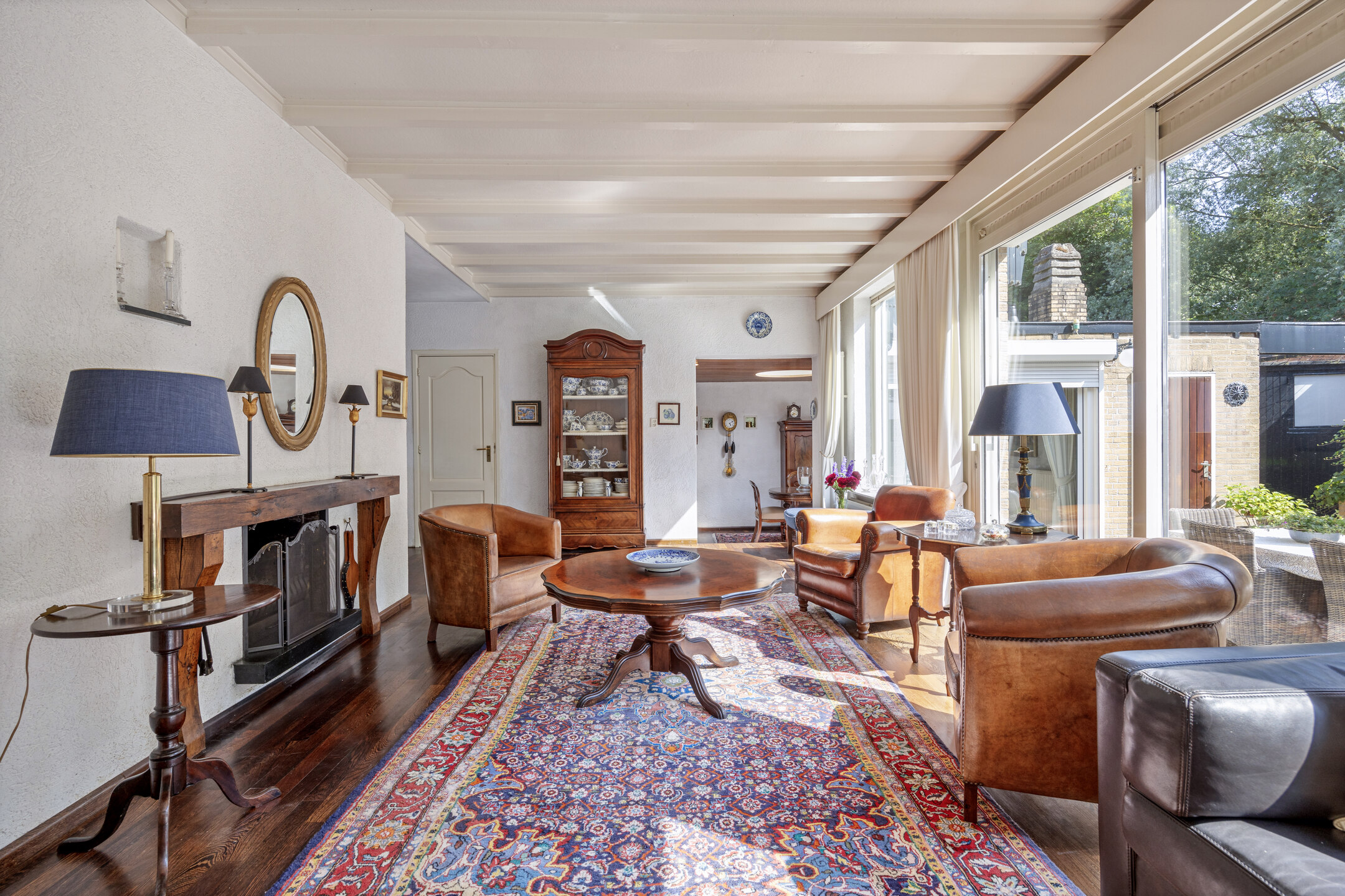 De living is voorzien van een fraaie panga-panga parketvloer, een openhaard en een schuifpui naar het grote zonneterras op het zuidwesten.