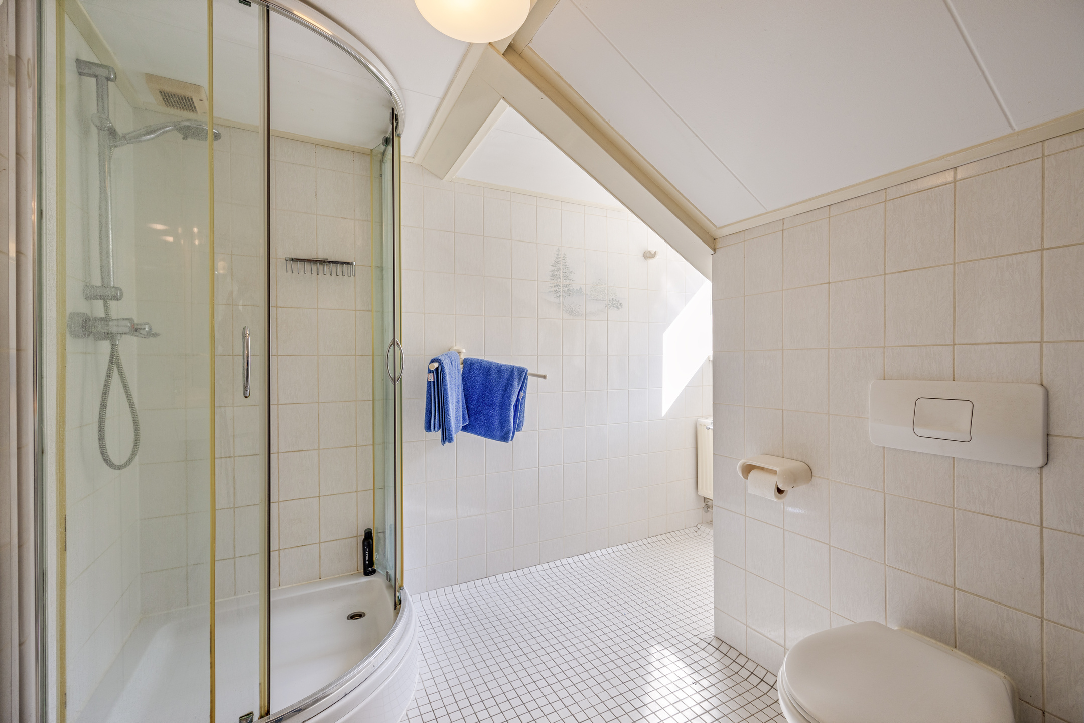 De badkamer is voorzien van een douchecabine, wastafel met ombouw, 2e wc wandcloset, lichte betegeling en een kunststof dakkapel.