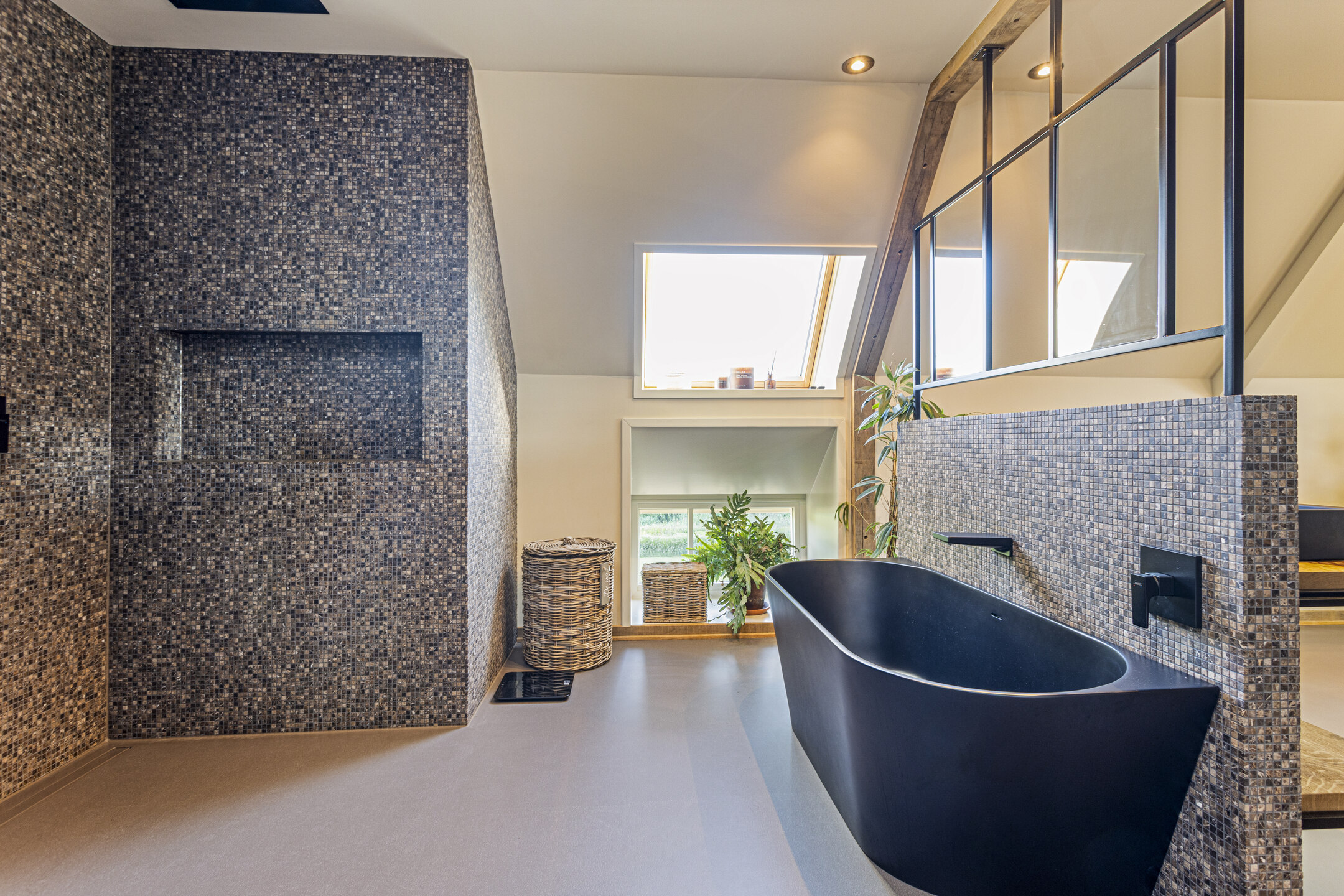 De grote slaapkamer is te bereiken middels de badkamer: met de allure van een exclusief resort, is deze voorzien van een dubbele douche met regendouche, een vrijstaand bad met uitzicht op de tuin, en een grote dubbele wastafel.