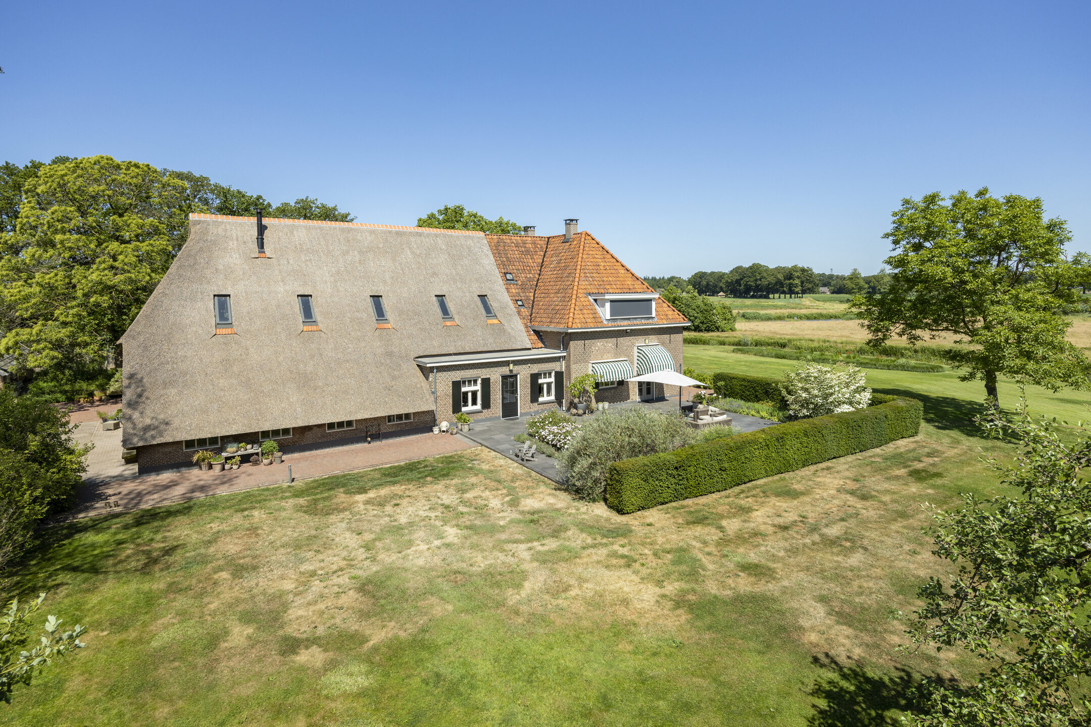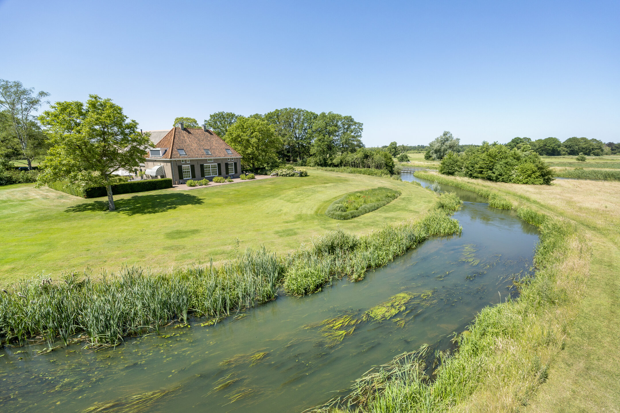 Na een lang leven – eeuwenlang – werd in 2011 deze fraaie hoeve omgebouwd tot een hoogwaardig afgewerkt en optimaal verduurzaamd woonhuis. Omdat de agrarische bestemming eraf ging, werd ook landschappelijk de omgeving anders ingevuld. Zo besloot men destijds om de historische gracht in ere te herstellen en weer rondom het huis te leiden.