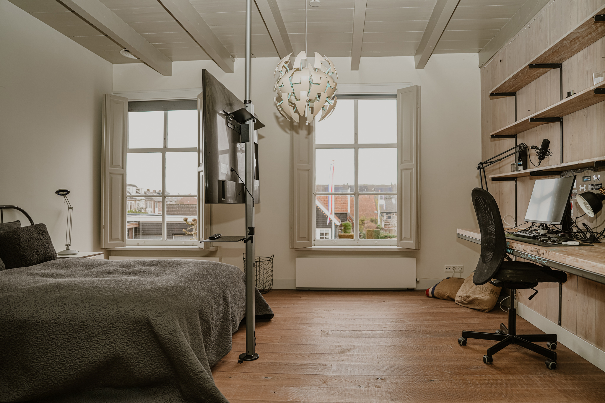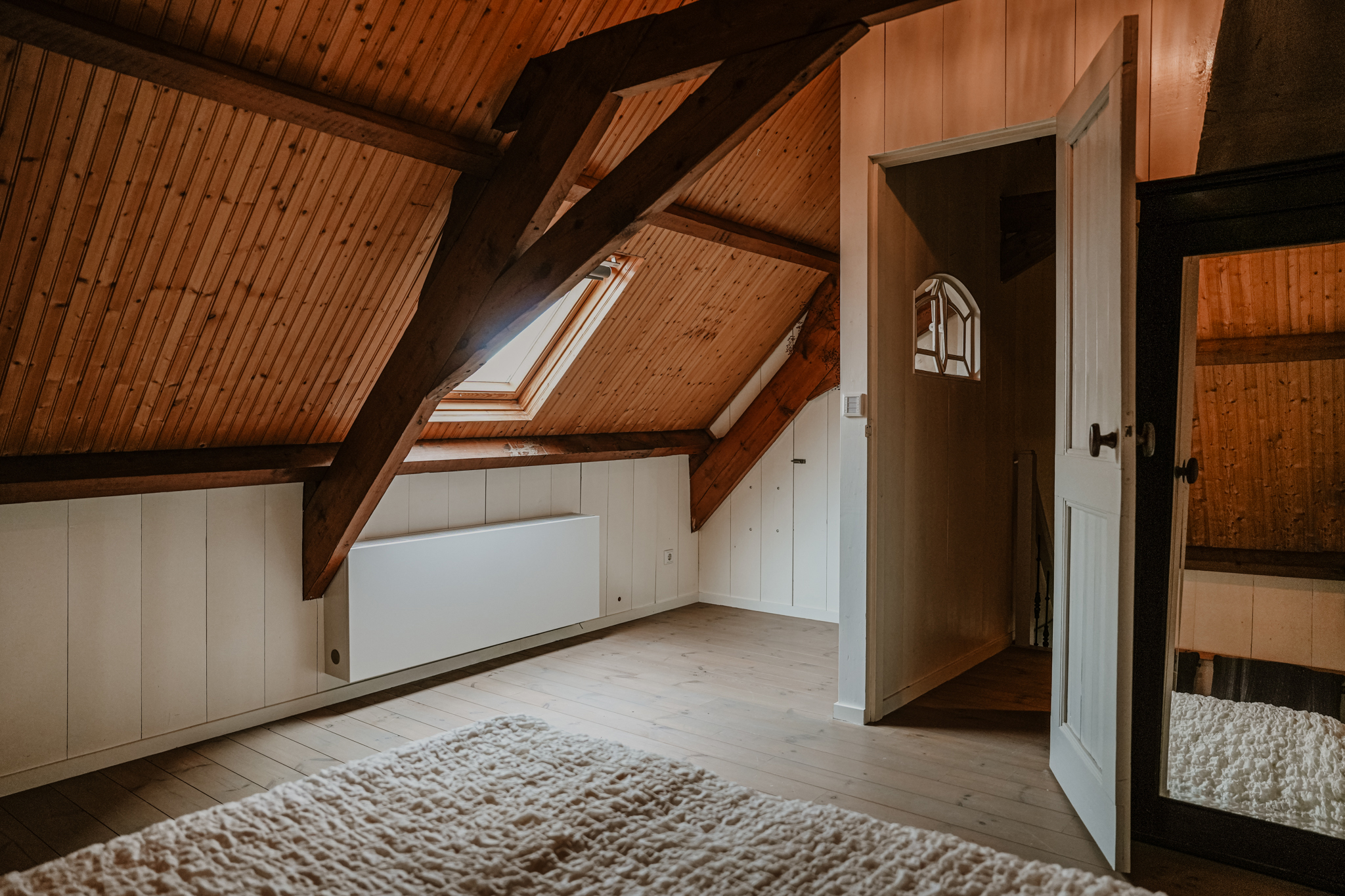 Vanaf de overloop is toegang tot een 5e slaapkamer en zolder. De slaapkamer is gelegen onder de geïsoleerde kap en voorzien van een Velux dakvenster en bergruimte. De zolder bevindt zich onder de imposante kap met een nokhoogte van 4.15 meter. De zoldervloer is geïsoleerd, zodat de ondergelegen slaapkamers heerlijk comfortabel zijn. De zolder zou zich door na-isolatie uitstekend lenen als atelier of hobbyruimte.