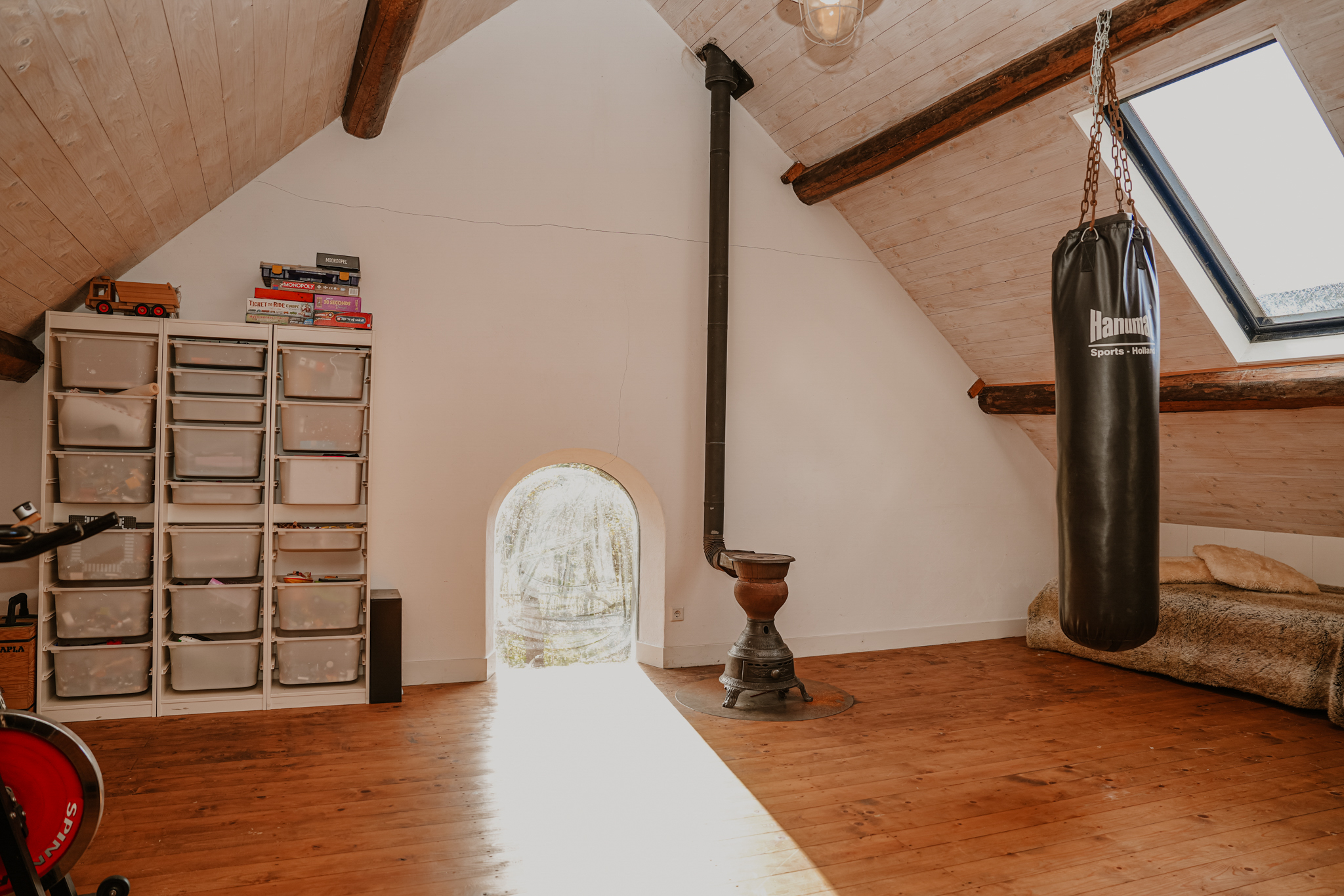 In het achterhuis bevindt zich onder de geïsoleerde kap een 4e slaapkamer die momenteel in gebruik is als sportkamer. In de kamer bevindt zich een grote traditionele sauna en een trap die uitkomt in de eetkamer. Aan de overloop is een 2e badkamer met grote inloopdouche en luxe wastafelmeubel.