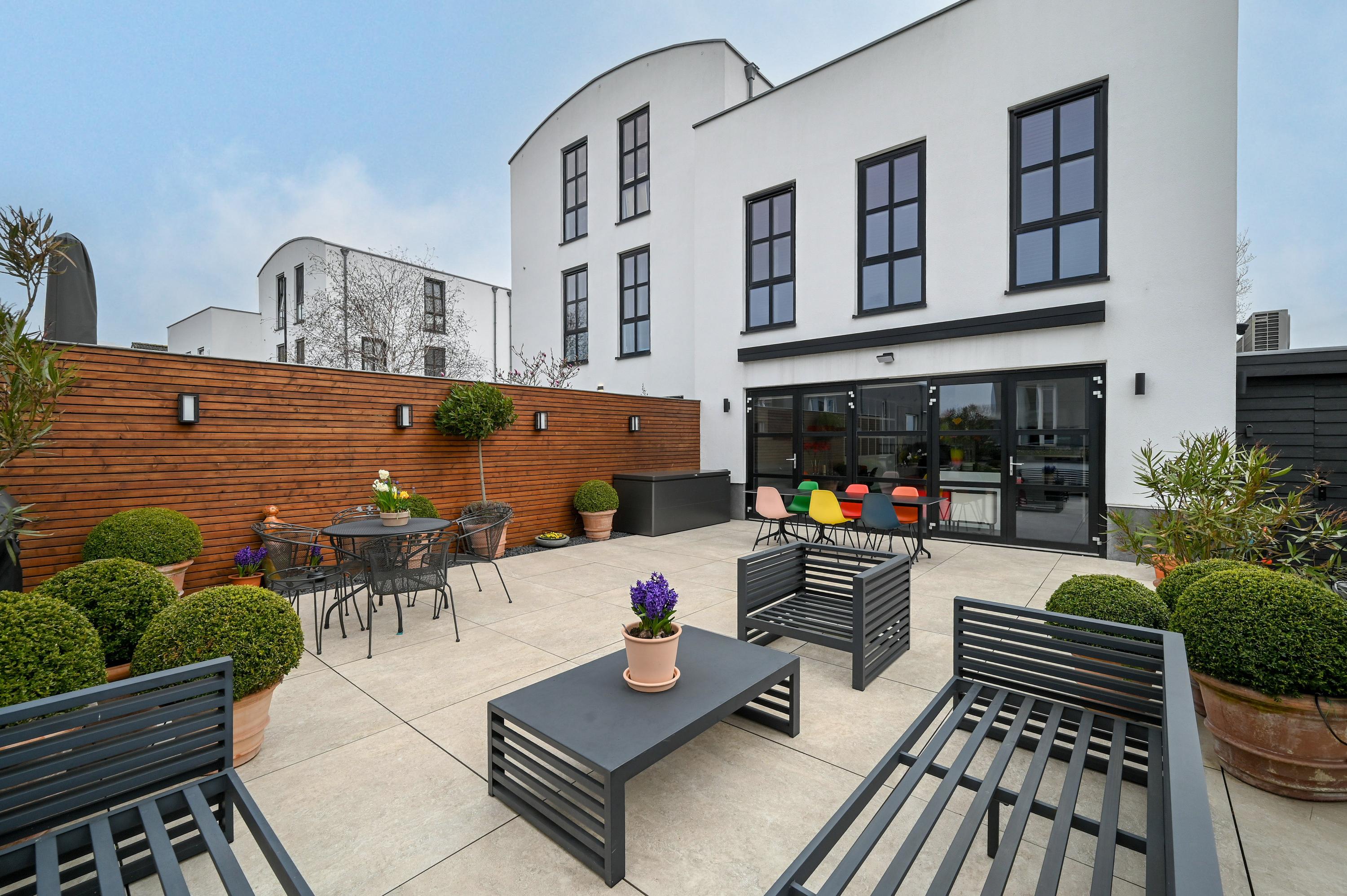Het terras is volledig betegeld met grote, lichte tegels en omlijst met verzorgde beplanting langs de randen. Dankzij subtiele tuinverlichting ontstaat hier een stijlvolle en uitnodigende buitenruimte, waar u zowel overdag als ’s-avonds van het buitenleven kunt genieten. Het elektrische zonnescherm zorgt voor schaduw wanneer nodig.