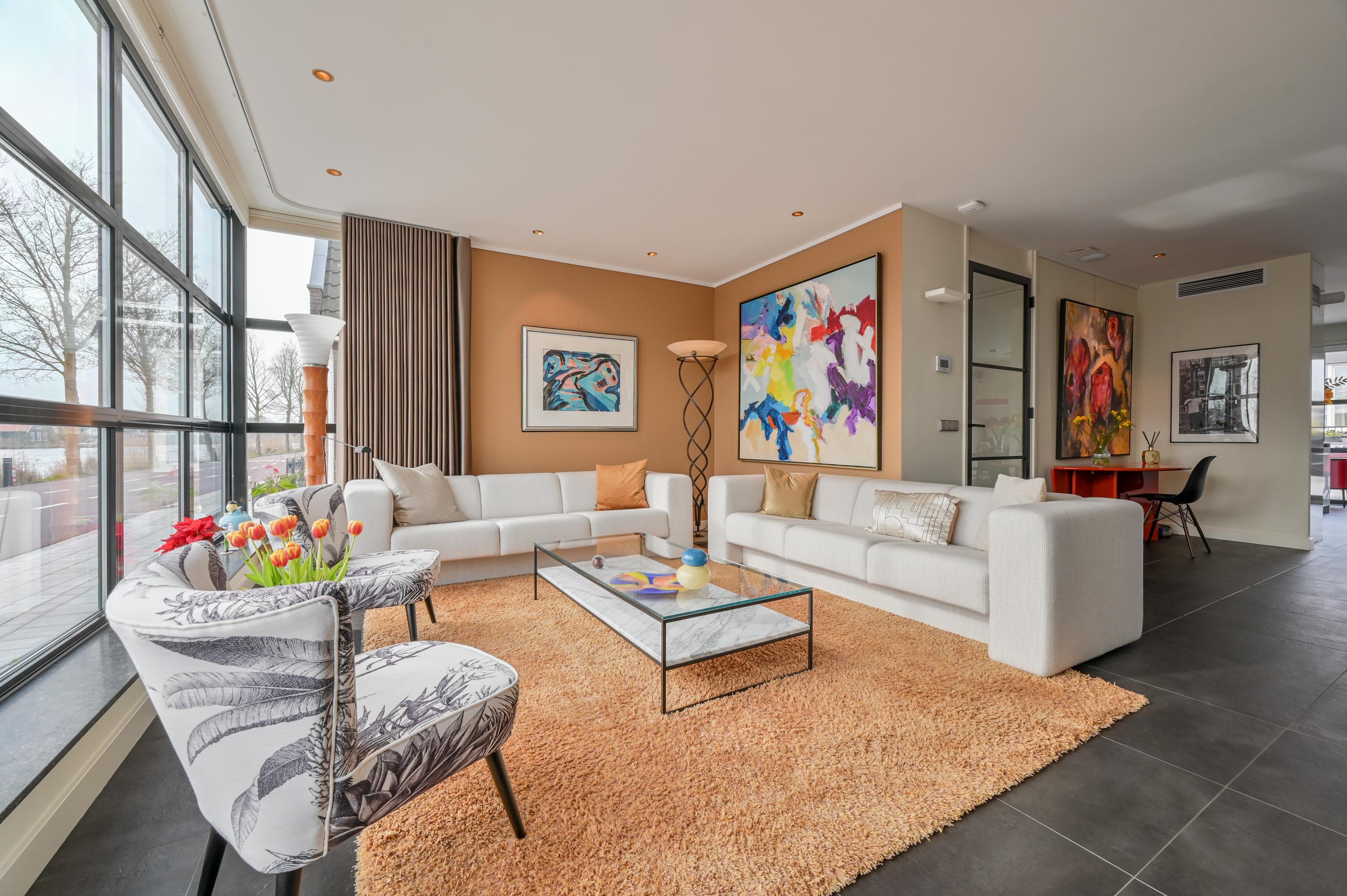Via de oprit bereikt u de voordeur en de ruime hal, voorzien van garderobekast, toilet en trap naar de verdieping. De woonkamer ligt aan de voorzijde van de woning en biedt een adembenemend uitzicht over de Amstel. Grote raampartijen laten het licht binnenstromen, terwijl het gemotoriseerde gordijn via een app te bedienen is. Tevens hangen hier ook Luxaflex Silhouttes (gemotoriseerd, met stand geheugen). De stijlvolle zwarte plavuizenvloer met vloerverwarming, ingebouwde dimbare spots van Modular en de grote designkasten maken het geheel af.