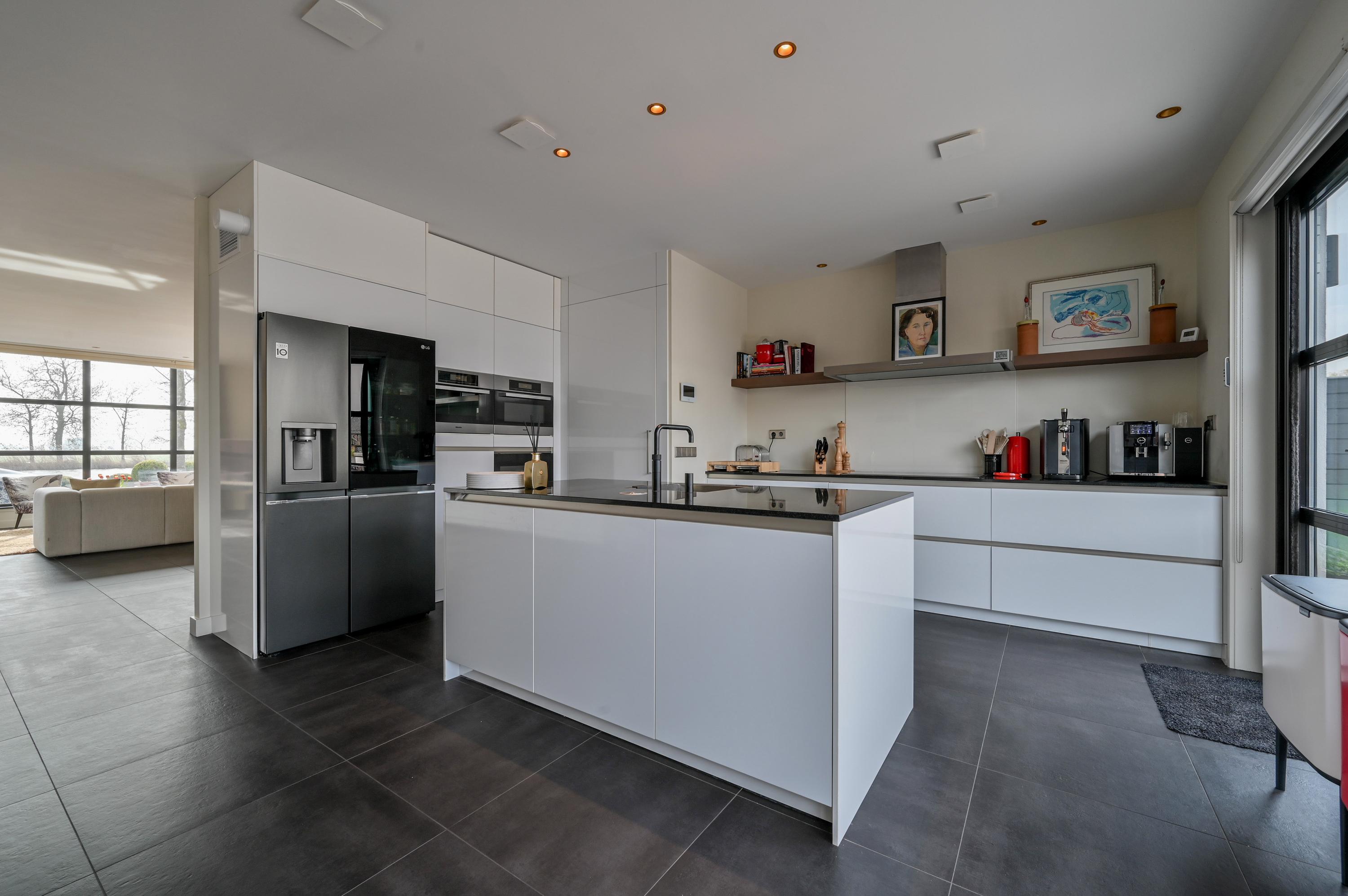 Aan de achterzijde bevindt zich de royale, luxe open keuken, ontworpen voor koken én leven. Het spoeleiland, de Qooker, vaatwasser, combi-ovens, inductiekookplaat met afzuigkap, grote LG-koelkast met vriezer en ijsblokjesmachine, Liebherr-wijnklimaatkast en uitgebreide kastruimte maken deze keuken tot een droom voor elke liefhebber van koken en gastvrijheid. Een vaste bank bij de grote eettafel zorgt voor een gezellige zithoek, terwijl dubbele openslaande deuren toegang geven tot de royale terrastuin, waar licht, ruimte en rust samenkomen.