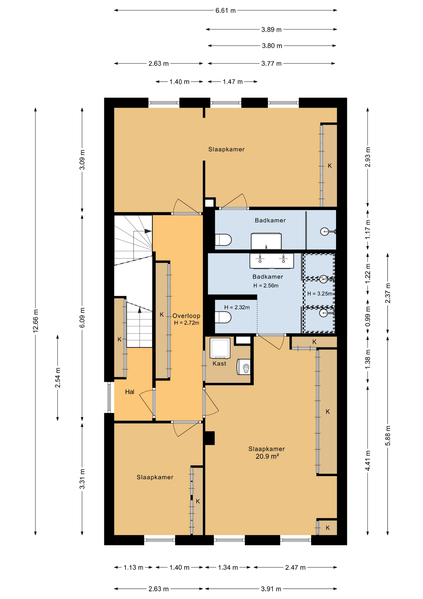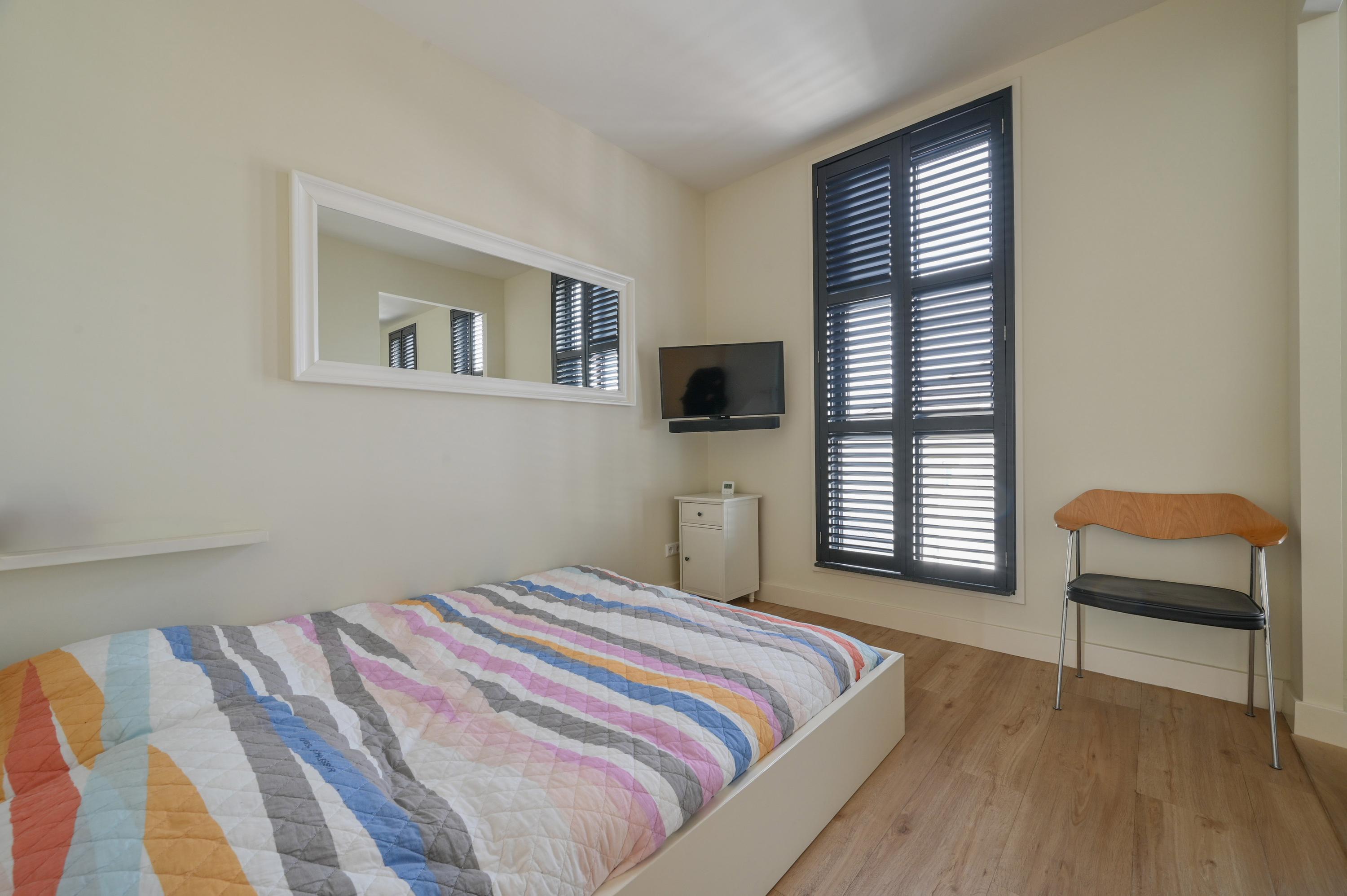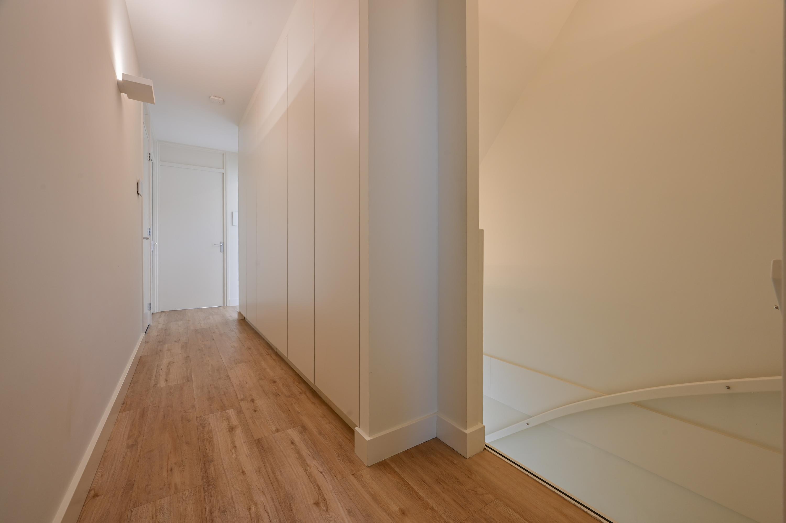 De gang biedt toegang tot de praktische stookruimte met CV-installatie en waar tevens de wasmachine en droger zijn geplaatst. Langs de gang en de trap naar het dakterras bevinden zich op maat gemaakte vaste kasten, die zorgen voor meer dan voldoende bergruimte en een overzichtelijke indeling van het gehele woonoppervlak.