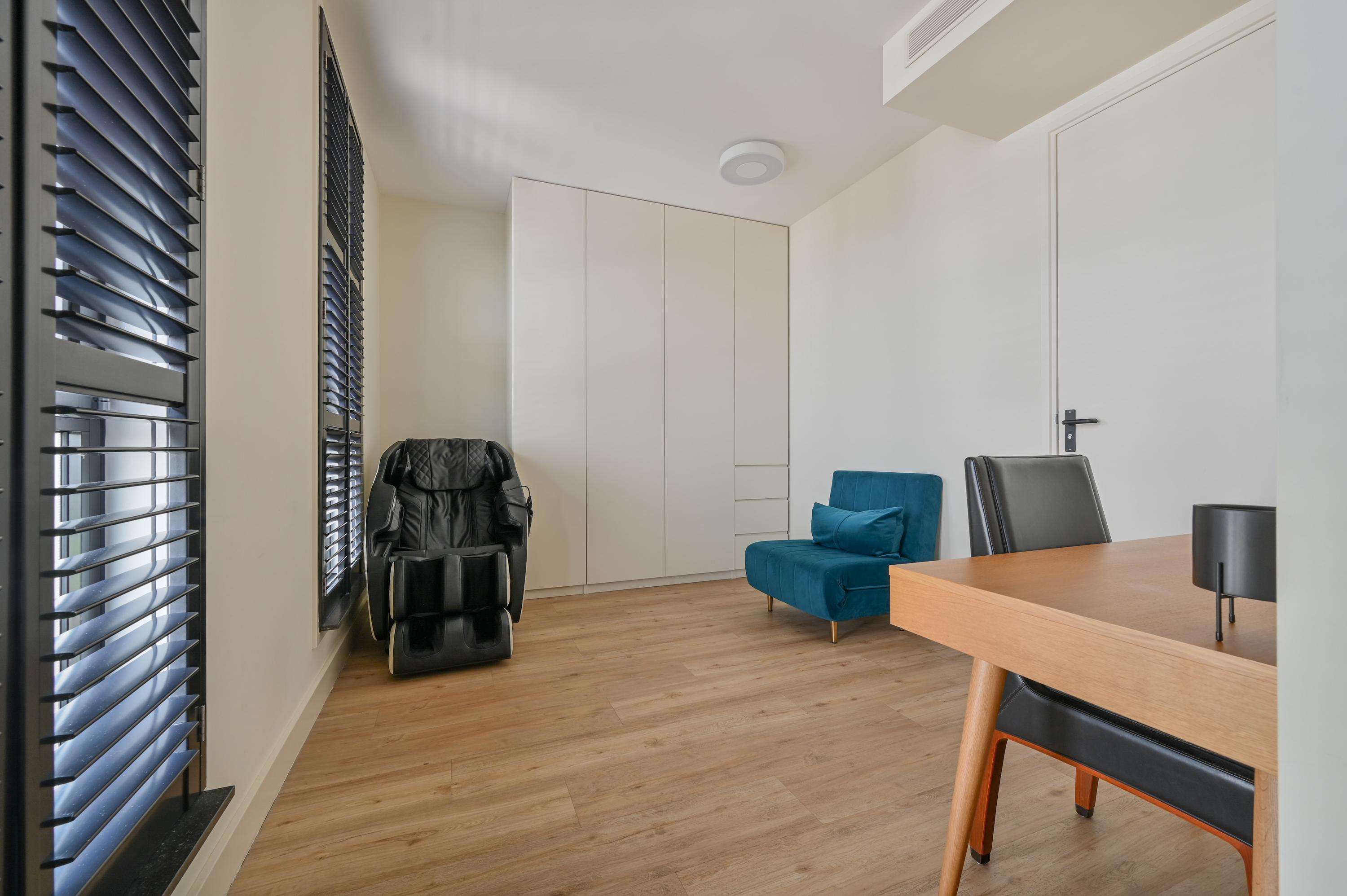 Aan de voorzijde bevinden zich nog twee kamers: momenteel is één kamer in gebruik als stijlvolle kantoorruimte terwijl de andere dienstdoet als riante master-bedroom. Deze master is uitgerust met een op maat gemaakte kastenwand en een luxe ensuite badkamer. De badkamer straalt elegantie uit met lichte designtegels, een inloopdouche met dubbele stort- en handdouche, een lichtstraat die daglicht overvloedig naar binnen laat, een dubbele wastafel met Hotbath kranen en voorzien van lades, een strak wandmeubel en een automatisch toilet met afstandsbediening.