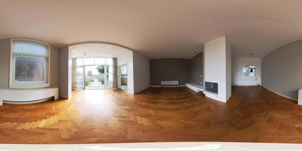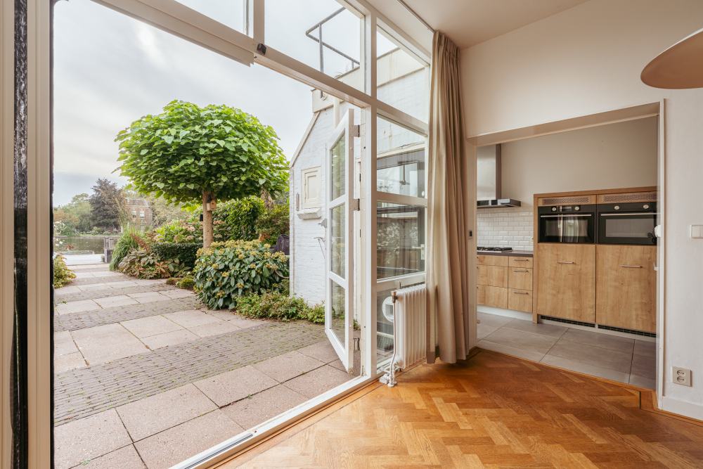 De royale woonkamer strekt zich uit over de volle breedte van de woning en kenmerkt zich door de fraaie houten, visgraatvloer en grote raampartijen met openslaande deuren naar de tuin. Hierdoor geniet de woonkamer van veel daglicht en een prachtig uitzicht over de achtergelegen tuin en de Amstel.