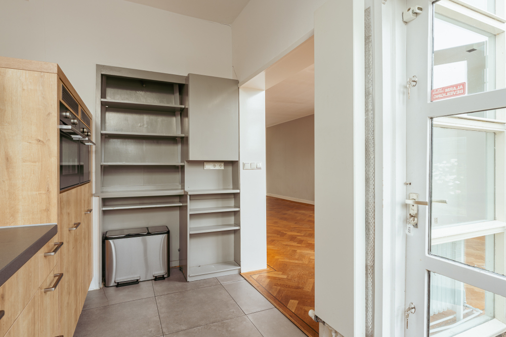 Via de entree aan de autoluwe straatzijde betreedt u de woning in de hal, voorzien van een garderoberuimte en separaat toilet met fontein. Vanuit de hal bereikt u de kamer aan de voorzijde van de woning, die dankzij de hoge ramen veel lichtinval heeft en ideaal kan dienen als kantoor of praktijkruimte. Deze ruimte beschikt tevens over een eigen (tweede) entree.