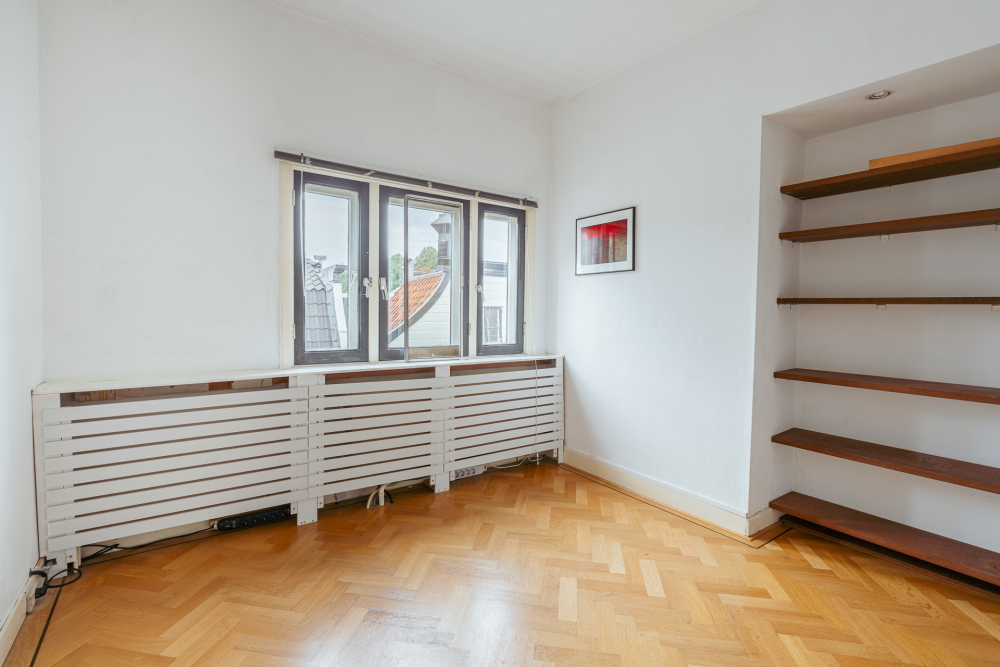 De ruime overloop geeft toegang tot drie slaapkamers en de badkamer. De hoofdslaapkamer ligt aan de achterzijde en beschikt over dubbele openslaande deuren naar een groot balkon van ca. 17 m² met een adembenemend uitzicht over de Amstel. De kamer is royaal en voorzien van een fraaie houten vloer.