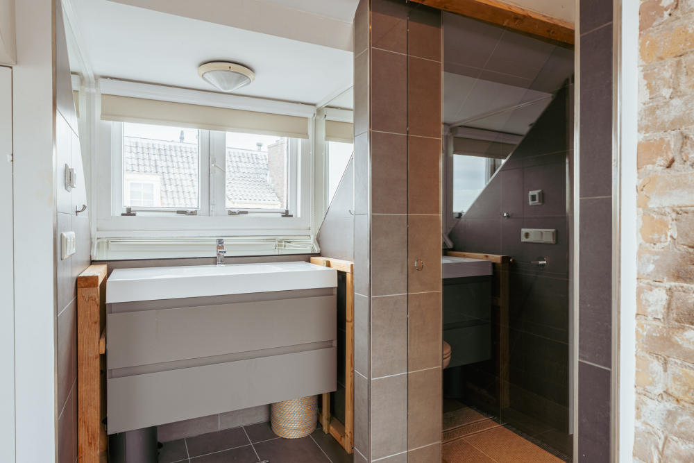 De bovenste verdieping is een open ruimte met hoge nok (ruim 3 meter) en grote dakramen en dakkapellen die zorgen voor veel lichtinval. Hier bevindt zich tevens een moderne badkamer met inloopdouche, wastafelmeubel, vloerverwarming en een derde toilet. Deze verdieping is bovendien voorzien van airconditioning, wat extra comfort biedt in alle seizoenen. De combinatie van het authentieke balkenplafond en de strakke afwerking geeft deze ruimte een bijzondere uitstraling. Indien gewenst kan de verdieping relatief eenvoudig worden opgedeeld in twee aparte slaapkamers.