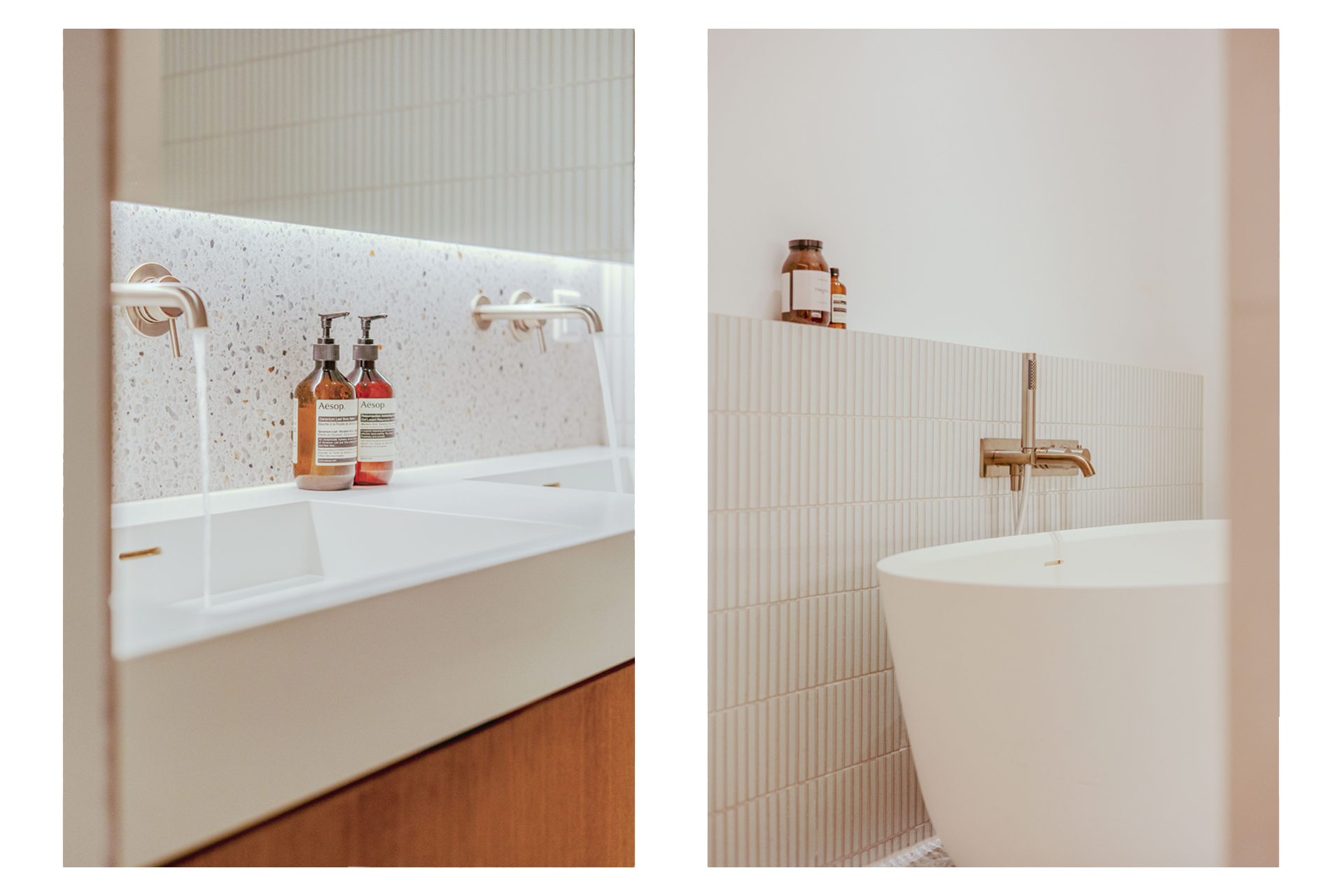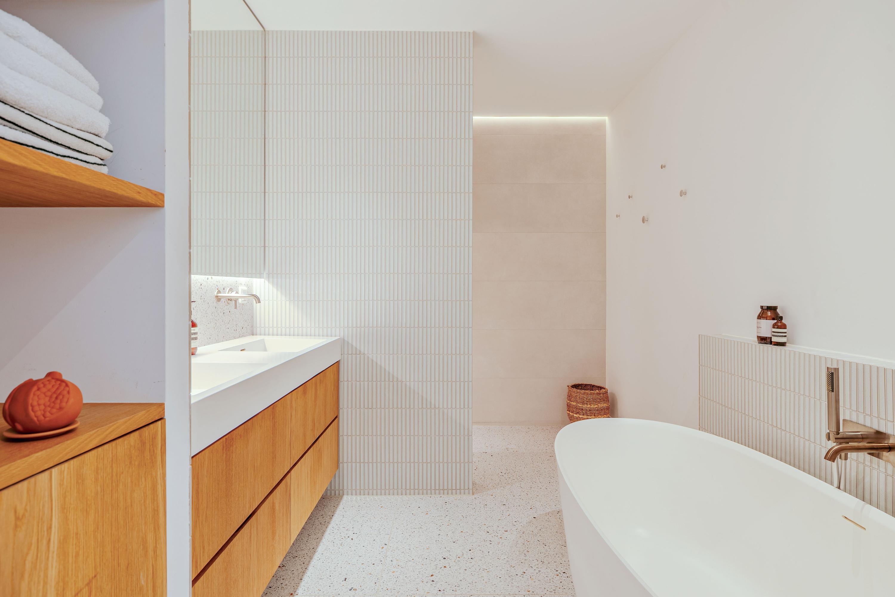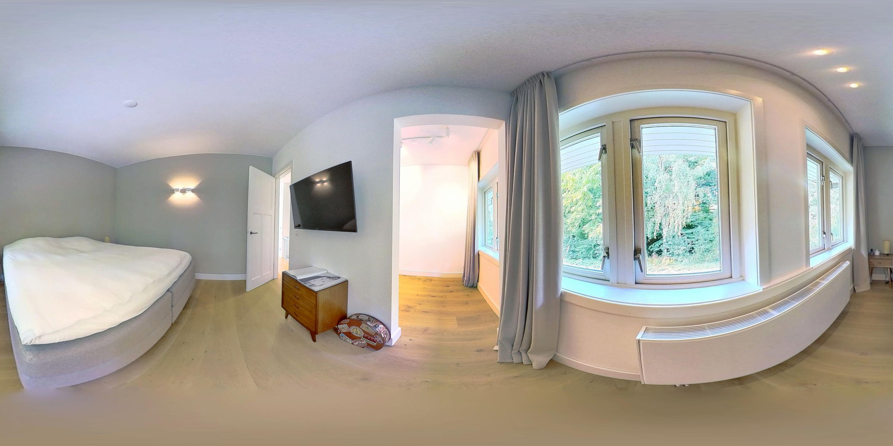 De overloop geeft toegang tot drie slaapkamers, een ruime badkamer en een separaat toilet. De master bedroom ligt aan de voorzijde en biedt voldoende ruimte voor een groot bed en kastenwand. Direct ernaast bevindt zich een extra kamer die eenvoudig als inloopkast kan worden ingericht. Aan de achterzijde liggen nog twee slaapkamers, waarvan één met toegang tot het balkon en één voorzien van een elektrisch rolluik op zonne-energie. De moderne badkamer is uitgerust met een ligbad, dubbele wastafel met meubel, vloerverwarming en een verwarmde spiegel.