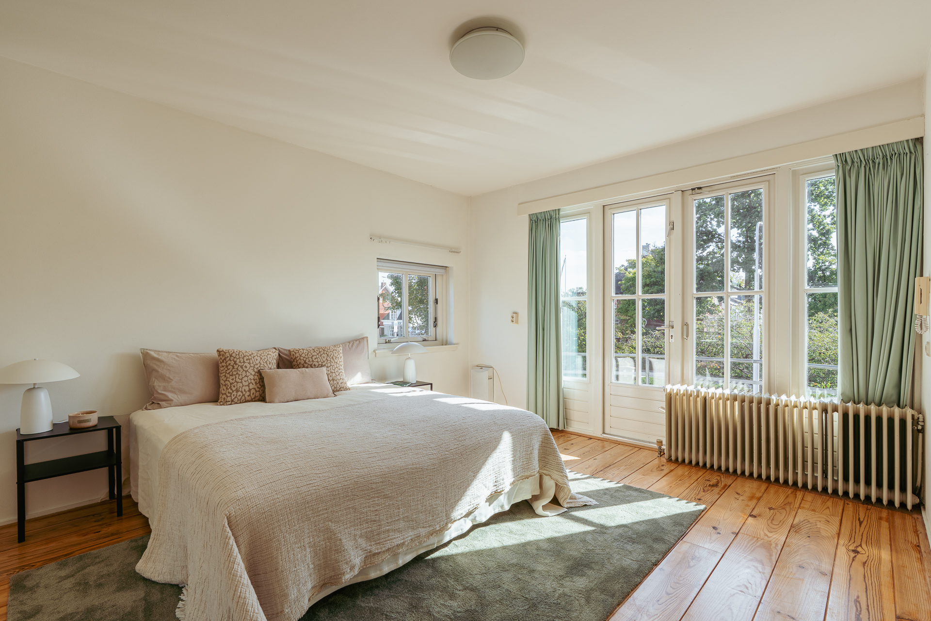 Overloop. Riante masterbedroom aan de achterzijde met vaste kast en openslaande deuren naar het balkon. Tweede slaapkamer aan de voorzijde. Badkamer met douche, wastafel en toilet. Ruime derde slaapkamer met vaste kast en balkon gelegen aan de voorzijde. Op de gehele eerste verdieping bevindt zich een houten vloer.