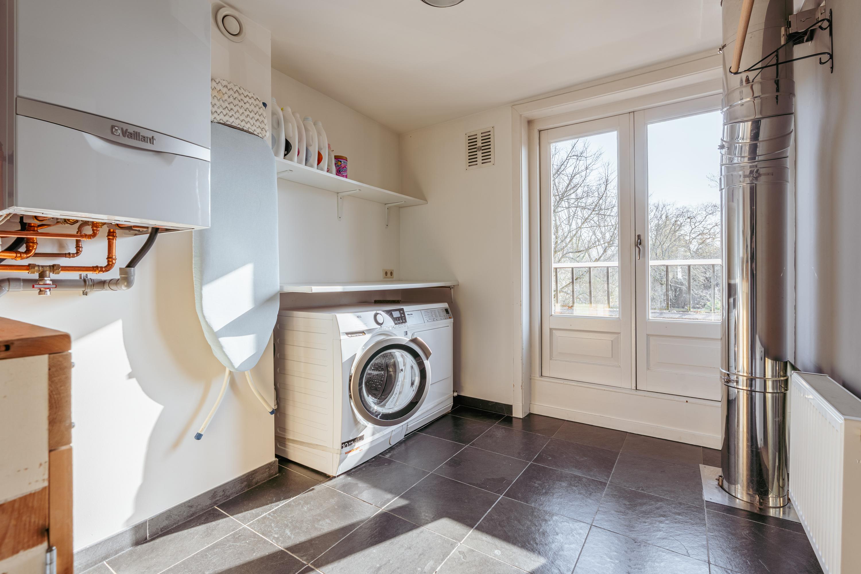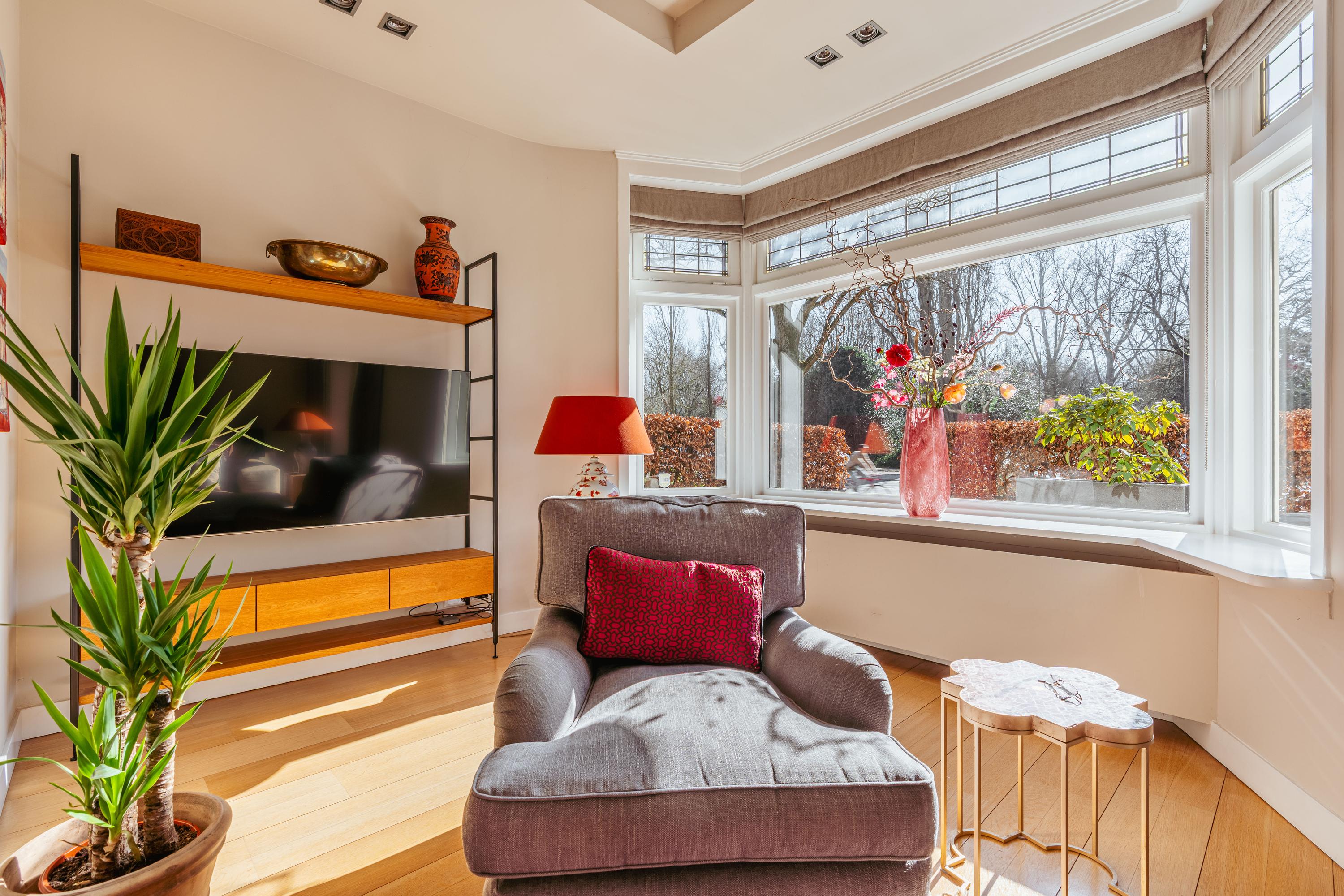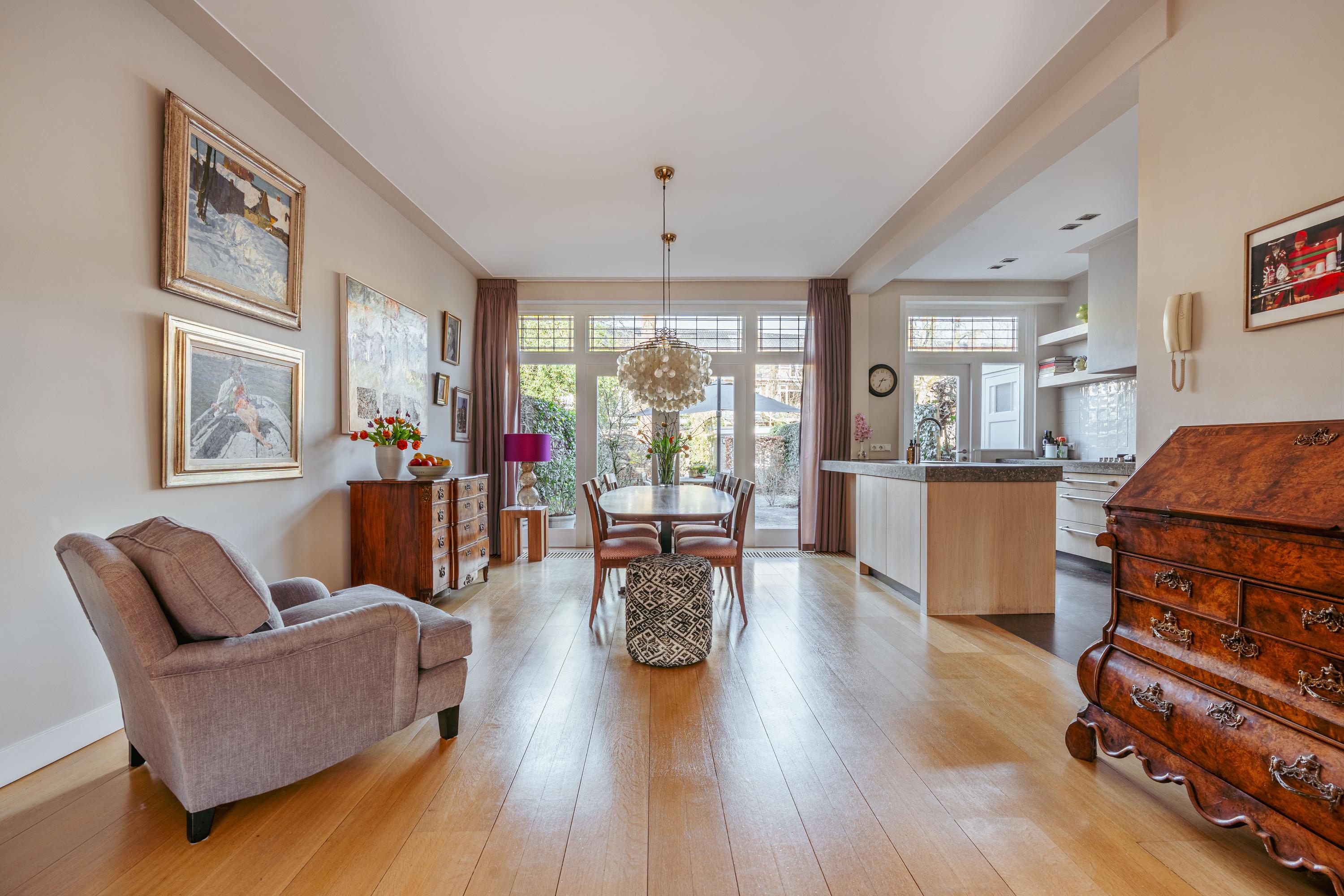 Entree met tochtportaal, gevolgd door een ruime hal met garderobe, trapopgang en een separaat toilet met fontein. Aan de voorzijde bevindt zich de sfeervolle woonkamer met open haard en een erker, welke zorgt voor een prachtige lichtinval. Hier is volop ruimte voor een royale zithoek en eventueel een lees- of werkhoek. Via dubbele openslaande deuren bereikt u het verhoogde terras aan de voorzijde, waar u heerlijk van de zon kunt genieten. Aan de achterzijde, achter schuifdeuren, ligt de royale eetkamer met aangrenzend de open keuken met kookeiland. De keuken is uitgerust met een vijfpits gasfornuis, afzuigkap, oven, combi-oven, koelkast, vaatwasser, Quooker en biedt bovendien enorm veel opbergruimte.