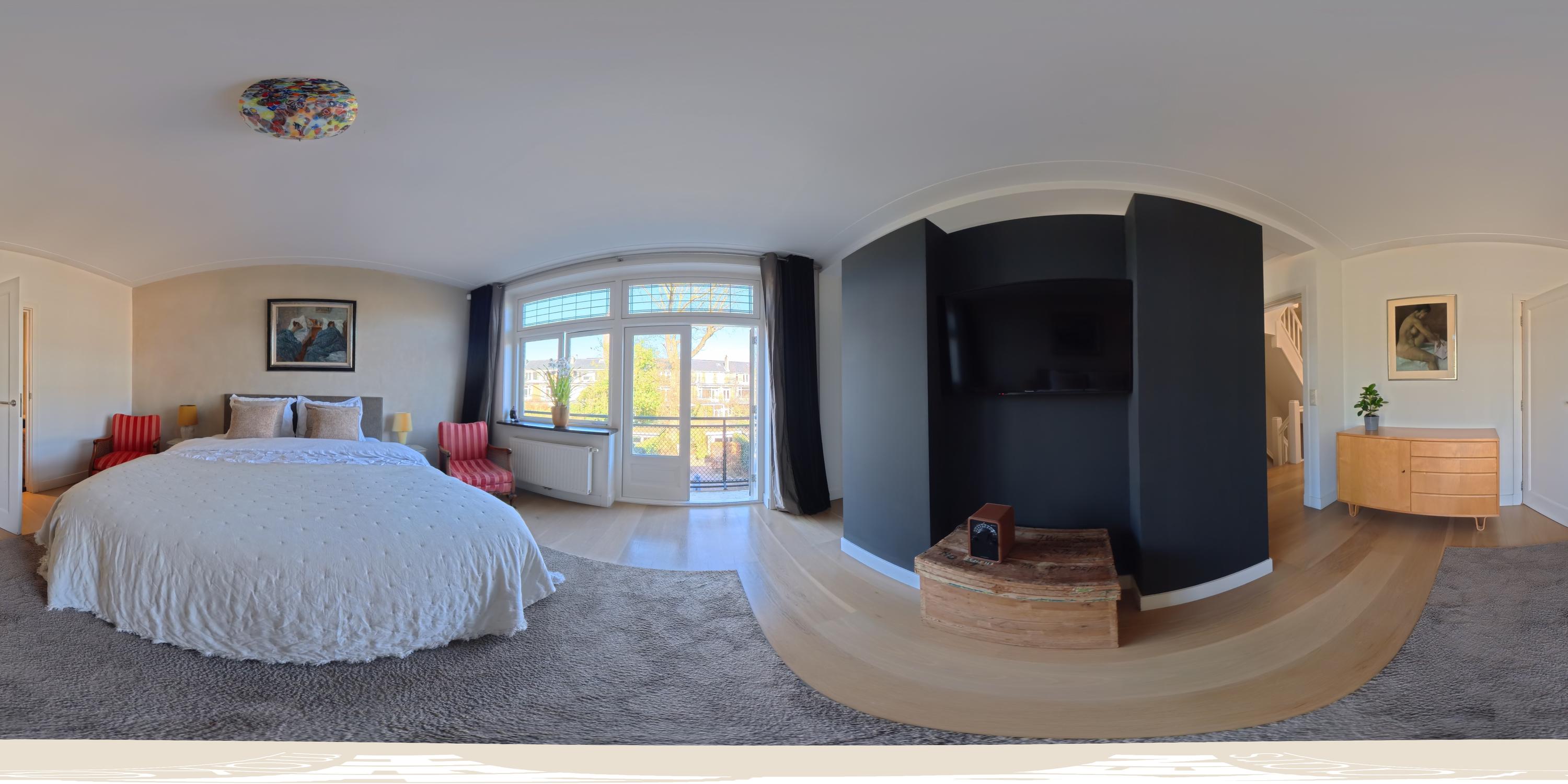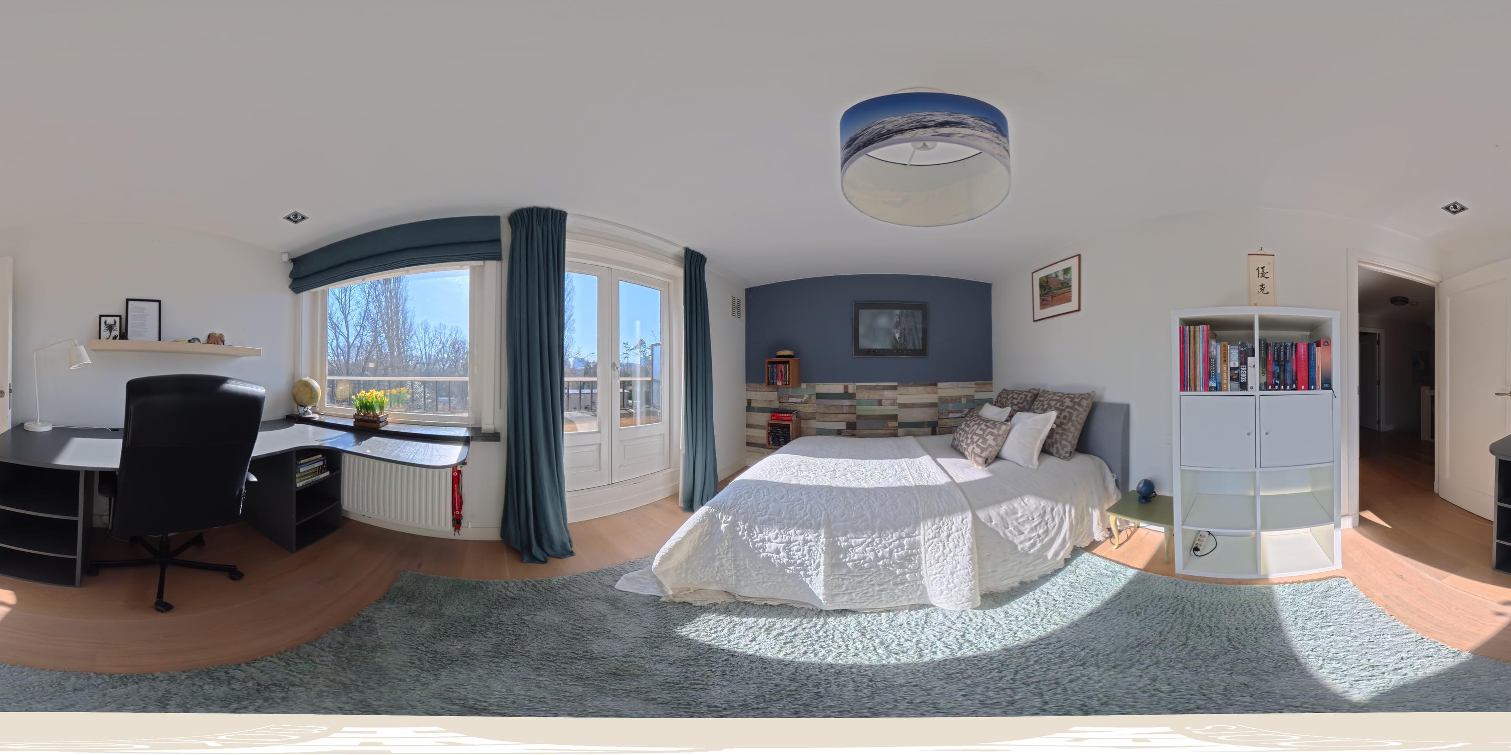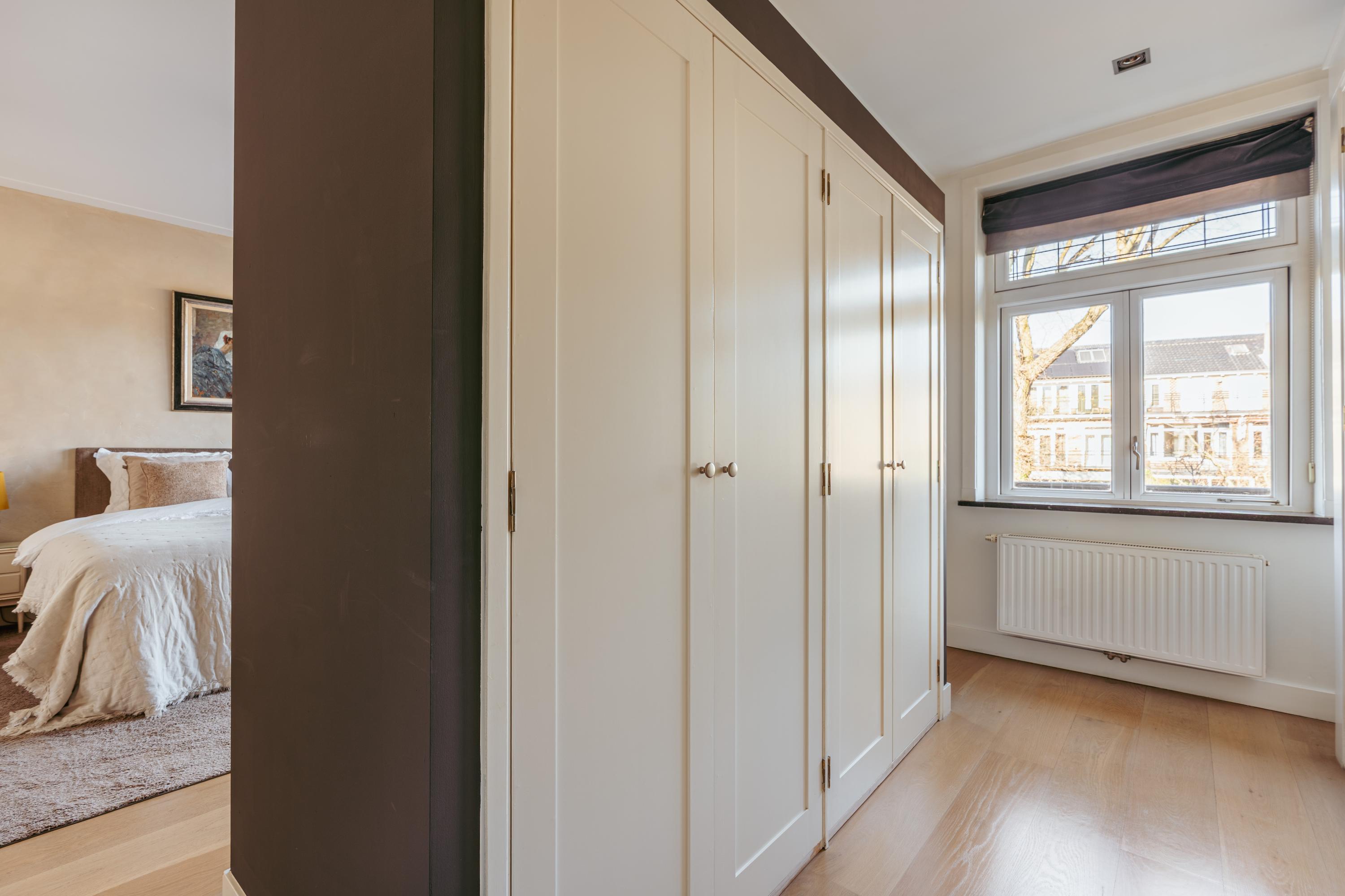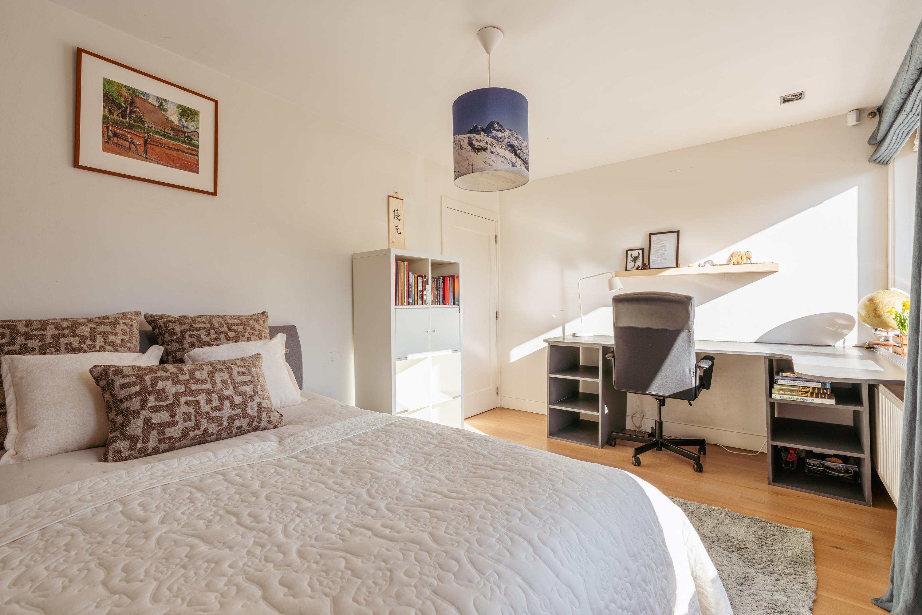 Overloop met toegang tot twee bijzonder ruime slaapkamers. De master bedroom ligt rustig aan de achterzijde en beschikt over op maat gemaakte kastenwanden. Via dubbele openslaande deuren bereikt u het brede balkon van ca. 6 m² met veel privacy. De royale badkamer bevindt zich en-suite en is voorzien van een ligbad, inloopdouche, dubbele wastafel met meubel en een toilet. De badkamer is tevens toegankelijk vanuit de hal. Aan de voorzijde treft u de tweede ruime slaapkamer, eveneens met ingebouwde kastenwanden, momenteel ingericht als kantoorruimte met twee werkplekken.