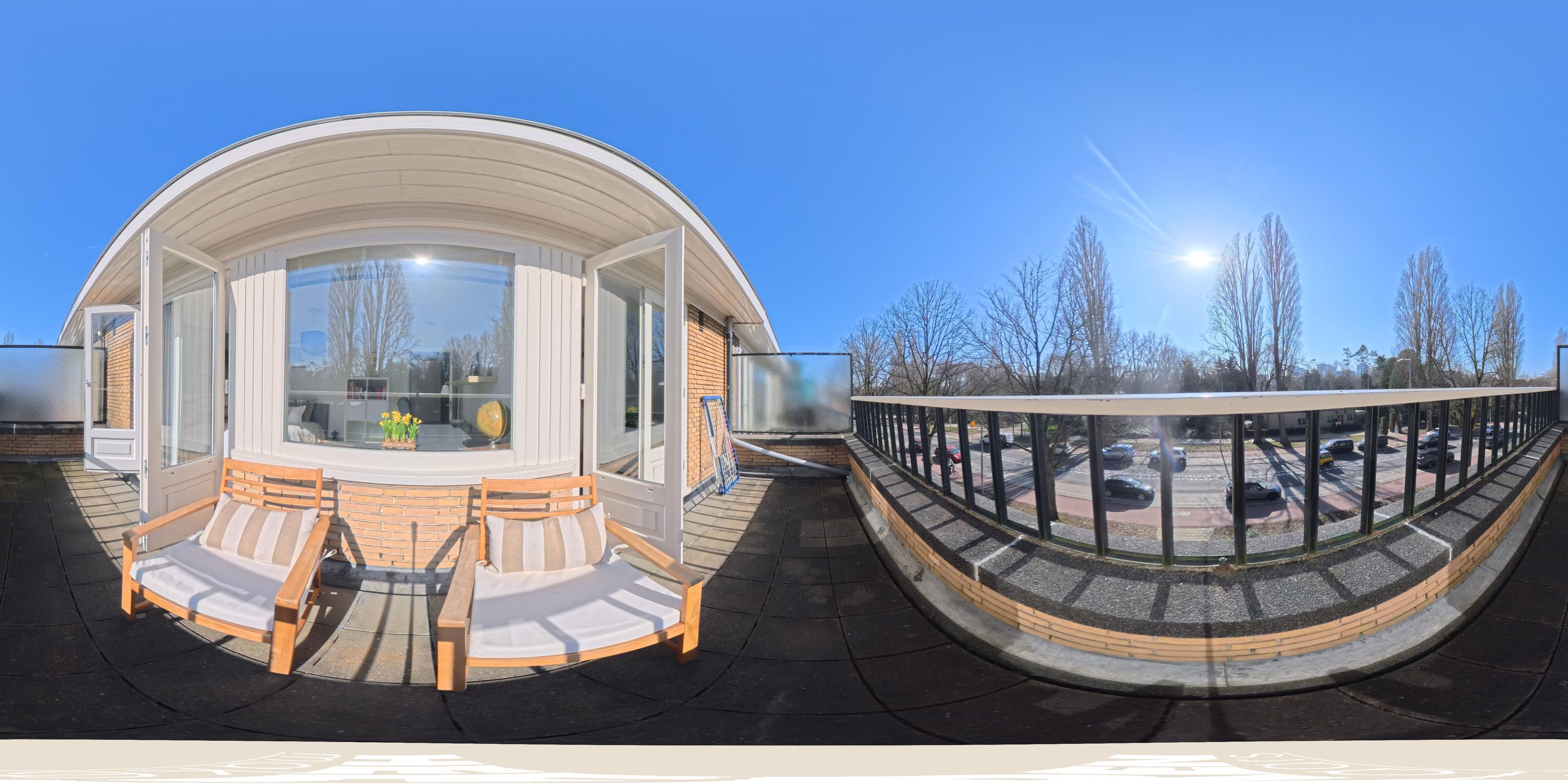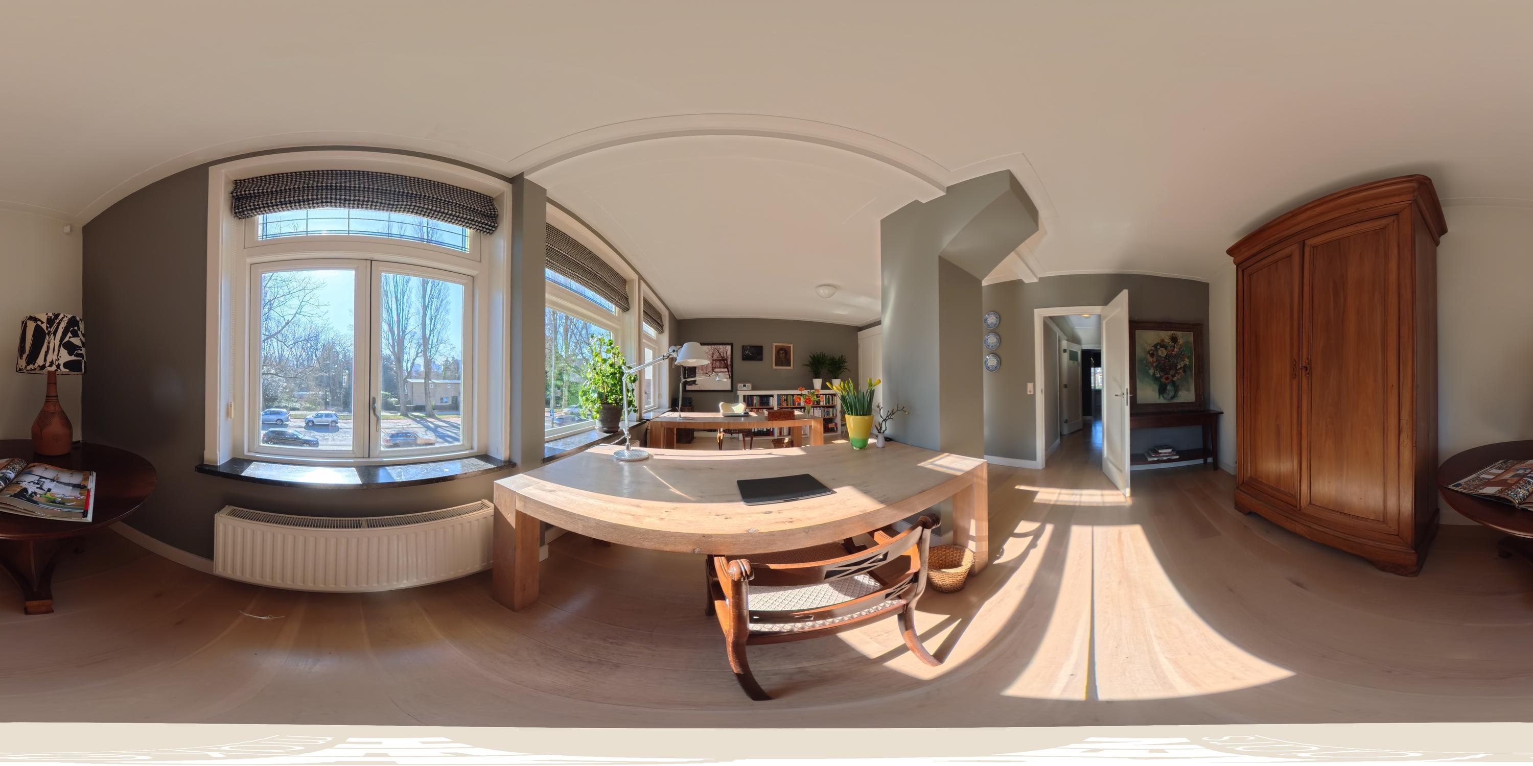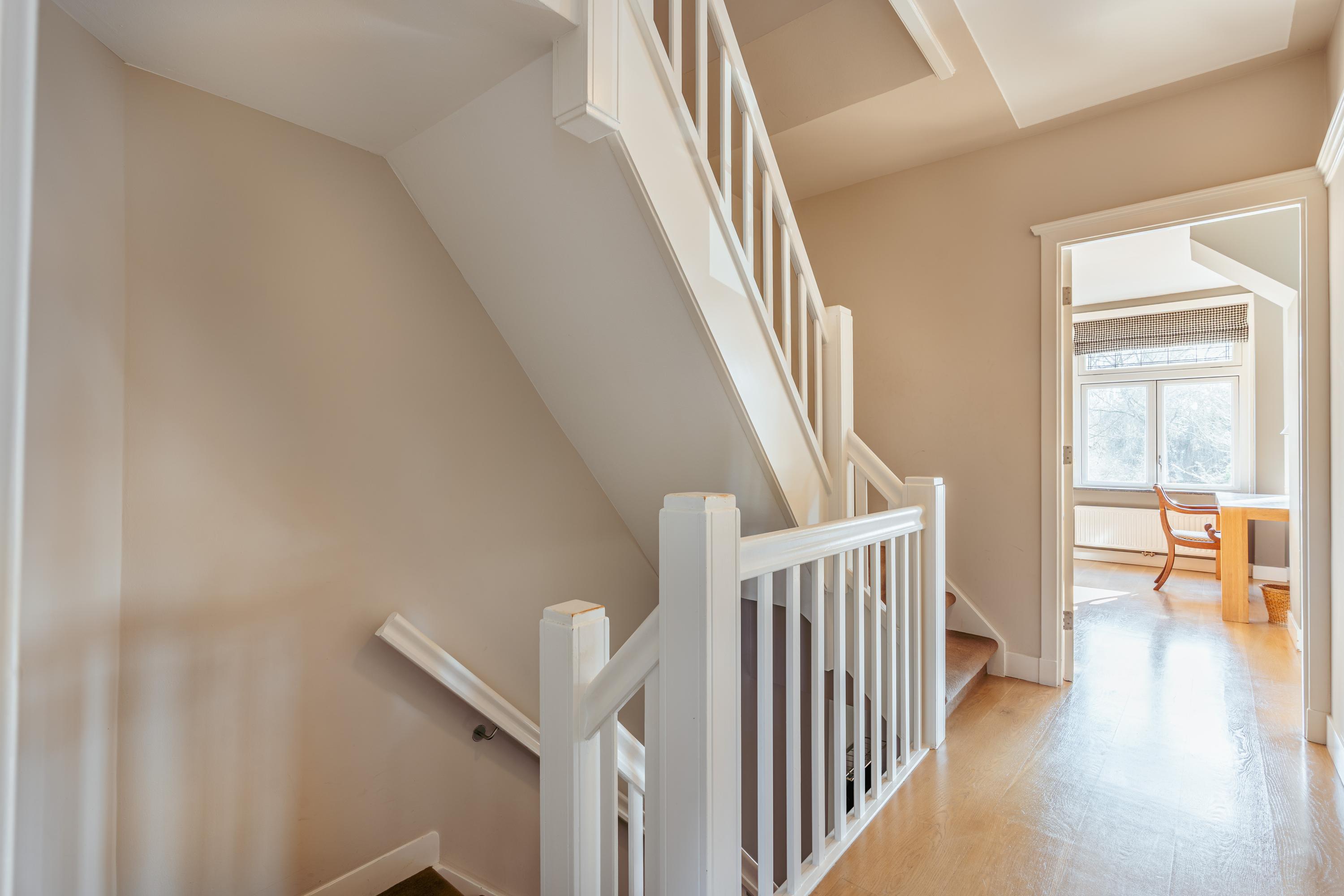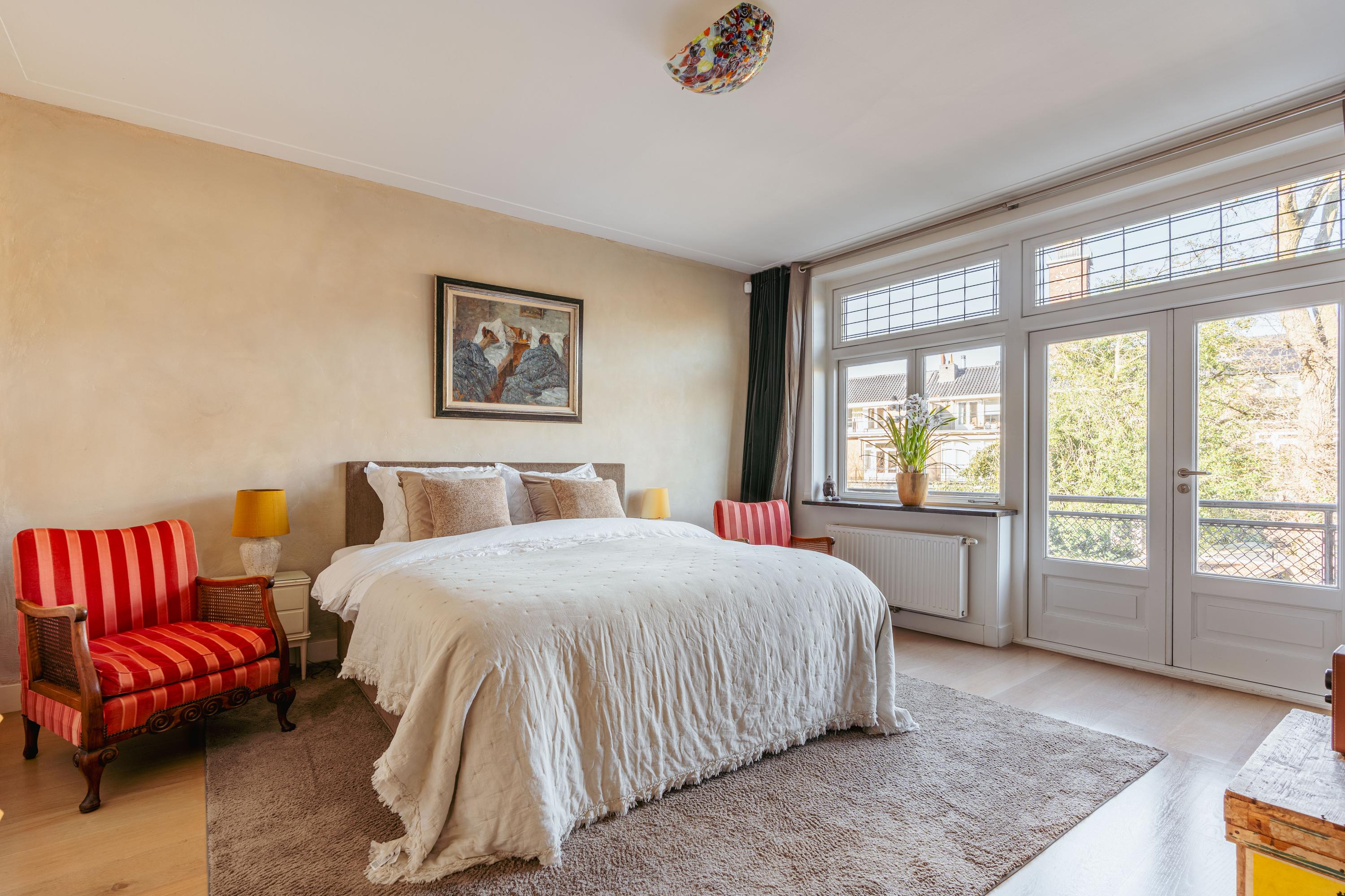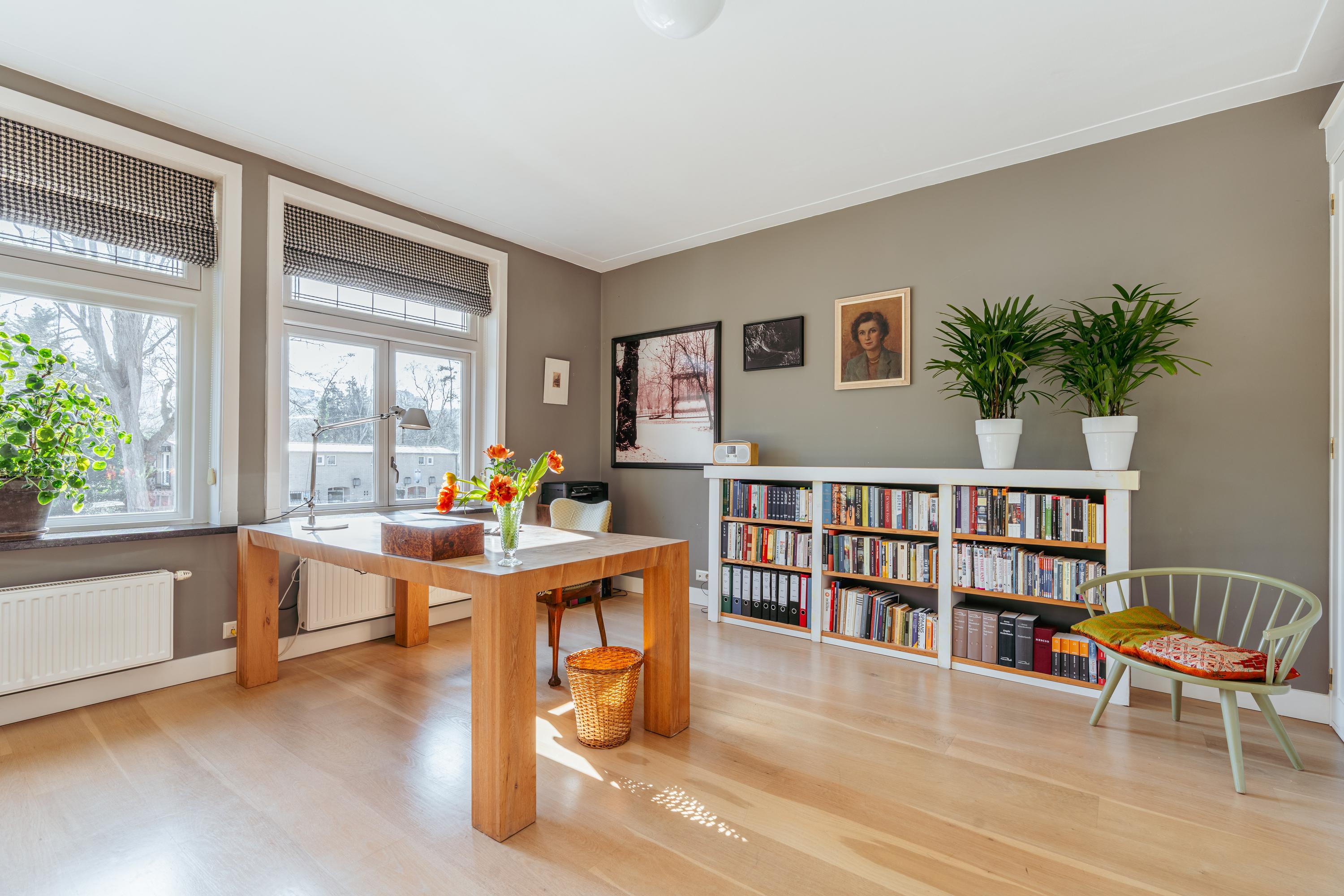 Overloop met toegang tot twee bijzonder ruime slaapkamers. De master bedroom ligt rustig aan de achterzijde en beschikt over op maat gemaakte kastenwanden. Via dubbele openslaande deuren bereikt u het brede balkon van ca. 6 m² met veel privacy. De royale badkamer bevindt zich en-suite en is voorzien van een ligbad, inloopdouche, dubbele wastafel met meubel en een toilet. De badkamer is tevens toegankelijk vanuit de hal. Aan de voorzijde treft u de tweede ruime slaapkamer, eveneens met ingebouwde kastenwanden, momenteel ingericht als kantoorruimte met twee werkplekken.
