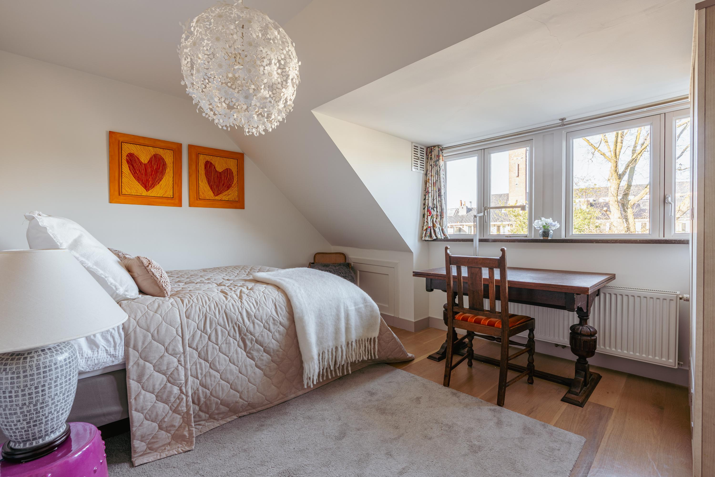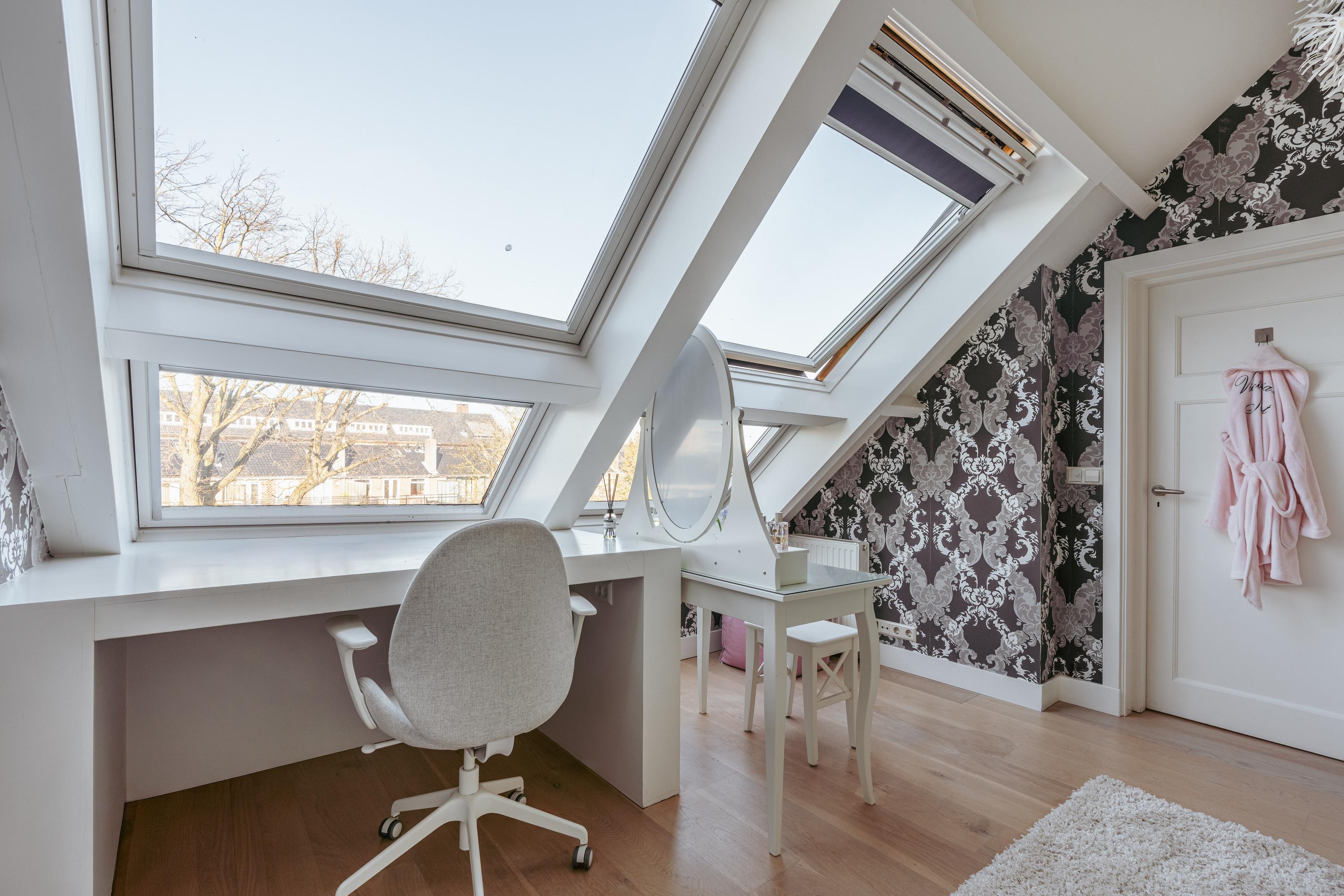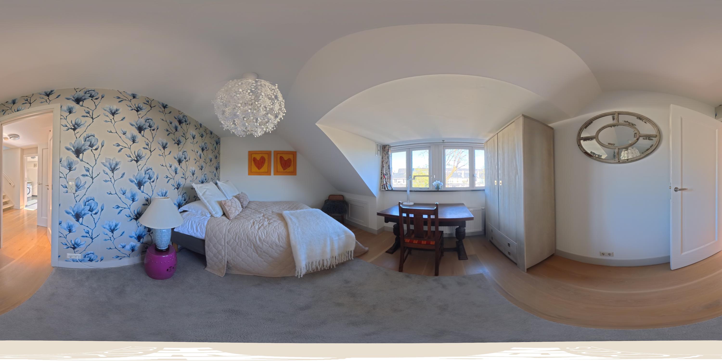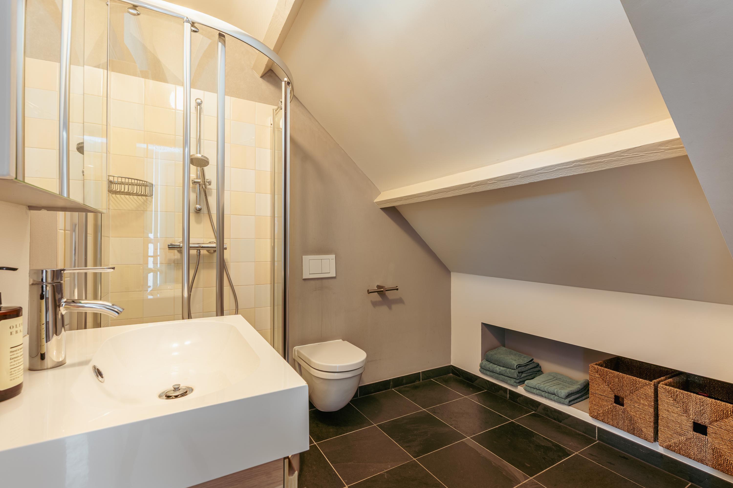 Overloop met toegang tot de vijfde slaapkamer van dit familiehuis. De bovenste verdieping heeft een indrukwekkende nokhoogte en meerdere ramen, waardoor de ruimte bijzonder licht en ruimtelijk aanvoelt. En-suite bevindt zich een badkamer met inloopdouche, wastafel met meubel en toilet. Vanaf de overloop is daarnaast een praktische berging bereikbaar. Deze verdieping leent zich uitstekend als werkkamer, logeerruimte of studio.