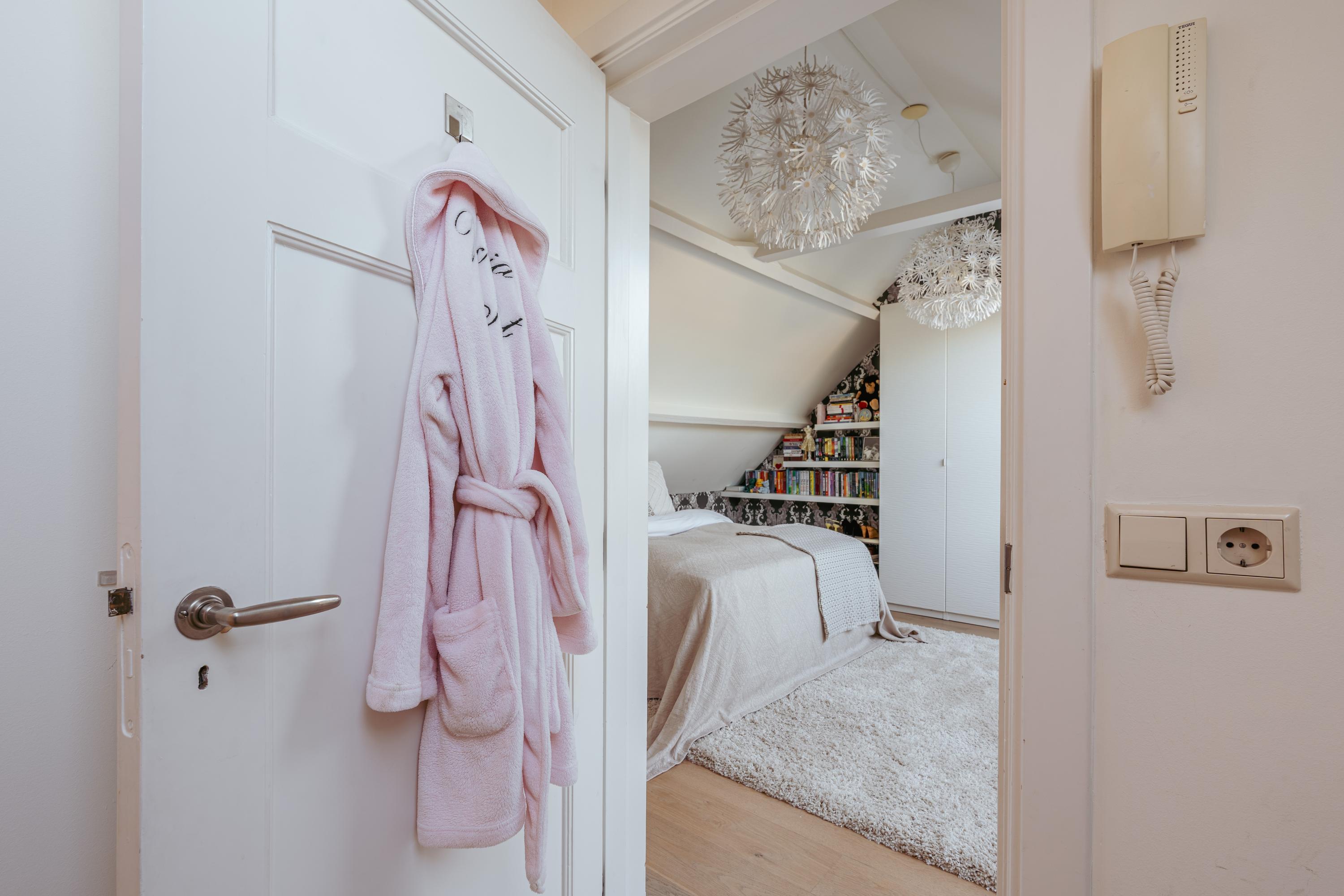 Overloop met toegang tot de derde slaapkamer aan de achterzijde. Daarnaast bevindt zich een kledingkamer met praktische en fraai afgewerkte inbouwkasten, die eenvoudig kan worden omgebouwd tot extra kinderkamer of werkruimte. Aan de voorzijde ligt de vierde slaapkamer, met toegang tot het zeer diepe en brede balkon van ca. 13 m². Deze woning is bovendien de enige in de straat die hier geen direct zicht heeft op andere woningen, wat voor extra privacy zorgt. Verder bevindt zich op deze verdieping een aparte wasruimte met aansluitingen voor wasmachine en droger en extra bergruimte. Vanuit deze ruimte is eveneens toegang tot het balkon. Centraal ligt de badkamer, voorzien van een drievoudige wastafel met meubel en een inloopdouche. Daarnaast is er een separaat toilet met fonteintje.