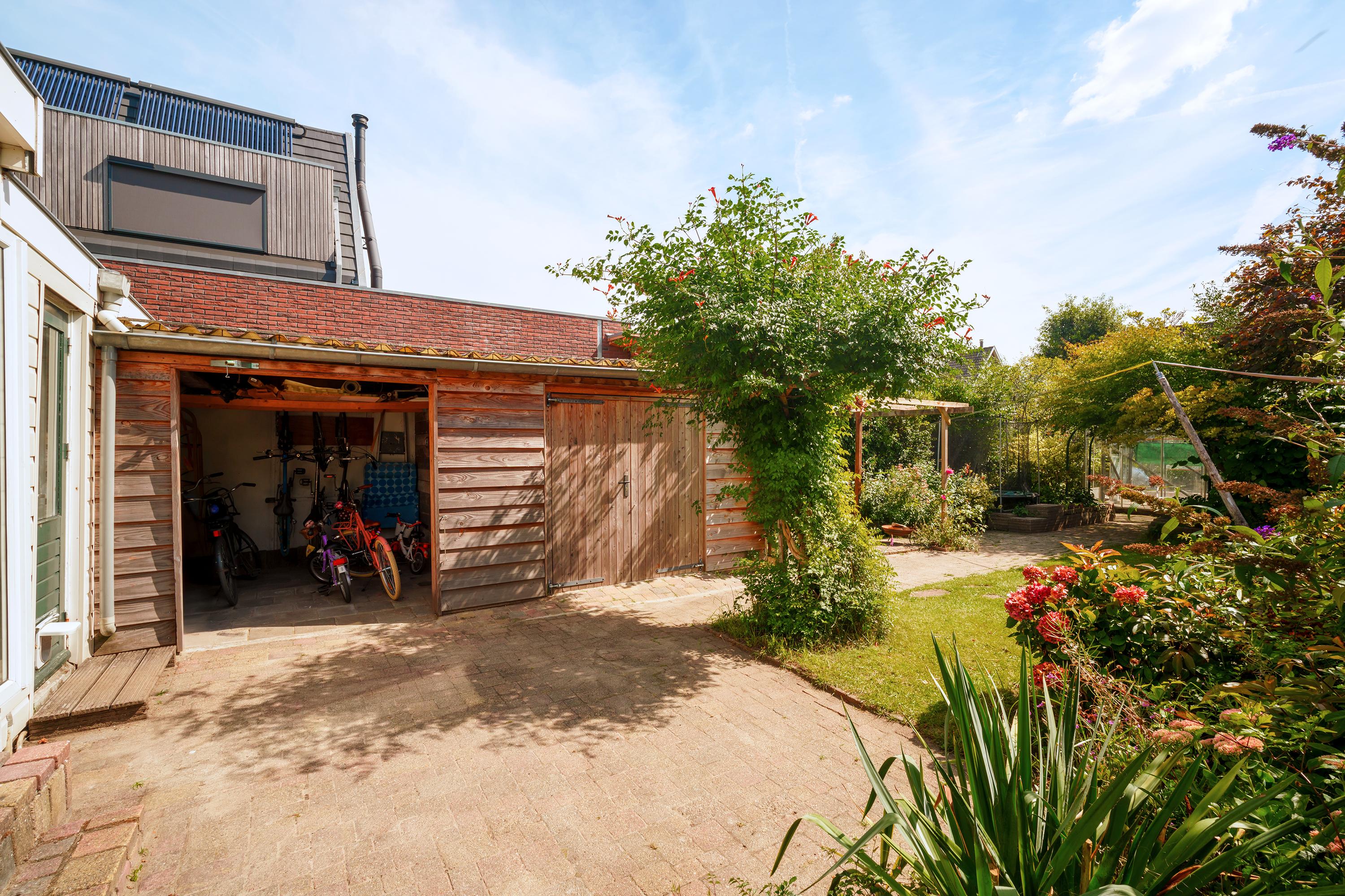 De tuin is bereikbaar via het zijpad. Hier tref je een overkapping, ruime schuur, (groenten-)kas en boothuis. De volwassen beplanting geeft rust, schaduw, geur, kleur en beleving. Op het zuiden en met veel privacy!
