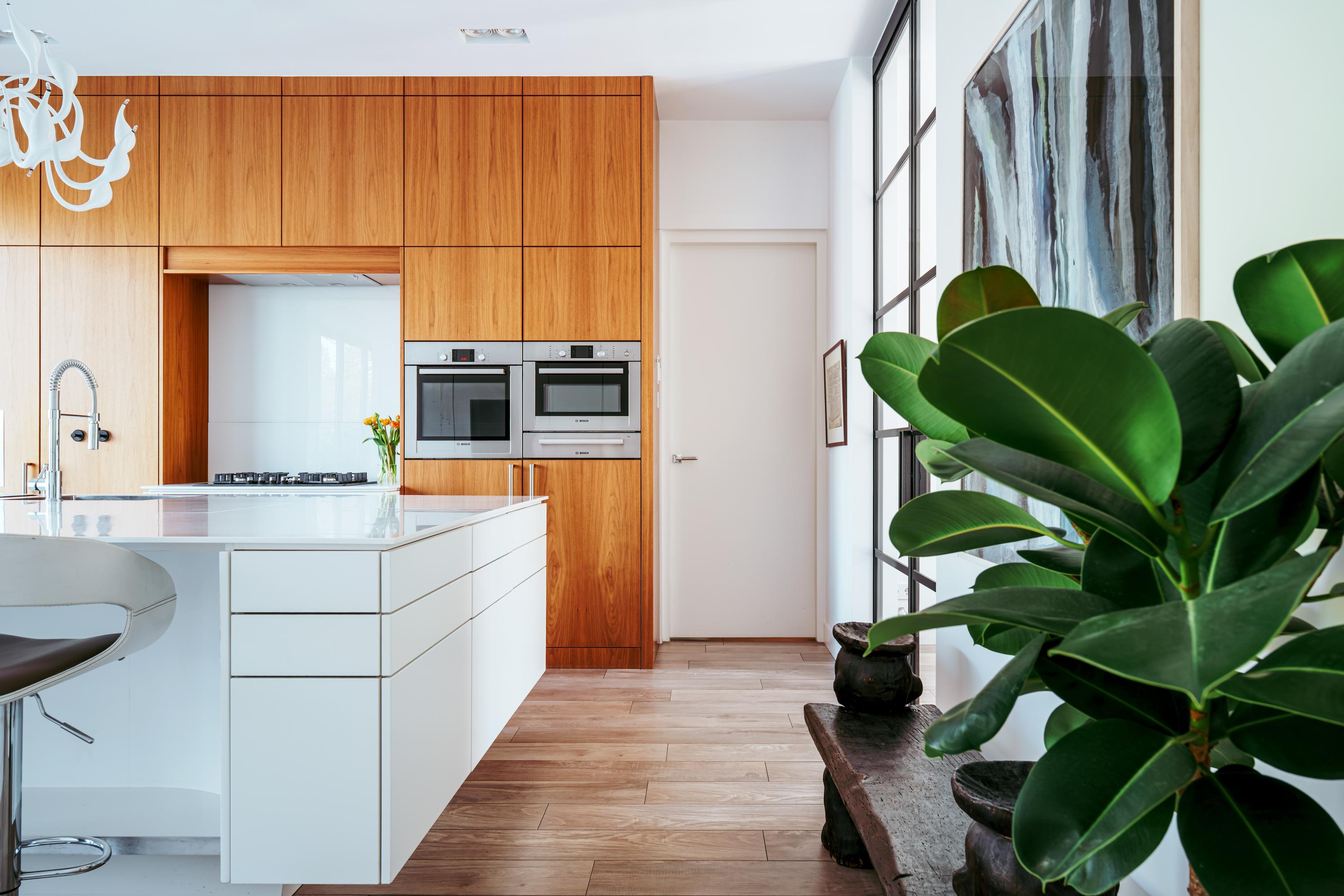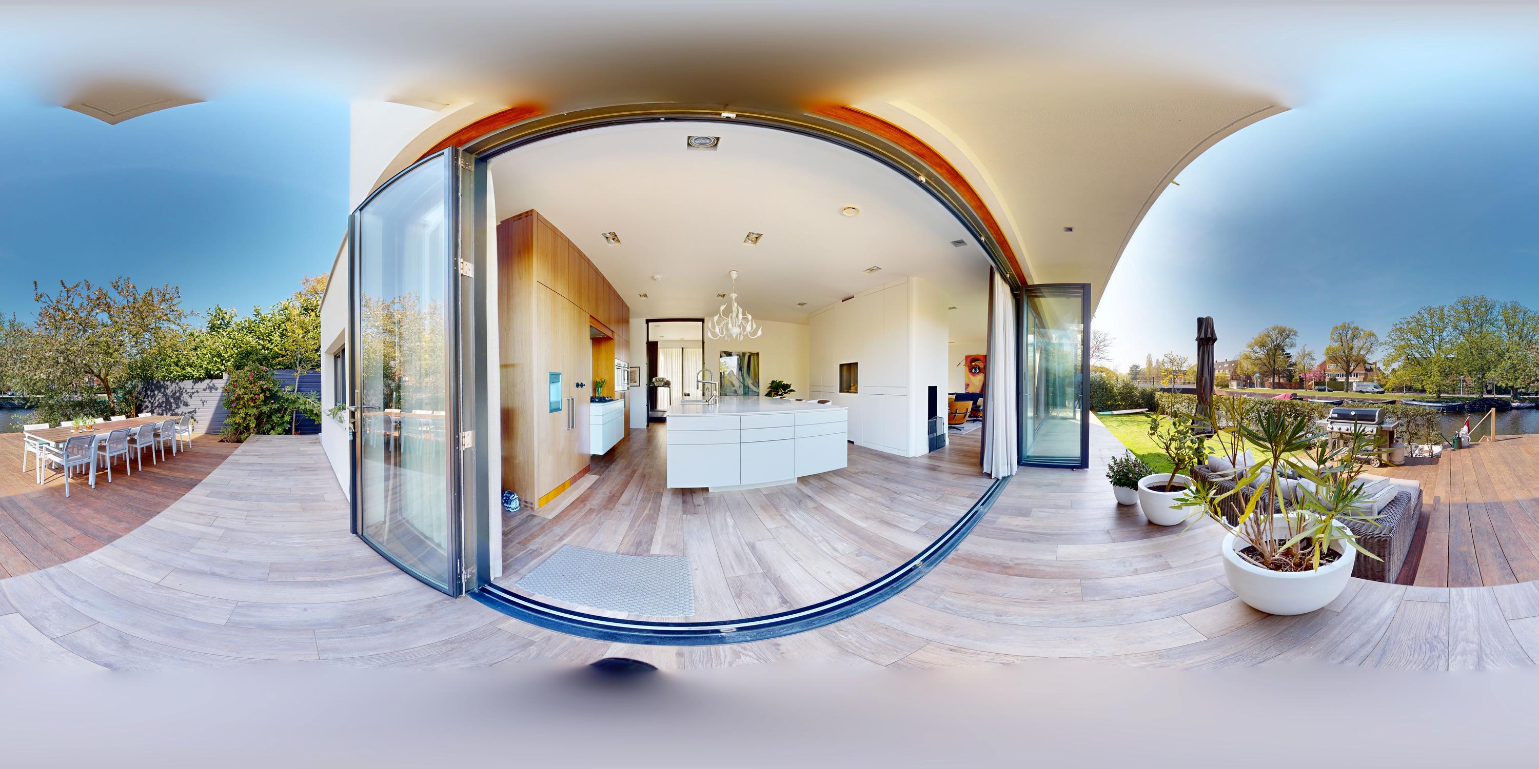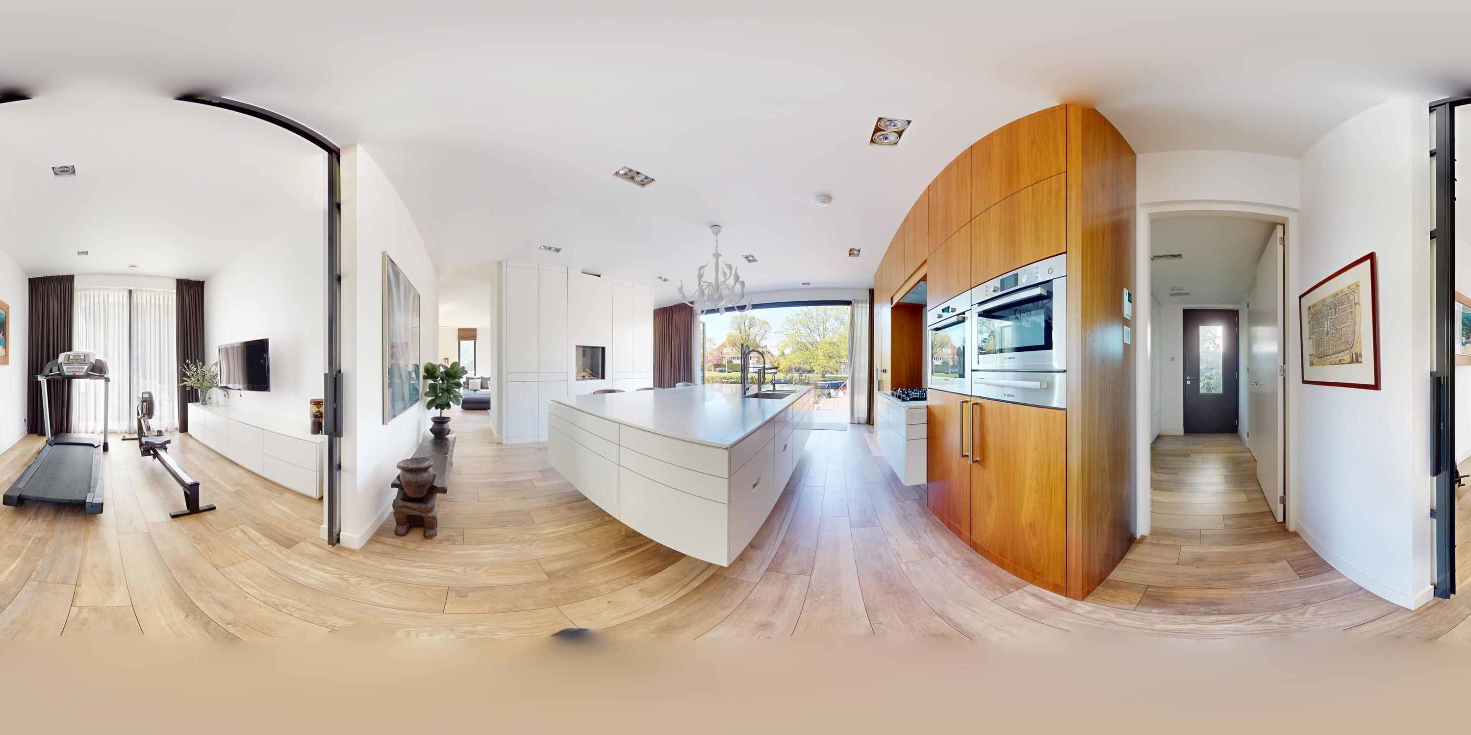 Entree; middels de hal met garderobe en separaat toilet bereikt u het leefgedeelte van de woning. Stalen deuren geven toegang tot de royale eet en woonkamer, welke is voorzien van een open haard en openslaande deuren naar zowel de voor- als achtertuin. Grote raampartijen zorgen voor een prettige lichtinval en verbinden de ruimte op natuurlijke wijze met de buitenomgeving. Grenzend aan de woonkamer bevindt zich de ruim opgezette woonkeuken. Deze is uitgerust met een centraal spoeleiland met dubbele spoelbak, dubbele vaatwasser, Quooker en een uitschuifbare pantry. Aan de overzijde bevindt zich het kookgedeelte, voorzien van een vijfpits gasfornuis, een verborgen kruidenkabinet, een royale Amerikaanse koelkast met geïntegreerde water- en ijsdispenser, en veel opbergruimte. Ook zijn er twee ovens en een warmhoudlade van Bosch ingebouwd. De keuken beschikt daarnaast over een eigen gashaard, welke samen met de open haard in de woonkamer is geïntegreerd in één dubbele wand. Openslaande deuren in de keuken bieden toegang tot de achtertuin met aanlegsteiger, geschikt voor het aanmeren van een boot.