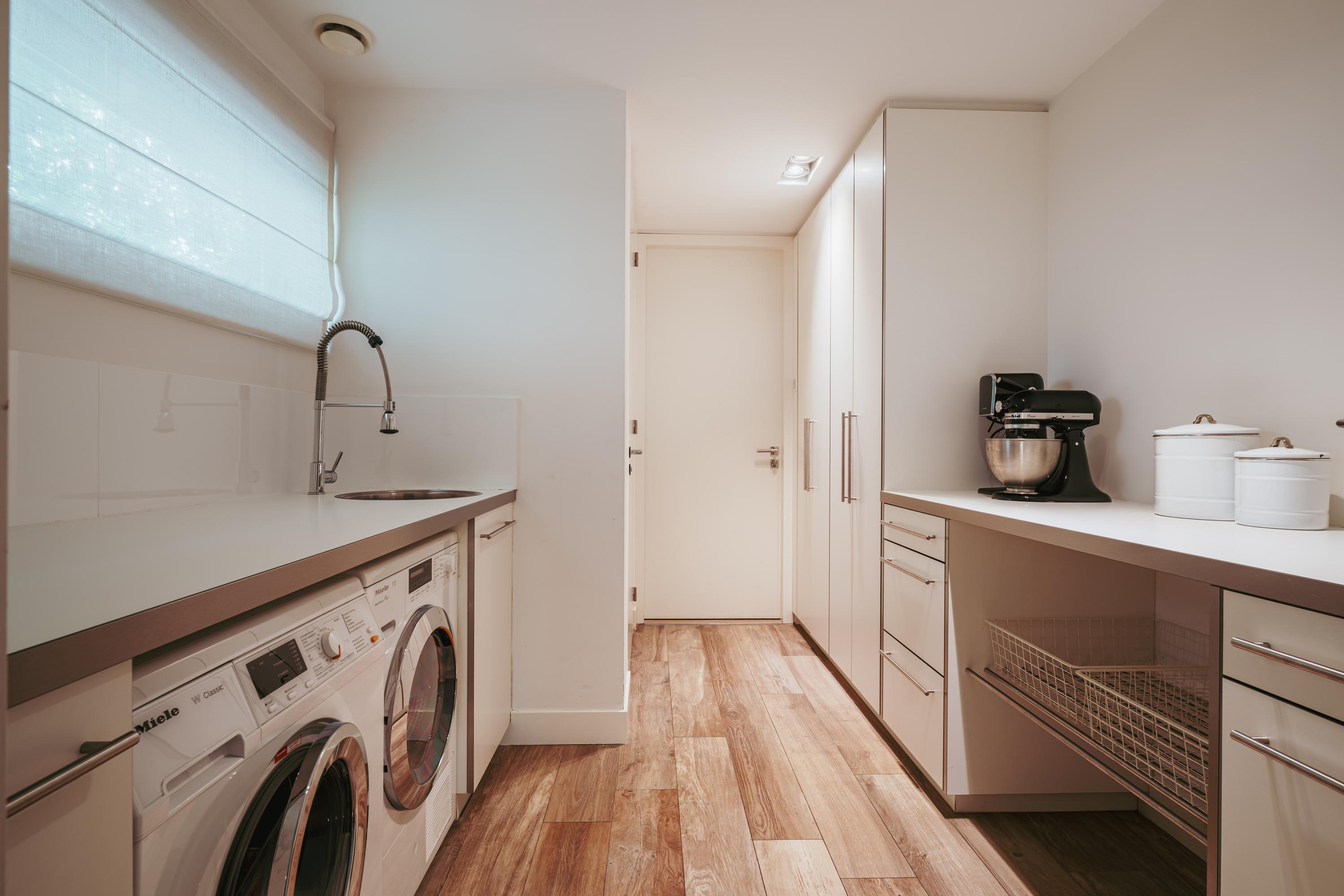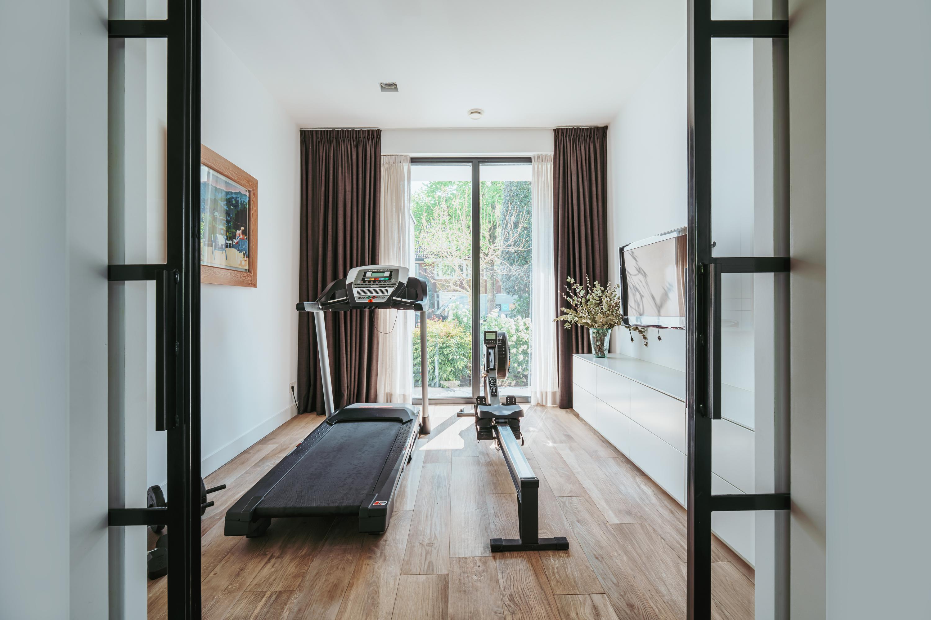 Aangrenzend aan de keuken ligt de bijkeuken met extra opslagruimte, welke doorloopt naar een complete badkamer voorzien van een inloopdouche en wastafel. Vanuit deze ruimte heeft u binnendoor toegang tot de ruime garage, geschikt voor fietsen, berging of werkruimte. Aan de achterzijde van de woning bevindt zich een werkkamer met zicht op de tuin. Aan de rechterzijde ligt een multifunctionele kamer, momenteel ingericht als gym, welke afsluitbaar is middels stalen schuifdeuren.