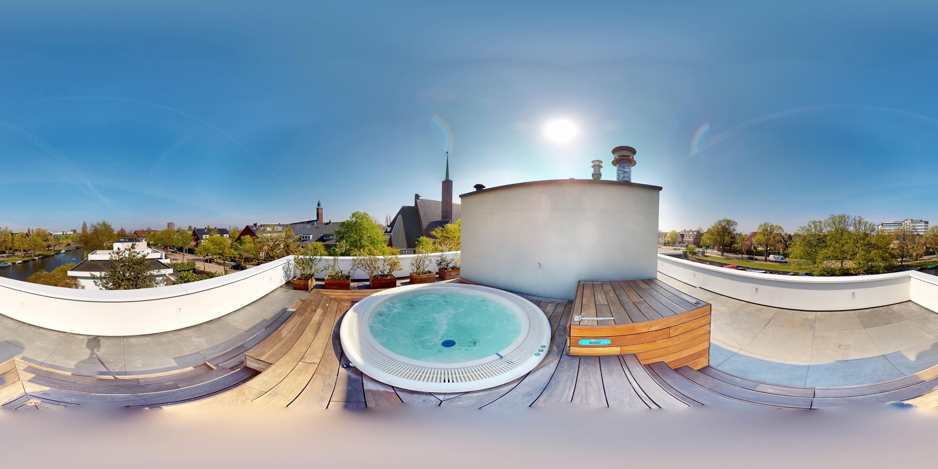 - Groot dakterras van ca. 105 m² met ingebouwde jacuzzi en 360° uitzicht over Amsterdam-Zuid;