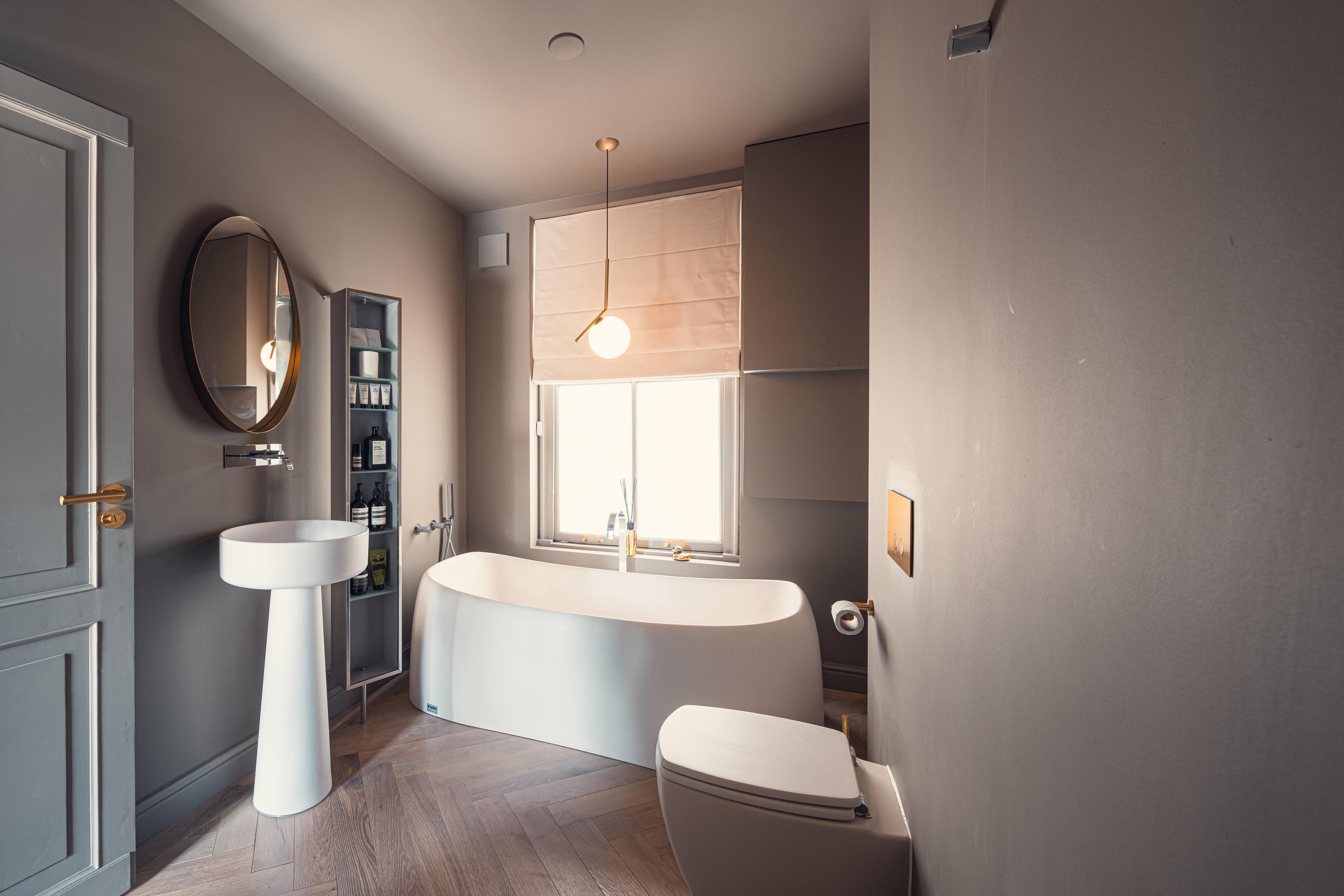 De badkamer heeft een vrijstaand ligbad, een ruime inloopdouche met regendouche, een modern toilet en een stijlvol wastafelmeubel. De zachte tinten, gouden accenten en de zorgvuldig gekozen verlichting zorgen samen voor een luxueuze hotelsfeer.