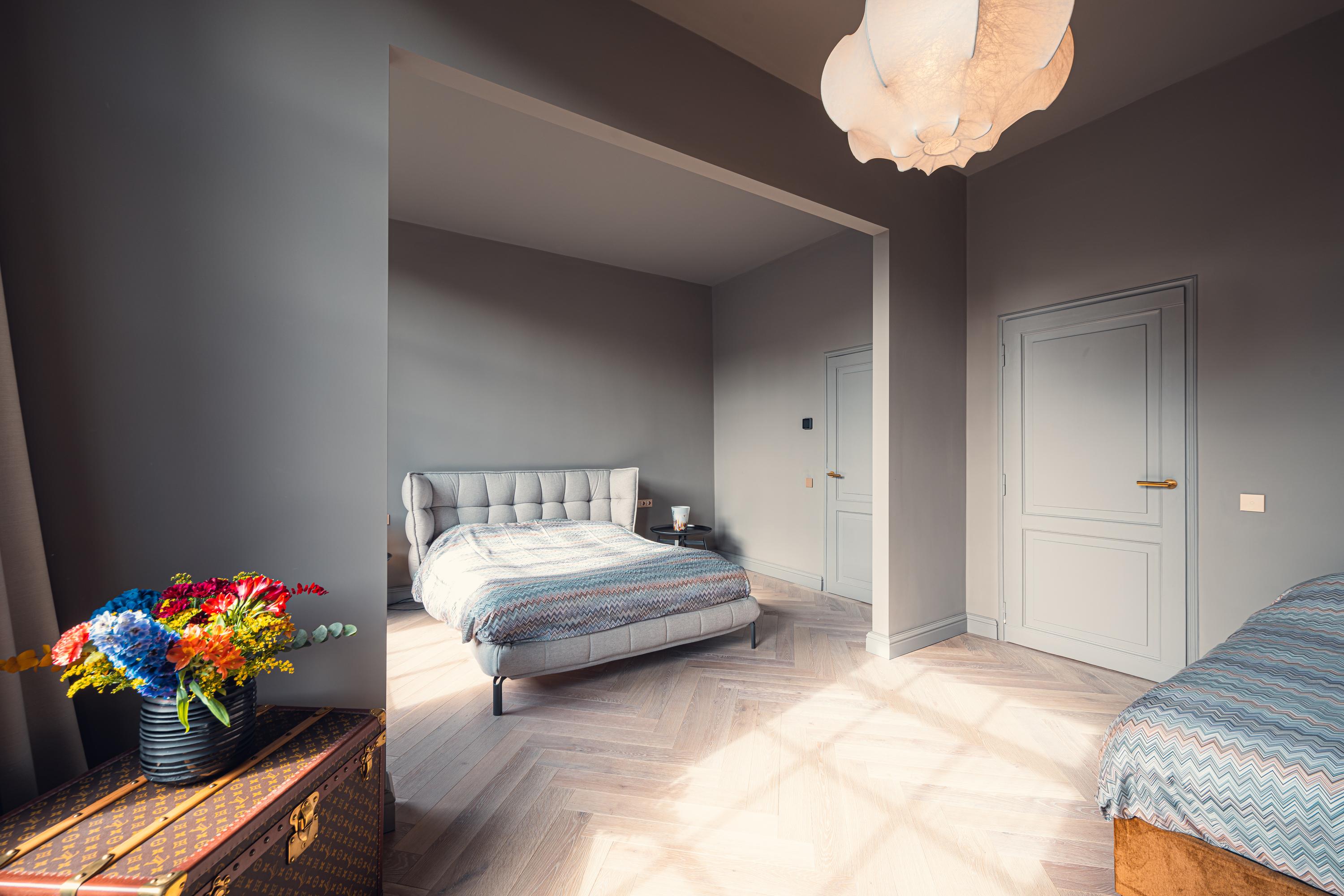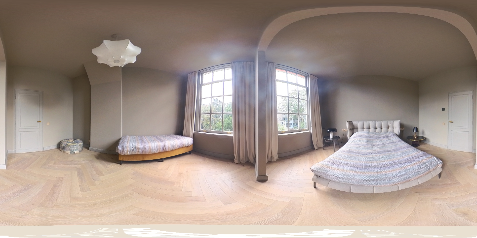 De slaapkamer is royaal opgezet en heeft grote ramen die zorgen voor veel daglicht. In de huidige indeling is de tussenmuur doorgebroken, waardoor er een ruime, open kamer is ontstaan met plaats voor een tweepersoonsbed en een logeerbed. Indien gewenst kan de oorspronkelijke indeling eenvoudig worden hersteld, zodat er weer twee aparte slaapkamers beschikbaar zijn.