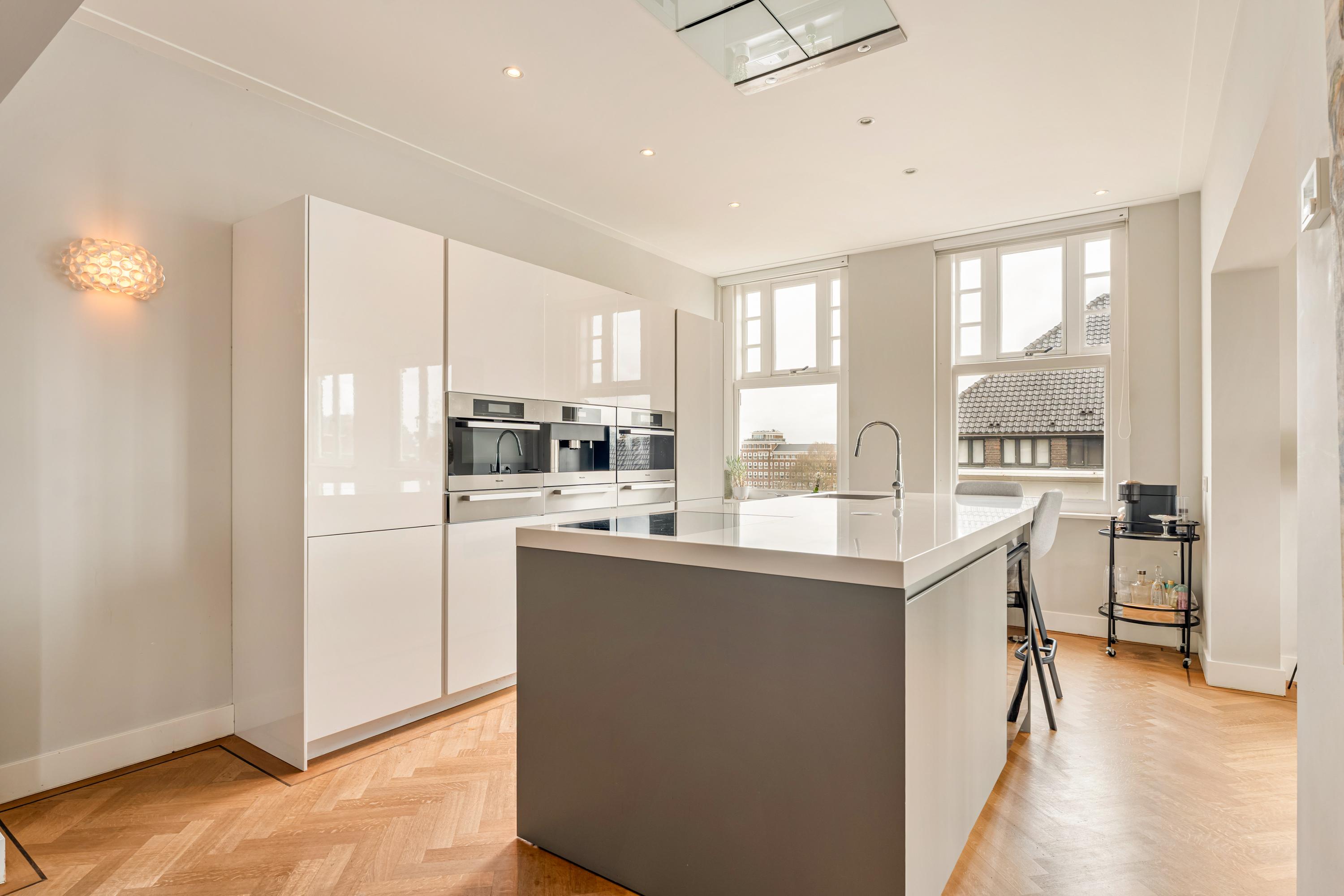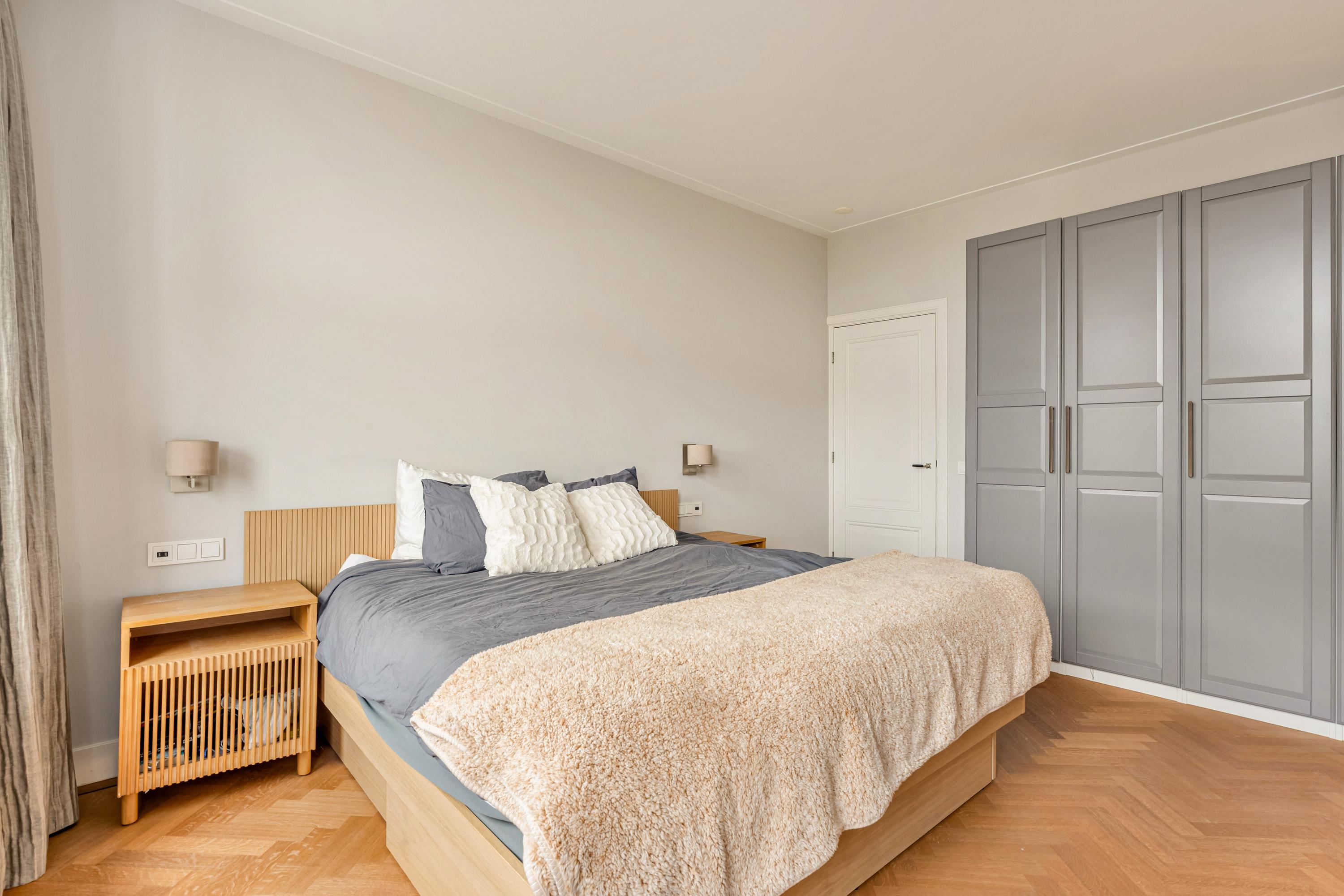Het appartement is afgewerkt met een fraaie houten visgraatvloer en alle kozijnen zijn vernieuwd en uitgevoerd in hardhout met HR++ beglazing, waarbij het karakteristieke schuifraamsysteem is behouden en gemoderniseerd.