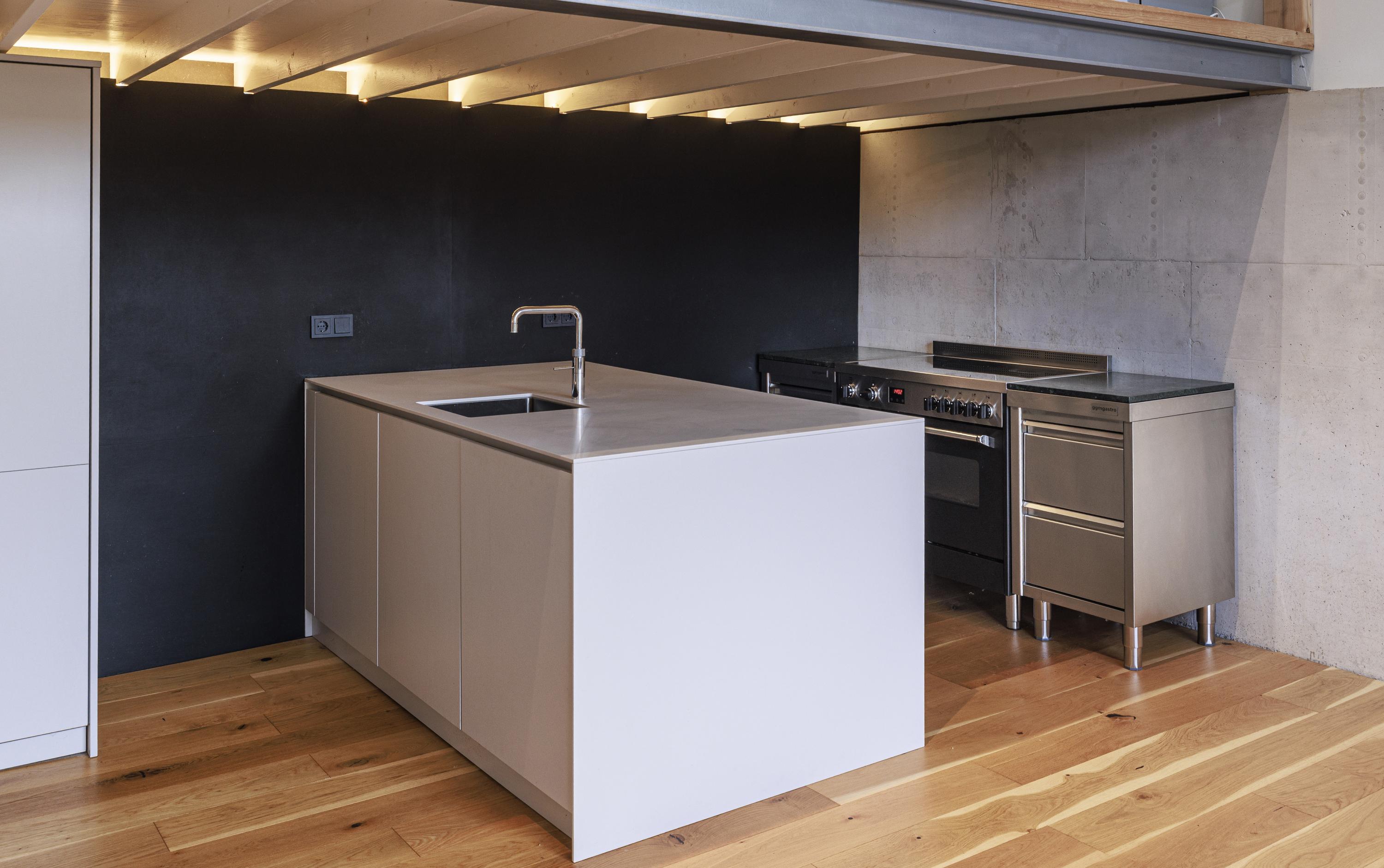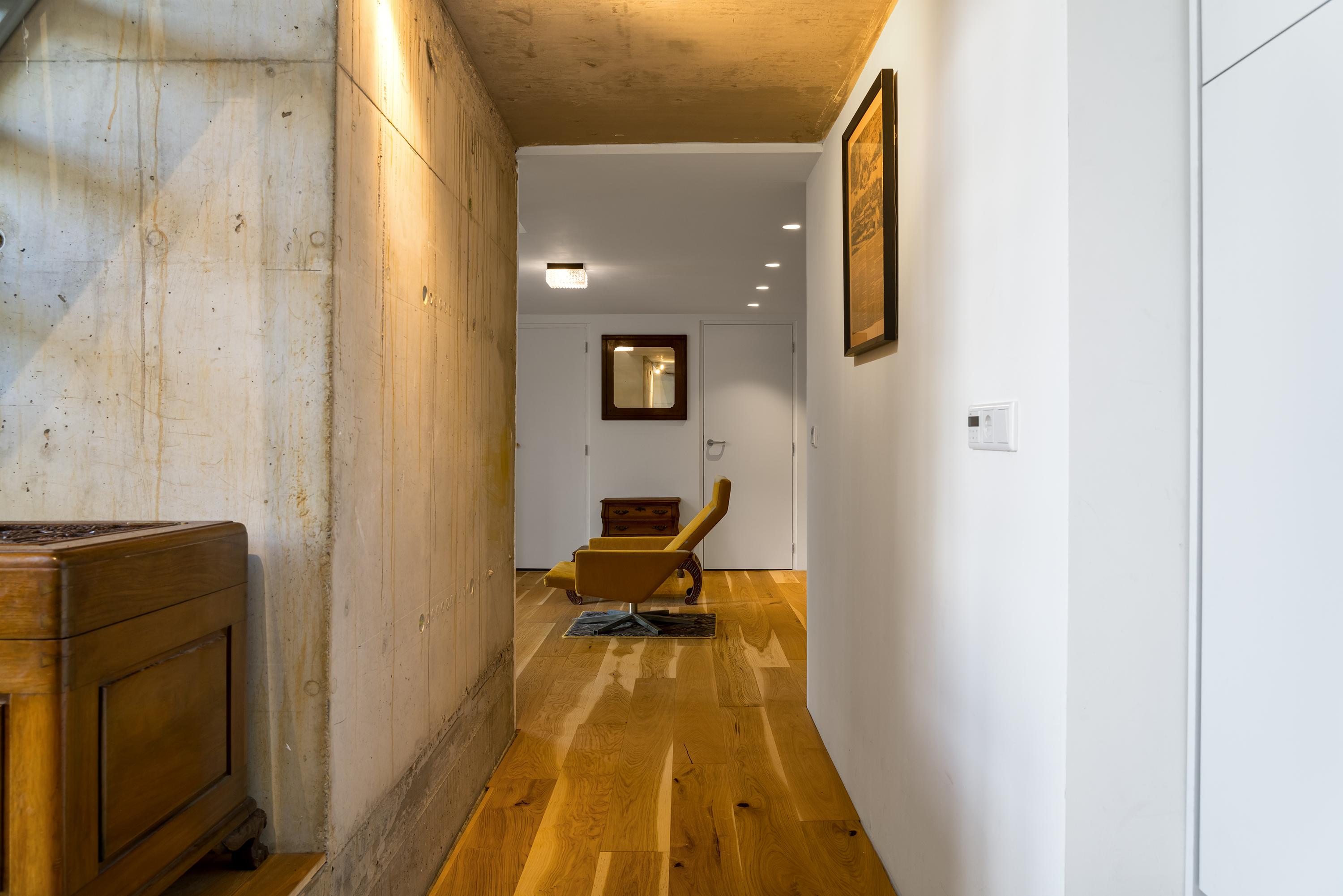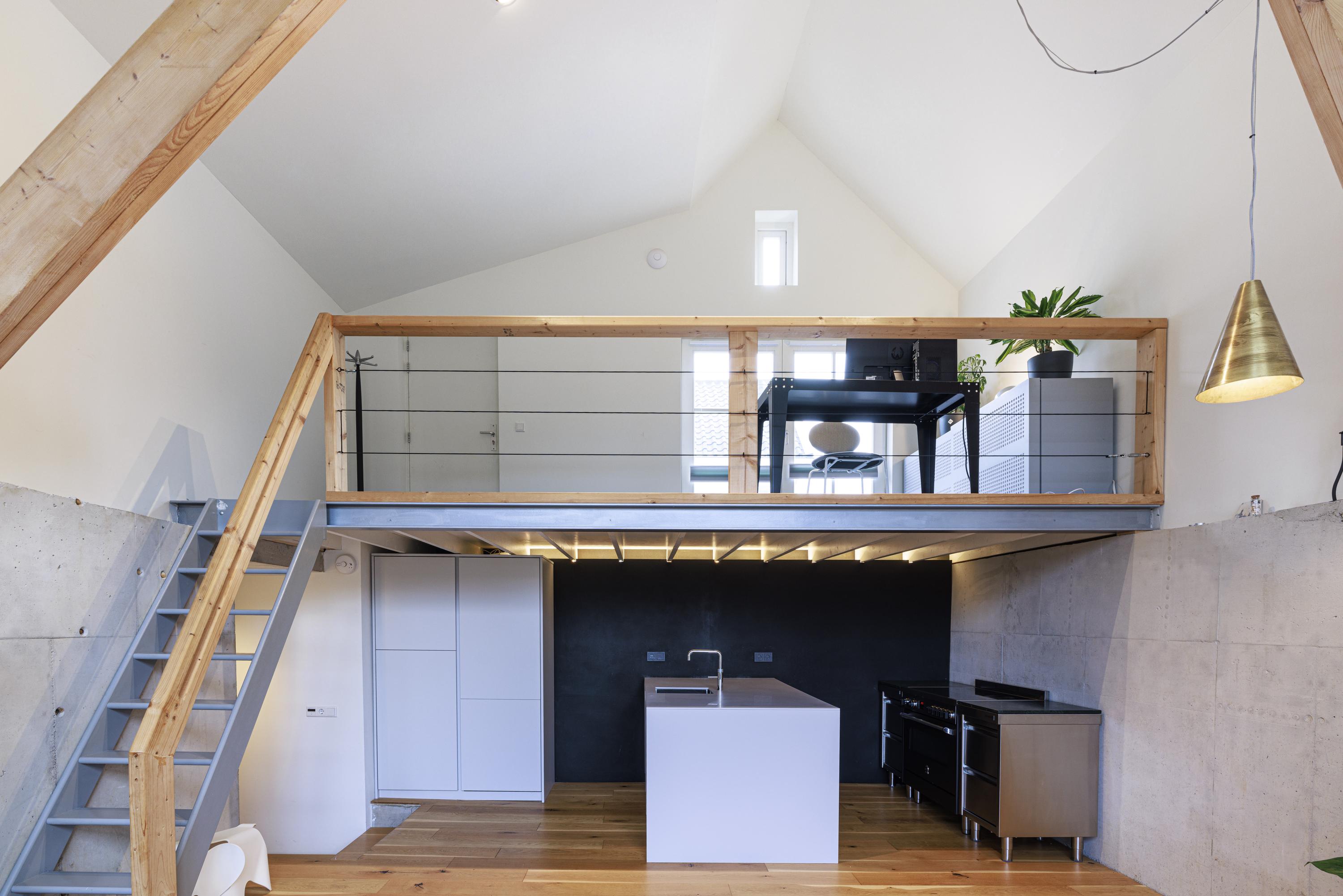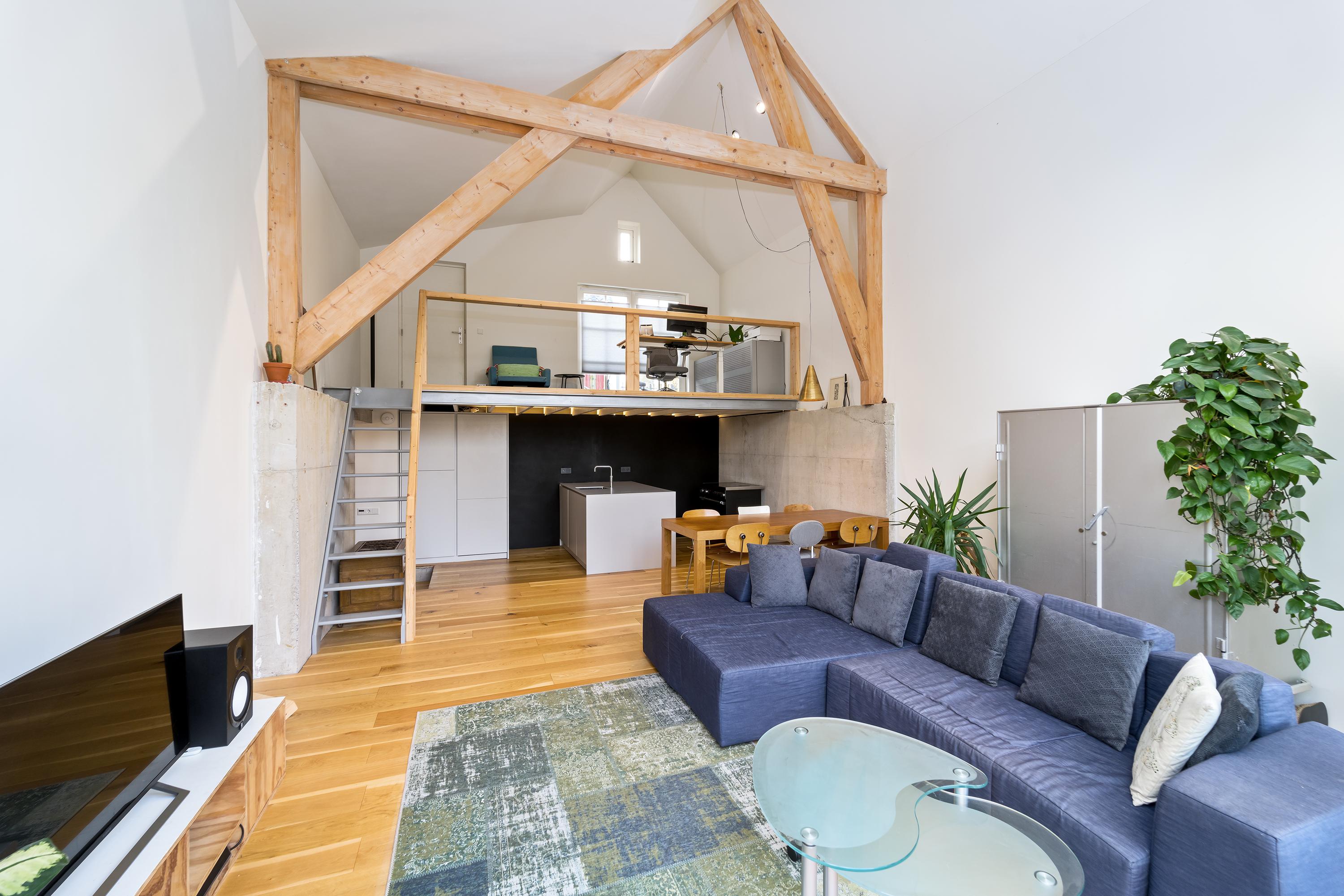 Ook binnen is deze woning een ware blikvanger. Bij de nieuwbouw en verbouwing is gekozen voor een spannende combinatie van oude en moderne materialen. Denk aan robuuste houten constructiebalken, ruw beton, eikenhouten vloerdelen, klassieke ledenradiatoren en een stoere stalen wenteltrap. De afwerking is hoogwaardig en met oog voor detail uitgevoerd. Wat direct opvalt, is de indrukwekkende ruimtelijke beleving. De superhoge living vormt het hart van het huis en beschikt over een vide met open kantoorruimte. Onder de vide bevindt zich een op maat gemaakte keuken. Dankzij de enorme glazen pui geniet je op de vide én in de woonkamer van een zee aan daglicht en een prachtig zicht op de tuin en het terras.
