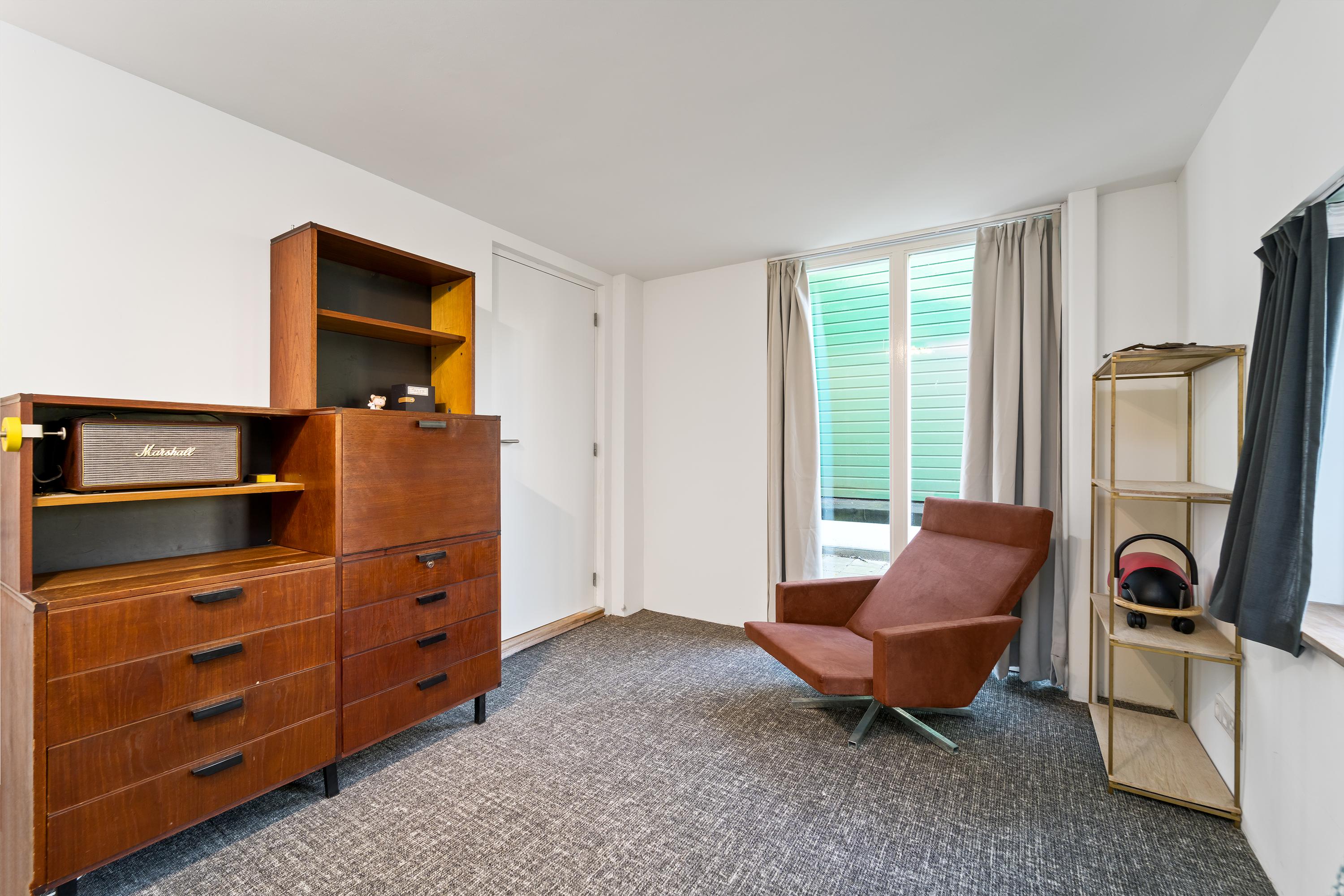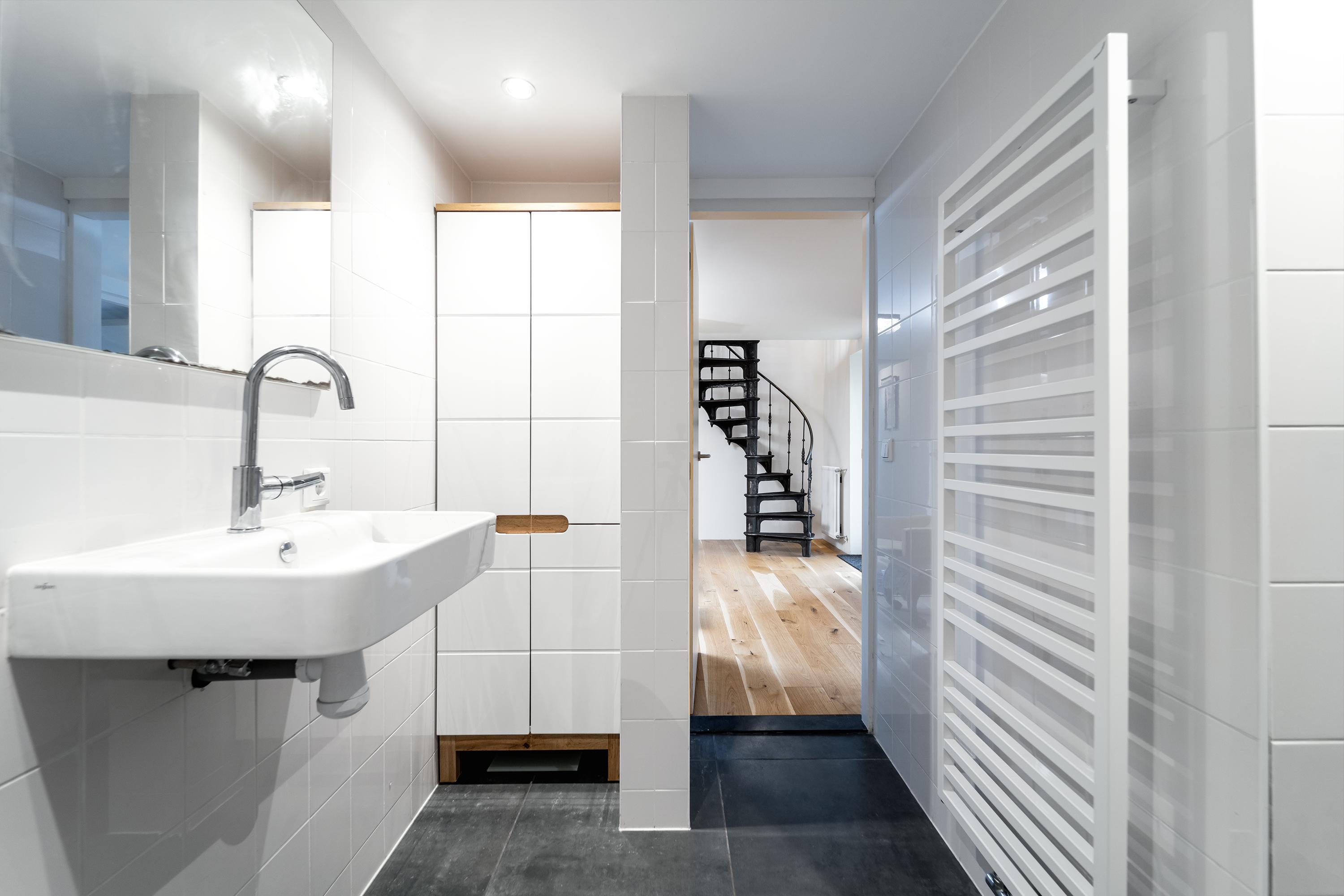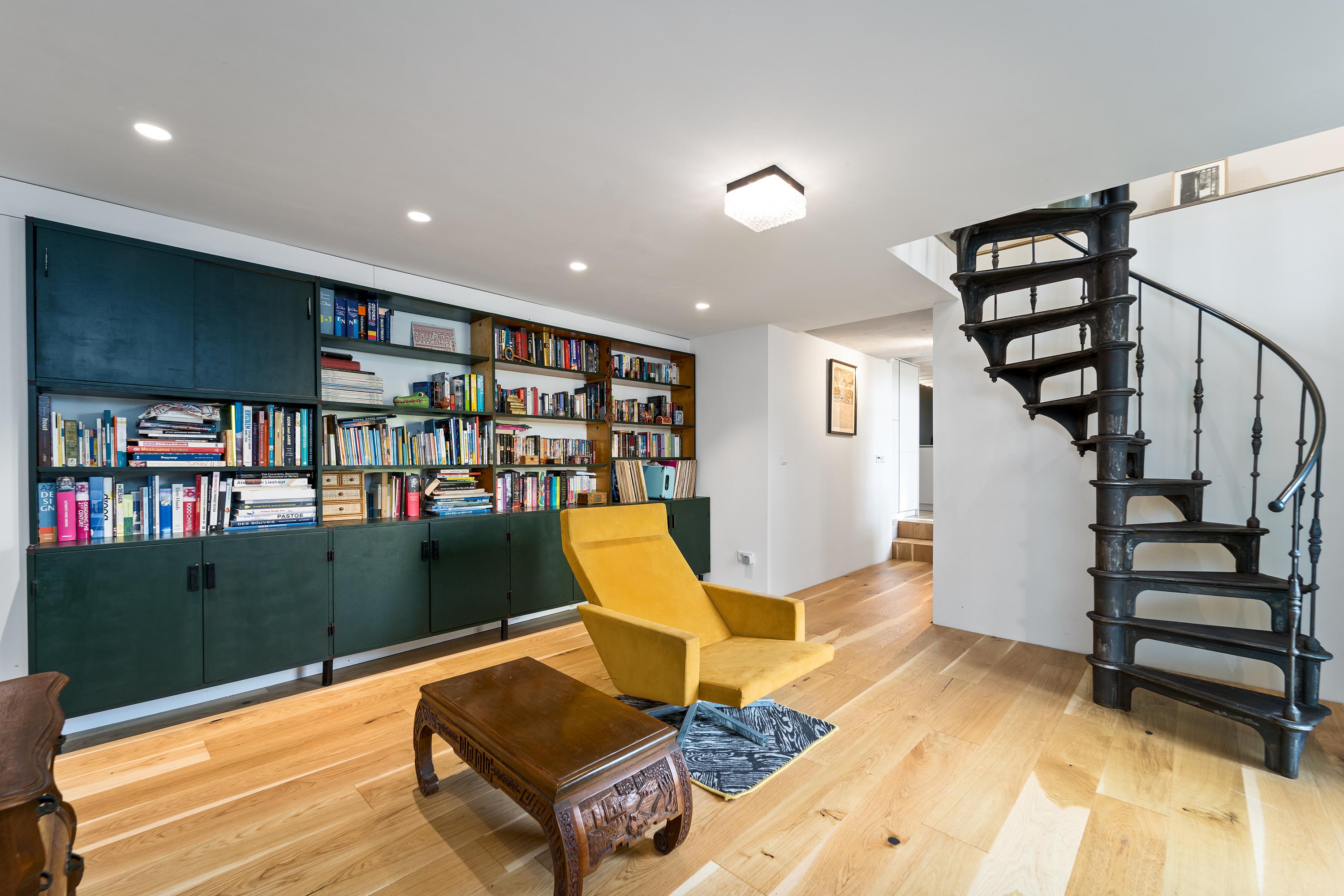 Royale living, open keuken, bibliotheek, toilet, wasruimte, badkamer (inloopdouche en wastafel) en een slaapkamer.