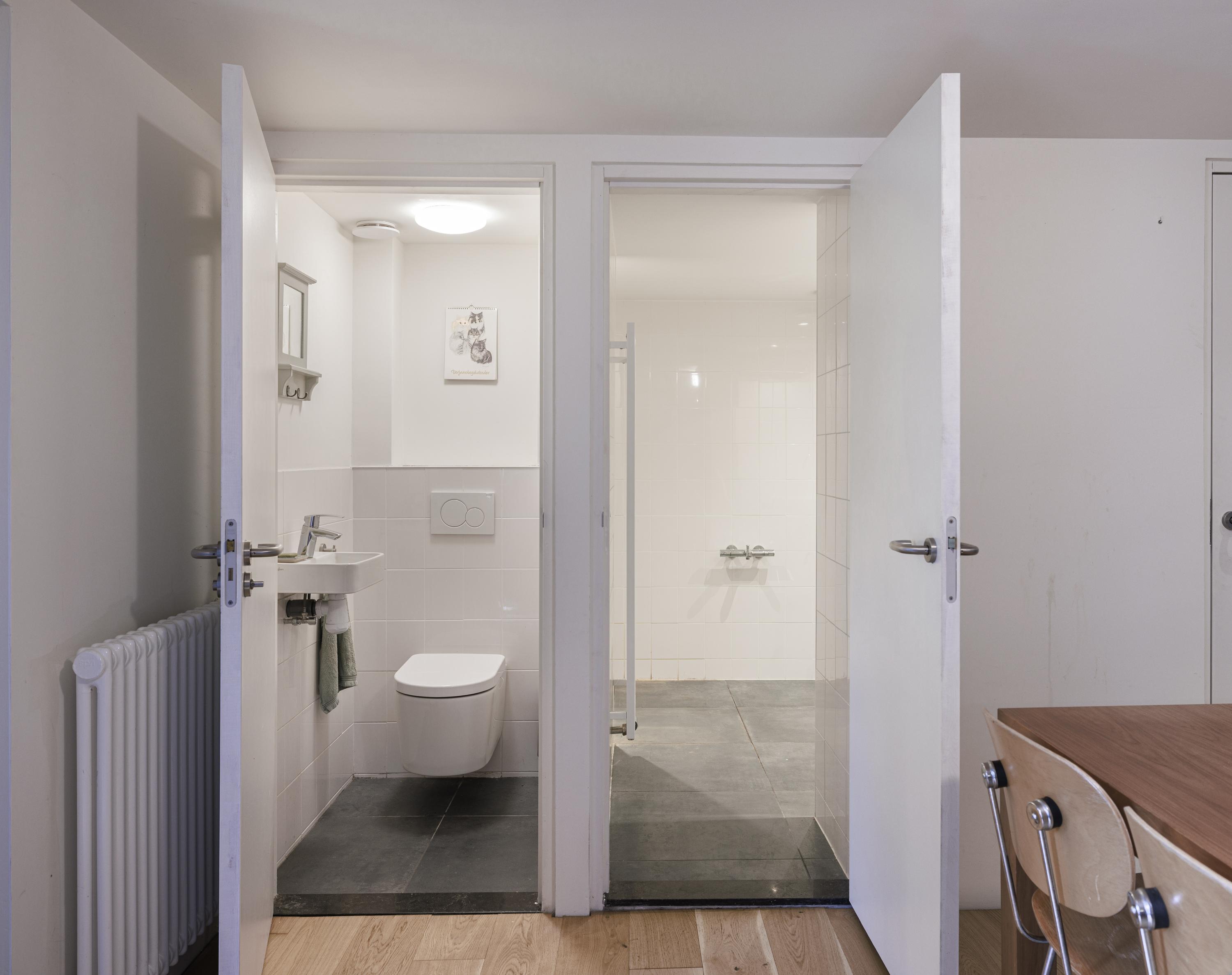 Stenen dijkhuis: entree, hal, toilet, trap met trapkast naar de eerste verdieping, wenteltrap naar het tuinniveau, twee slaapkamers en tweede badkamer (inloopdouche en wastafel).