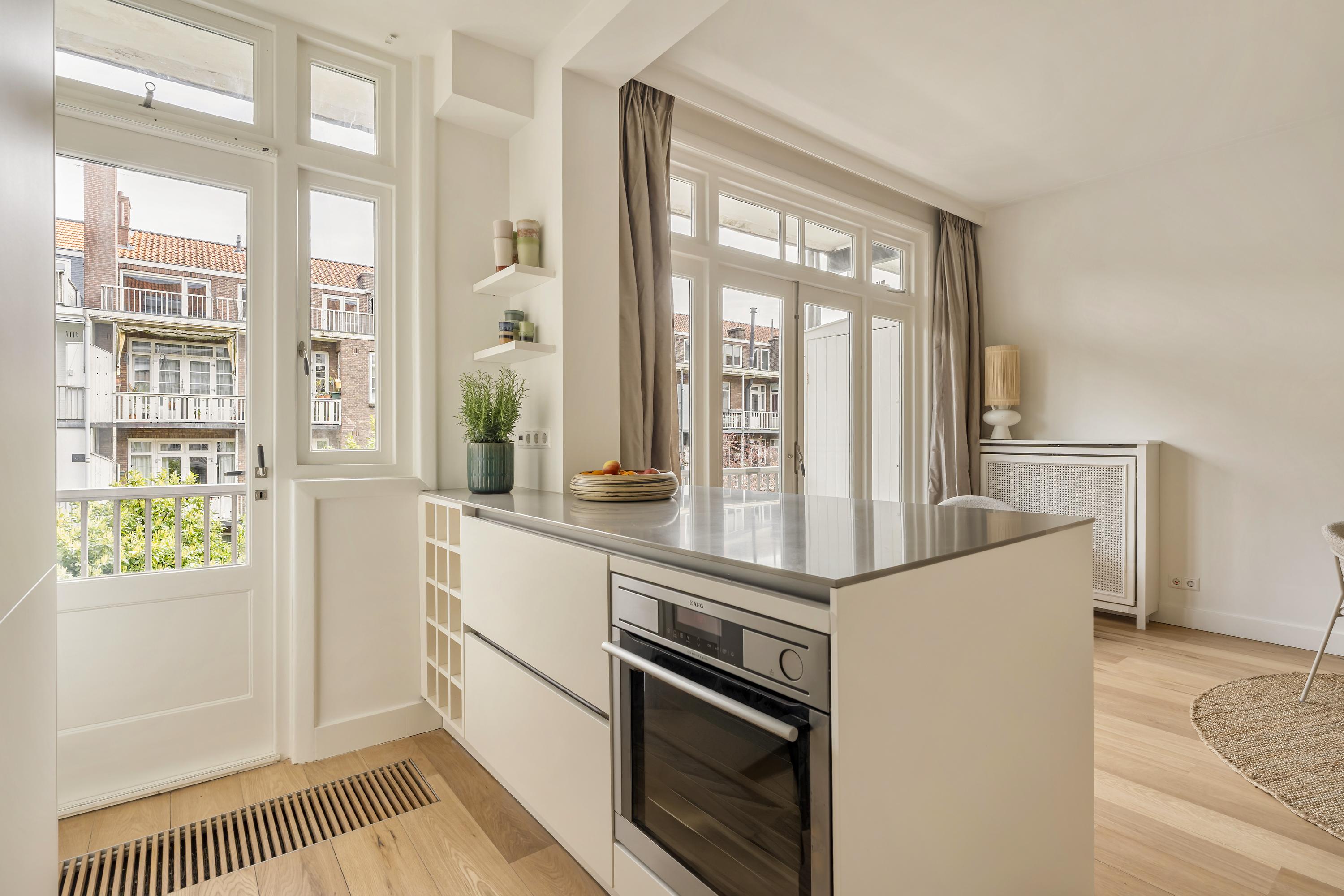 De keuken is uitgevoerd in een tijdloze opstelling en voorzien van diverse inbouwapparatuur, waaronder een 5-pits gasfornuis, oven met stoomfunctie, Quooker, vaatwasser en een koel-/vriescombinatie. Daarnaast is er veel opbergruimte aanwezig. Vanuit zowel de keuken als de eetkamer is middels openslaande deuren toegang tot het balkon aan de achterzijde.