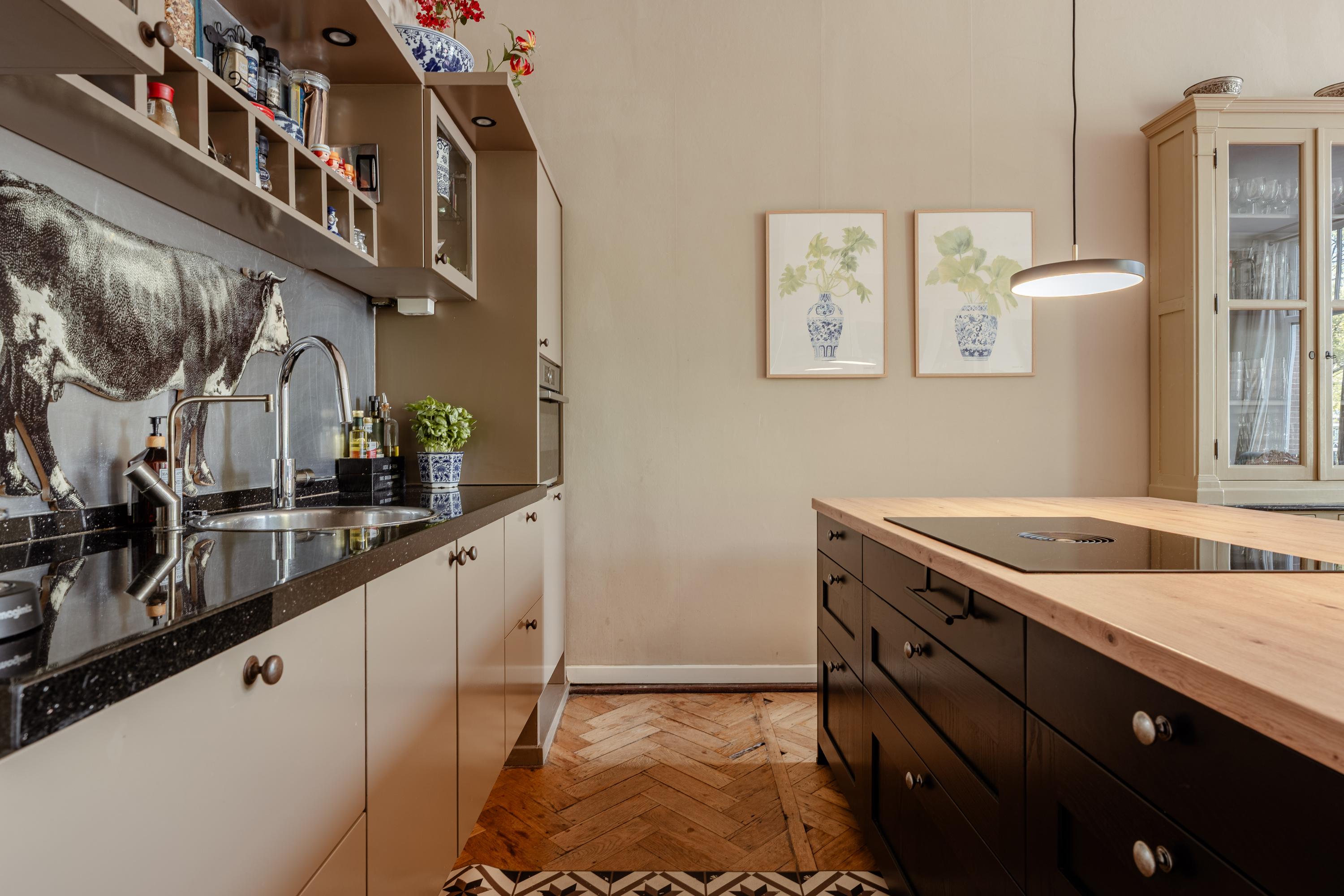 Aan de voorzijde ligt de royale woonkamer met hoge plafonds en grote ramen, waardoor de ruimte bijzonder licht is en een prachtig uitzicht biedt over de gracht. De woonkamer heeft voldoende plek voor zowel een zit- als eethoek en vormt samen met de aangrenzende open keuken het hart van de woning. De keuken is uitgerust met een centraal kookeiland en diverse inbouwapparatuur, ideaal om uitgebreid te koken en gezellig te tafelen.