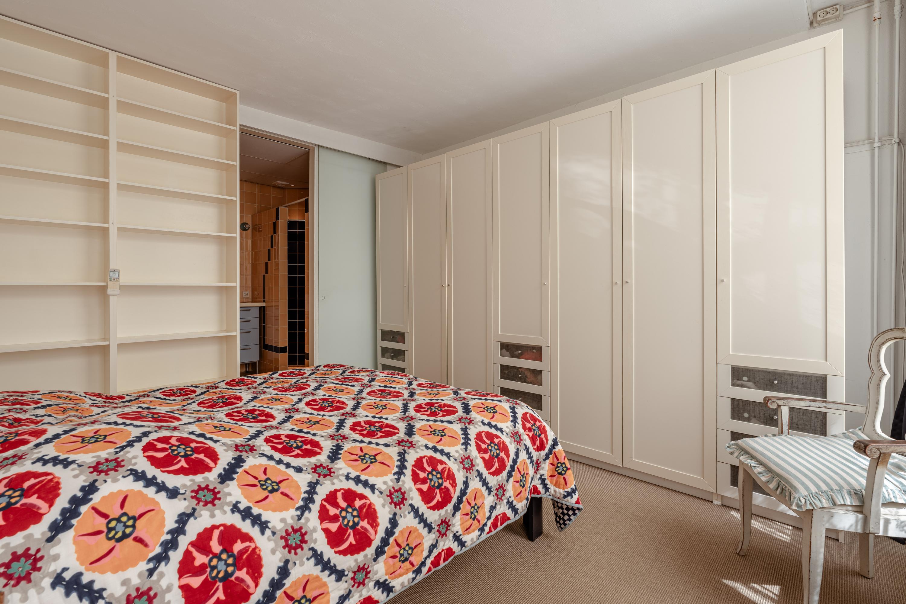 Aan de achterzijde ligt nog een royale slaapkamer met ingebouwde kasten en een eigen keukentje, inclusief aansluitingen voor wasmachine en droger. Door de brede ramen is dit een lichte en zelfstandige ruimte, die zich uitstekend leent als studio of werkkamer.