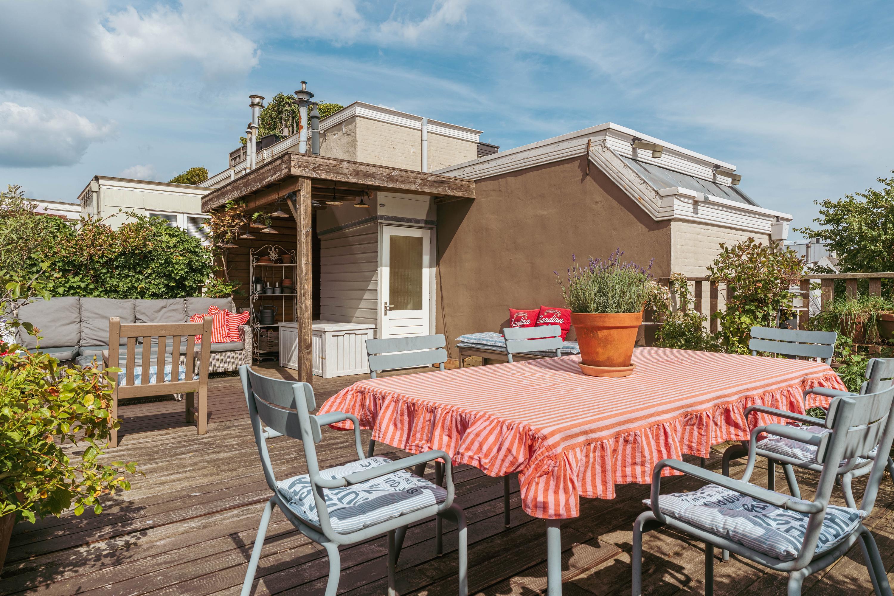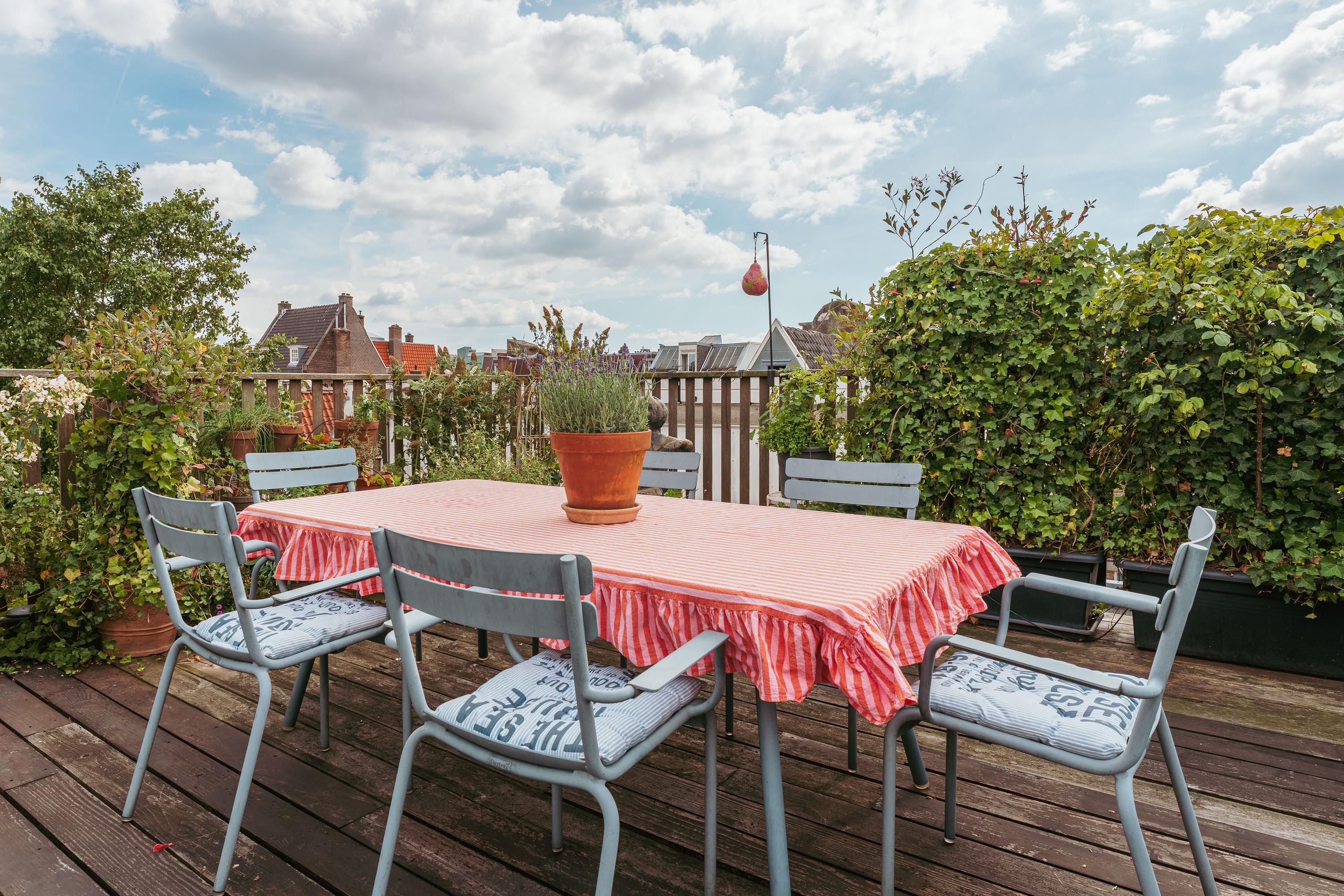 Dankzij de royale afmetingen is er volop ruimte voor meerdere zit- en eethoeken, ideaal om te ontspannen of gasten te ontvangen. Bovendien is er een overkapt gedeelte waardoor u ook op minder zonnige dagen comfortabel buiten kunt zitten. Vanaf hier heeft u een prachtig uitzicht over de historische daken van de Amsterdamse binnenstad.